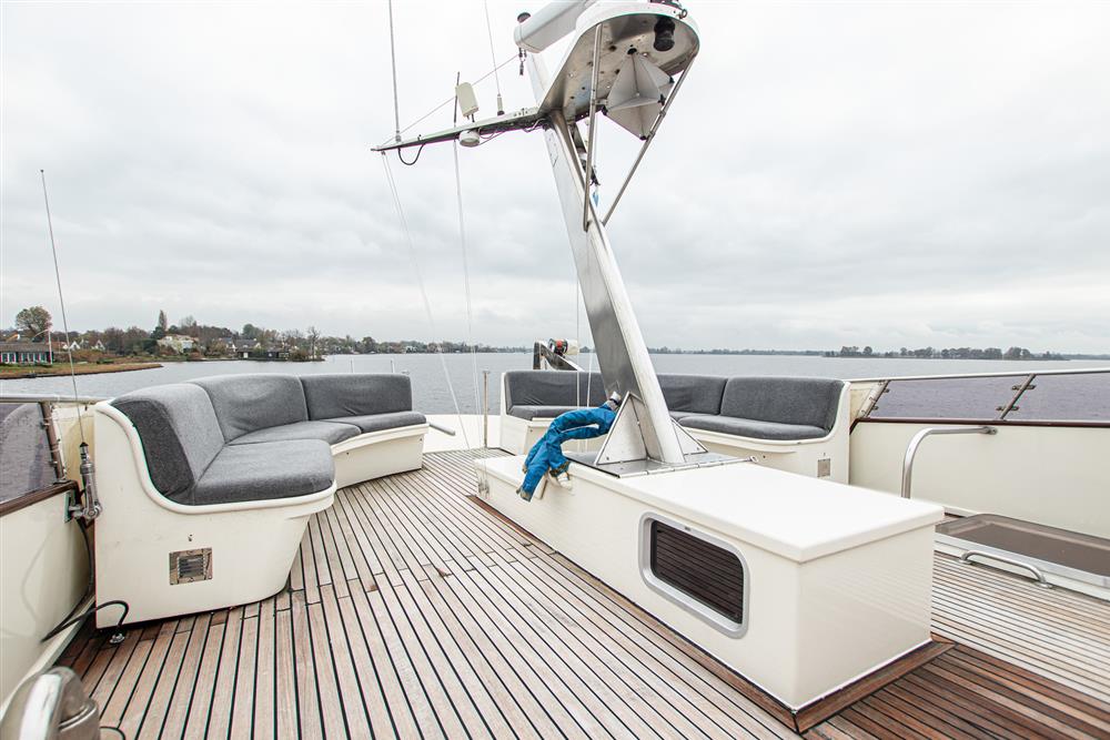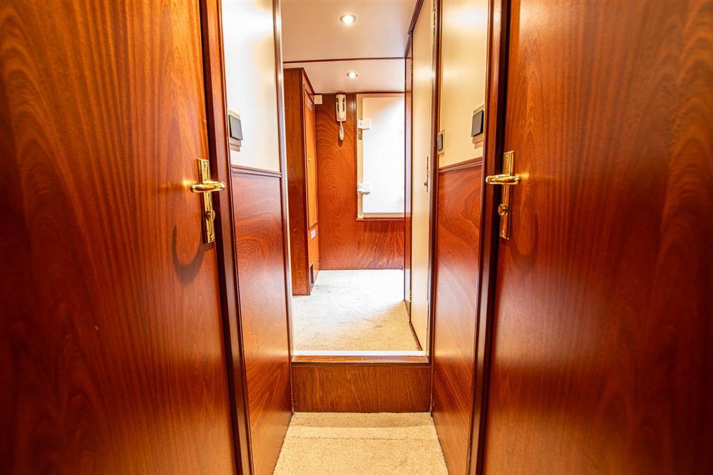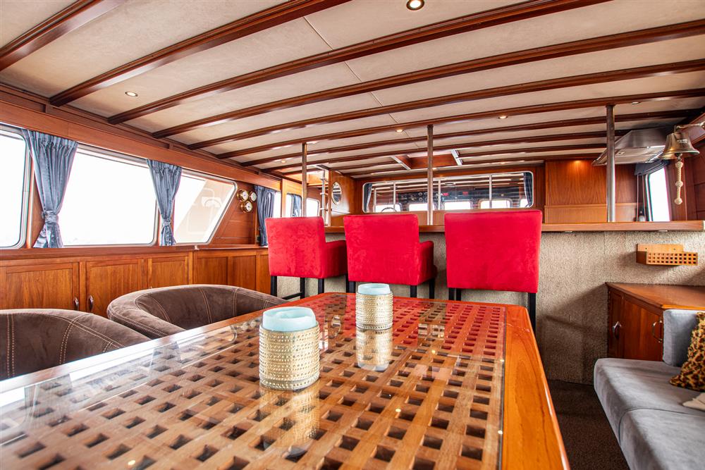 Inside the main guest space she has a large owners cabin with ensuite heads and separate ensuite shower. There are two large guest cabins also with ensuite heads and showers. All cabins have plenty of hanging stowage and storage space making her feel like a home from home. There is separate crew accommodation with three berths and ensuite heads/shower. On the aft deck, there is a large covered seating area with heaters, ideal for entertaining outside in any weather. To port you will find access to the vast saloon and galley with a beautiful open seating area and bar. The galley is behind the bar and is well-equipped with modern equipment to serve all of your guests. The versatile galley and saloon can function well in charter or liveaboard situations, there is ample cold storage for extended periods on board. Two Webasto air conditioning units service the cabins, she is well equipped for almost all environments. She holds approximately 2200 litres of fresh water and has approximately 1000 litres of black water tankage.