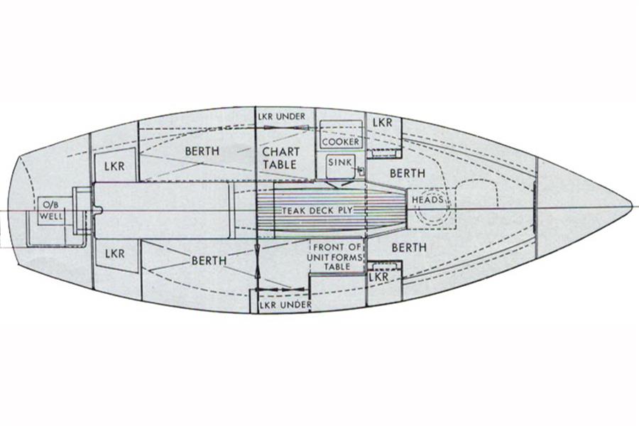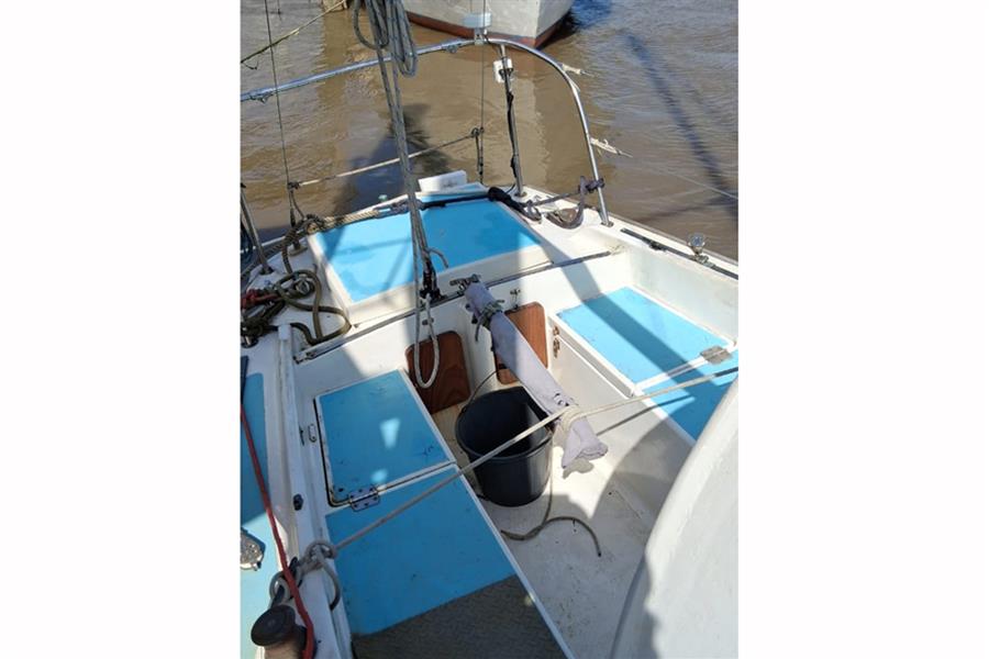 Tohatsu 4hp, two-stroke petrol outboard located in a well aft of the cockpit. Recoil start. Integral fuel tank. Engine has been unused for 10 years but was running well & flushed though before being laid up.