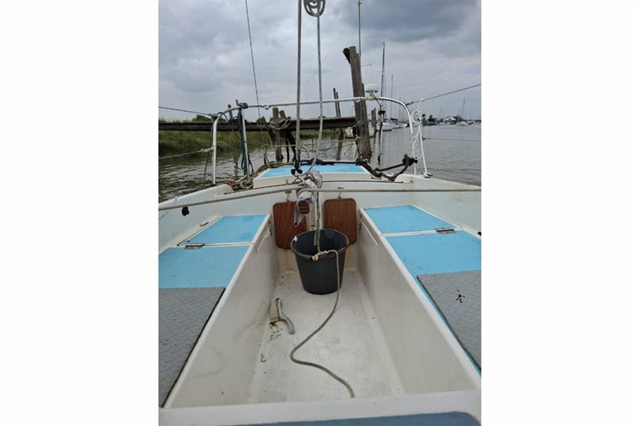 Hurley 22 built by Hurley Marine in about 1972. White GRP hull and decks with light blue painted non-slip surfaces. Cast iron fin keel. Tiller steering to skeg hung rudder. Aft self-draining cockpit. Stainless steel pulpit and pushpit. Timber handrails on coachroof.