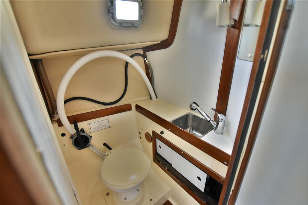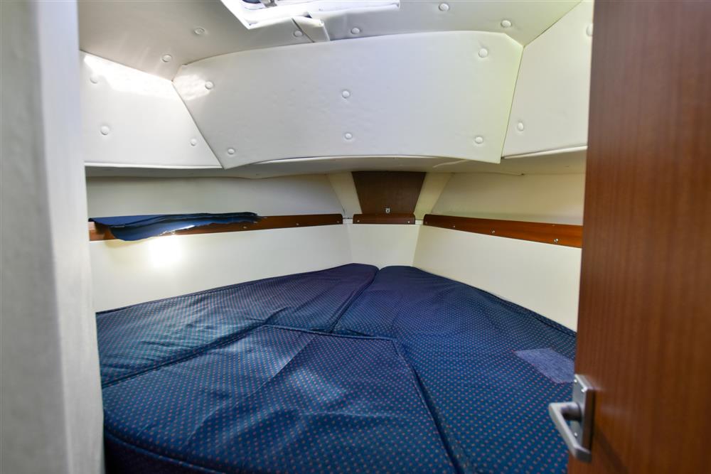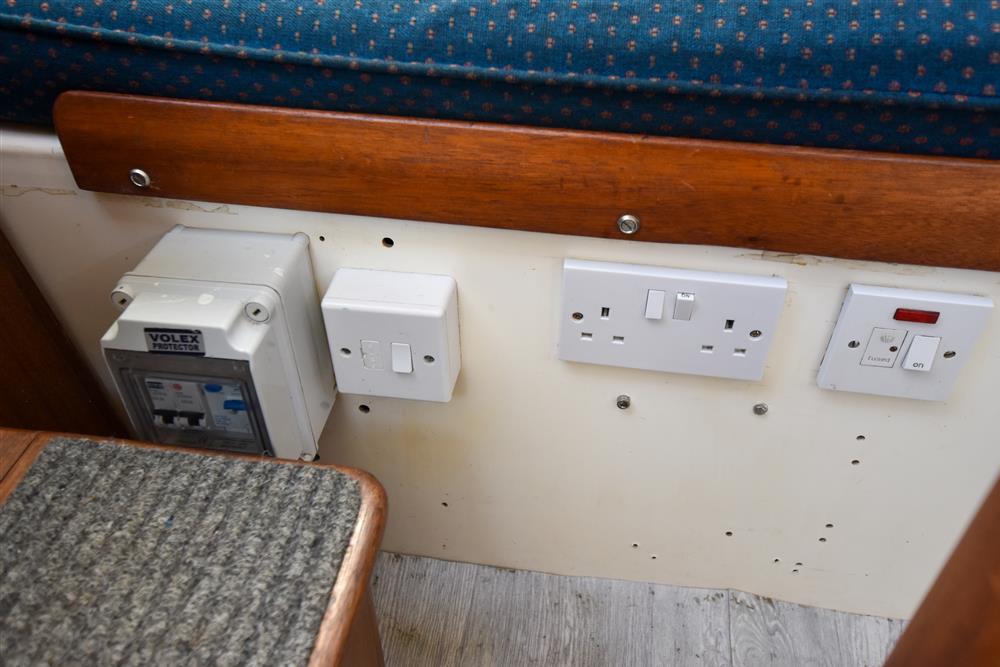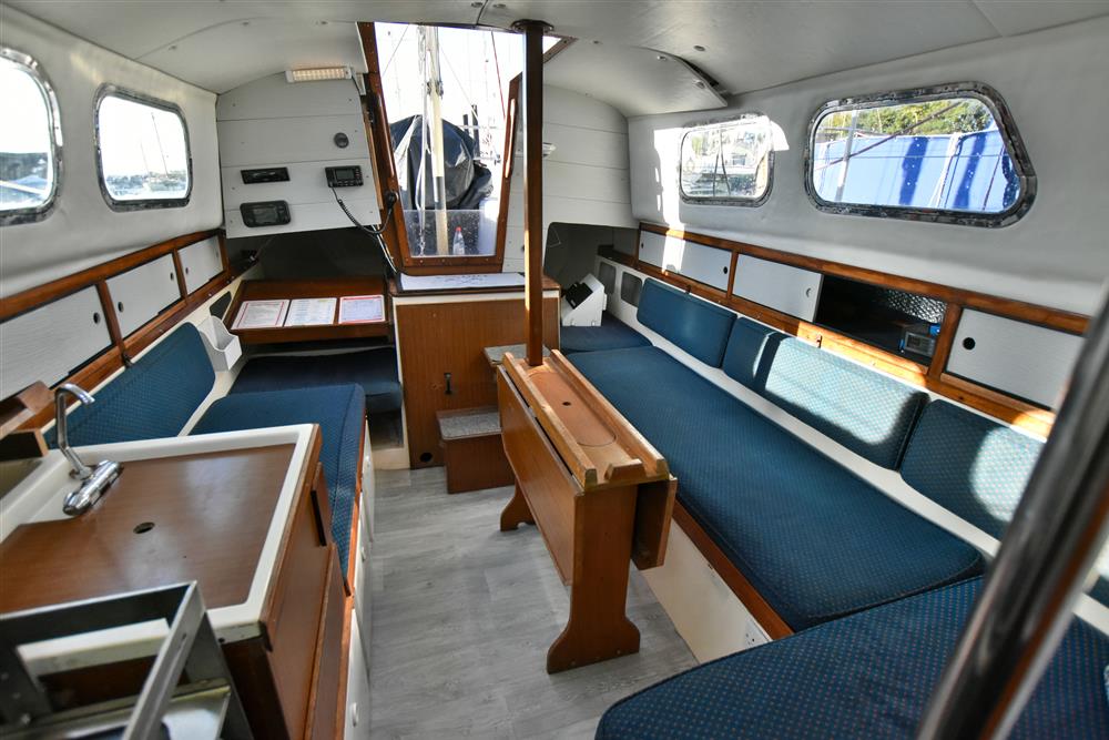The accommodation offers up to 6 berths in two cabins. Up forward there is a large V-berth, with an infill. Stowage above and below. Opening hatch to foredeck. Hanging locker to starboard. The heads compartment is to port with a manual marine toilet, washbasin and shower with a pressurised hot & cold water supply and storage under. Opposite to starboard, there is a large hanging locker. Moving aft into the saloon, there is a L shaped with dinette to port, with storage under and outboard. Table drops down to make a double berth. The galley is opposite to starboard, with a Flavel Vanessa two burner cooker with grill and oven. Stainless steel sink with a pressurised hot & cold water supply. Cool box. Generous storage under and above. There are quarter berths to port and starboard with a sliding chart table over to starboard. Blue upholstery throughout. CD/Radio with speakers.