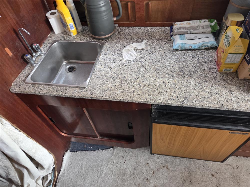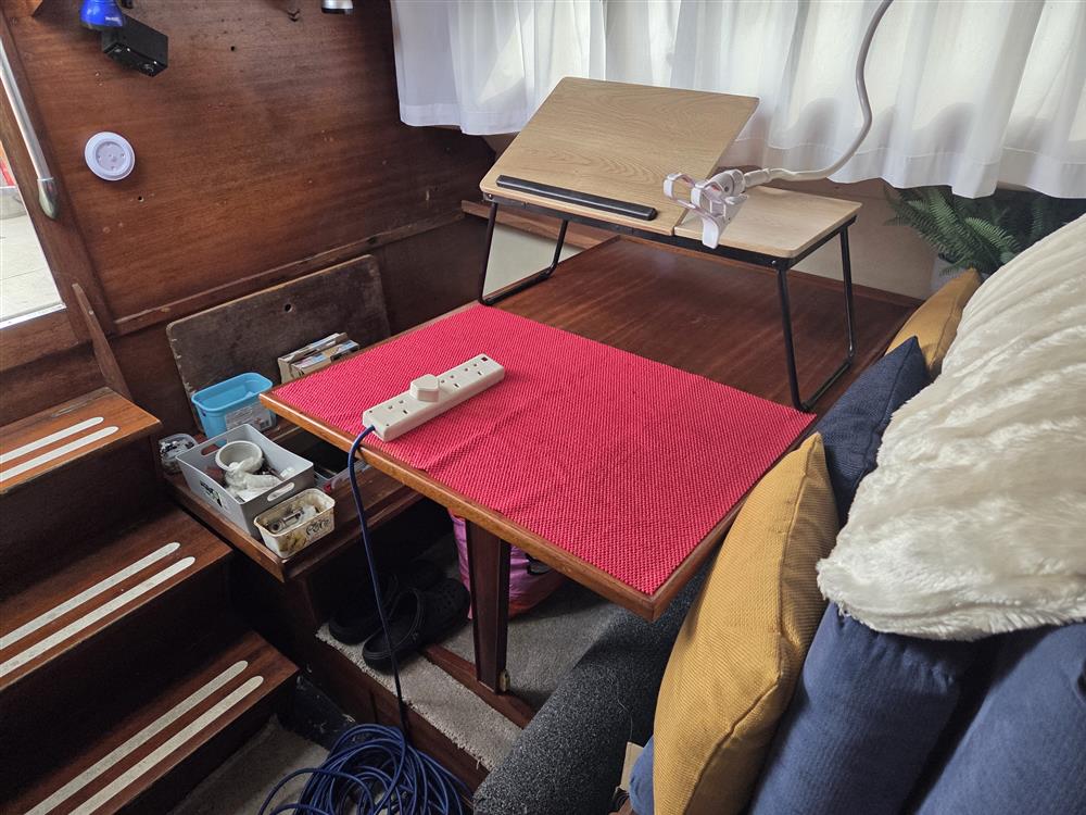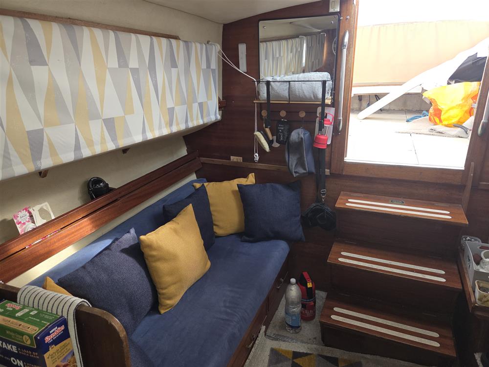 The accommodation offers up to five berths in two cabins with over 6? max. headroom. Forward cabin with double berth, hanging locker, deck hatch and access door to heads compartment. Heads compartment to port with Thetford chemical toilet and wash basin. Heads accessed from forward cabin and saloon. Helm station forward to port. Linear galley to starboard with two burner gas stove (new & not yet fitted), stainless steel sink and upright fridge. Settee berth to starboard aft of galley with dinette opposite. Dinette converts to double berth. Large aft cockpit with the two engines located below.