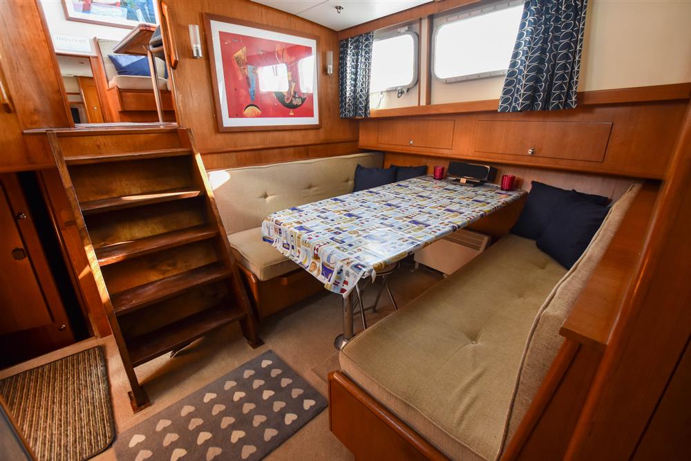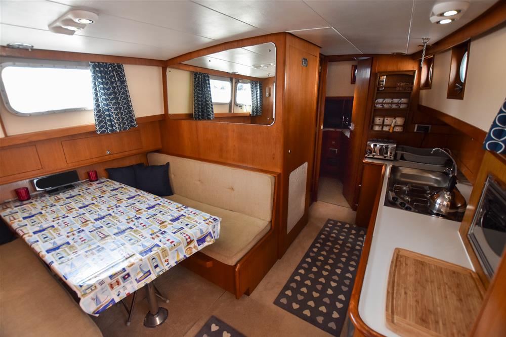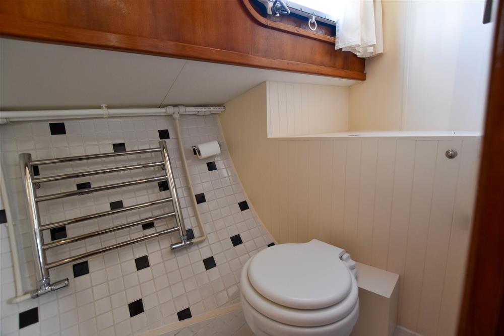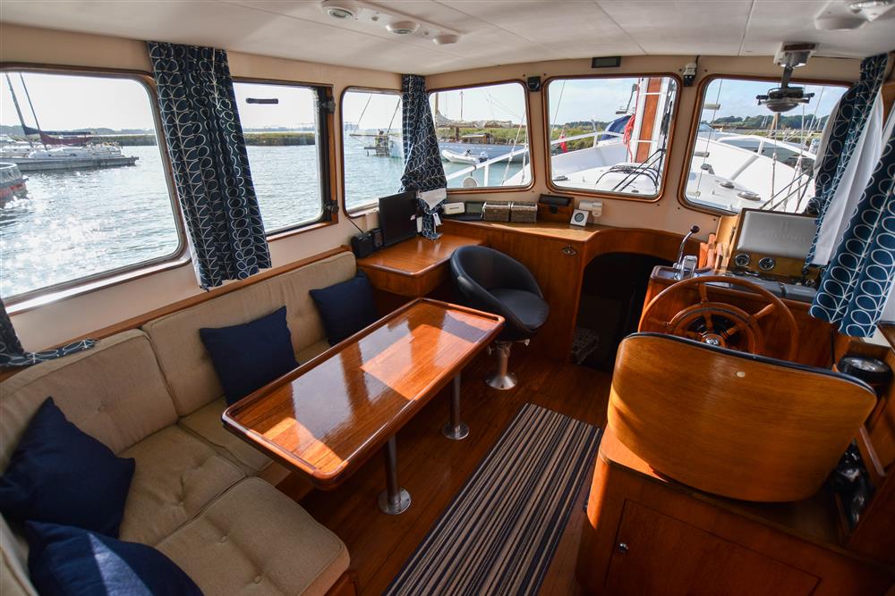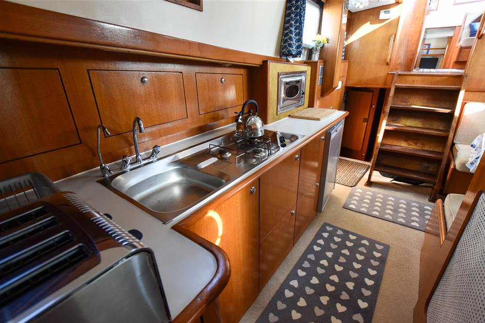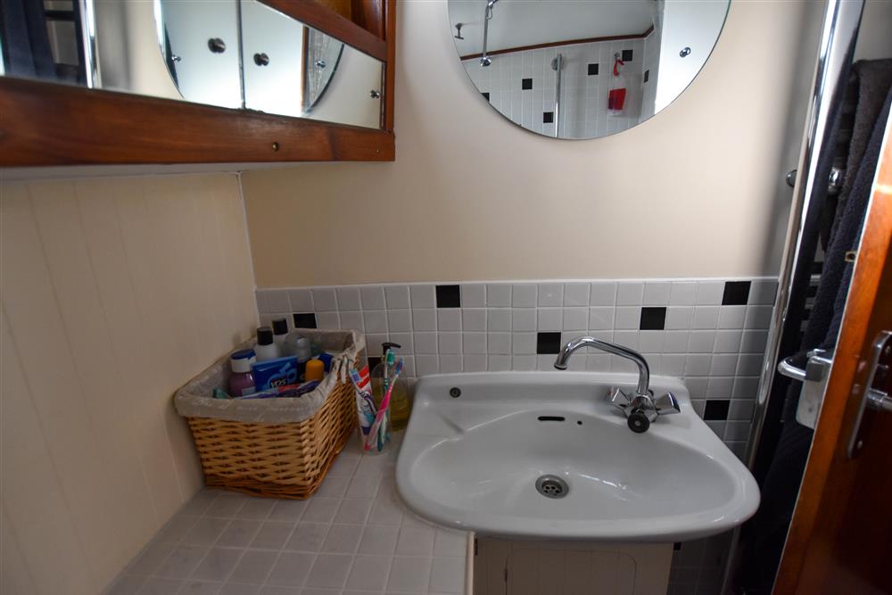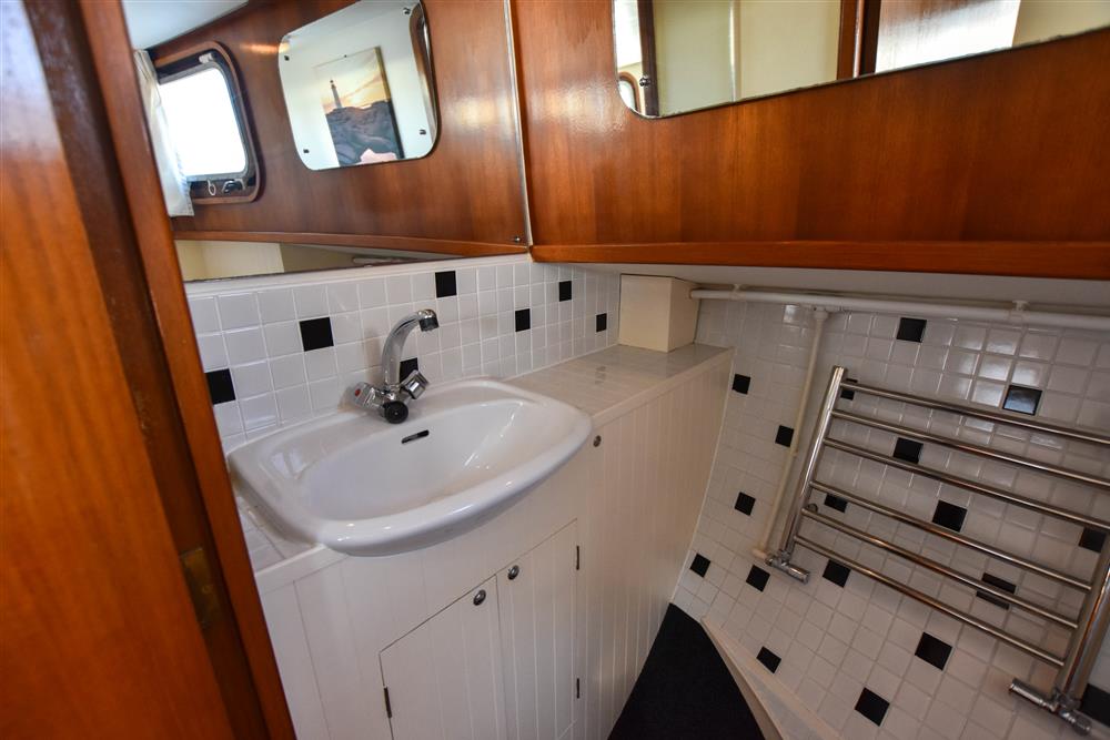 Offering up to six berths in a high quality interior of varnish teak, with plenty of ventilation and natural light. Up forward there is a large V berth, with plenty of stowage underneath. Moving aft there is a separate heads compartment to port which is beautifully tiled and ventilated with opening portholes. Electric Lavac toilet with a 25 litre holding tank, ceramic basin and shower with shower pump out. The large linear galley runs along the starboard side with plenty of stowage space. Stainless steel sink with a pressurised hot & cold water supply, as well as a filtered water tap. Three burner gas hob and a separate Dometic gas oven with grill. Front opening Waeco 130 litre refrigerator. Microwave. Leading aft from the galley, there are two hanging drying cupboards, electrical distribution cupboard and access in to the engine room. Opposite to port is the expansive dinette that can comfortably sit 6 people. The table drops down to convert in to a double berth, with storage lockers underneath. Stepping up into the wheelhouse, the helm position is to starboard, with the leather seat, engine controls and navigation equipment. Opposite to port is the chart table with the boats computer and navigators seat, which swivels to join fixed wheel house table and L-shaped settee. Good stowage space around the wheelhouse as well as full access down into the engine bay below. From the wheel house you can step down into the master cabin which comprises of a large offset double bed to port with an ensuite heads compartment to starboard. Electric Lavac toilet. Stepping up from the wheelhouse into the outside helm/cockpit, covered with two-piece awning. Two deck boxes/seats and a removable 6 person drop leaf dining table. From the deck saloon, steps down lead to master cabin with en-suite head. Large offset double berth. Cabin heating onboard if provided by a Webasto 2010 10Kw diesel water heater supplying 4 radiators and 6 Kalori fan assisted heaters to the cabins. This also heats up the hot water onboard and the 2 drying cupboards. 1500 litre fresh water tank and a 200 litre grey water tank capacity.