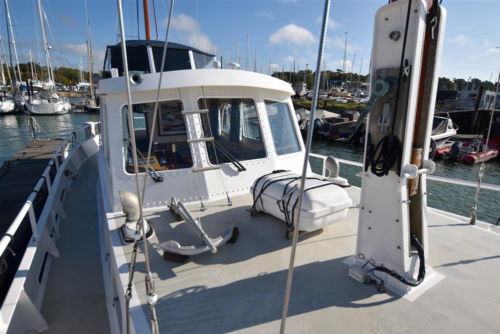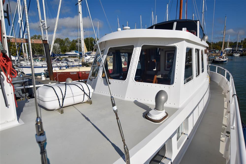 Built by the Hakvoort Shipyard to a design of Pieter Beeldsnijder in 1974. 6mm steel plated hull with an aluminium superstructure. Royal blue painted topsides with white boot line painted and a white superstructure. All painted with AWLgrip. Displacement hull with a long keel, canoe stern and high bow. Hull has been epoxied. Decks are painted in grey anti-slip paint. Keel hung rudder with dual station hydraulic helms and emergency tiller. Last surveyed in 2018 with all recommendations carried out.