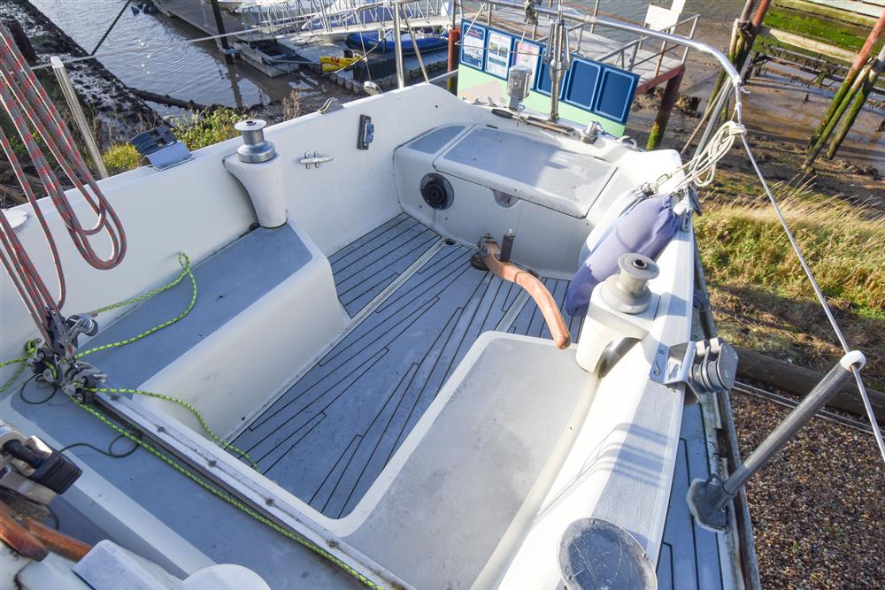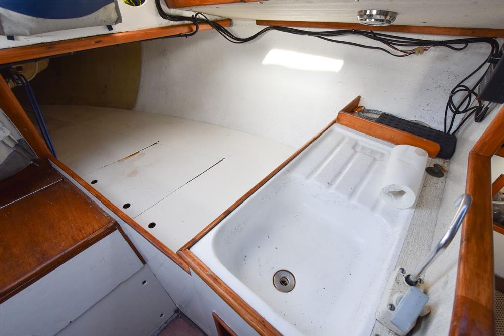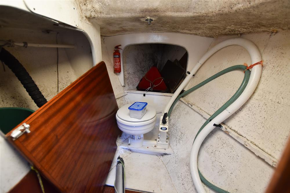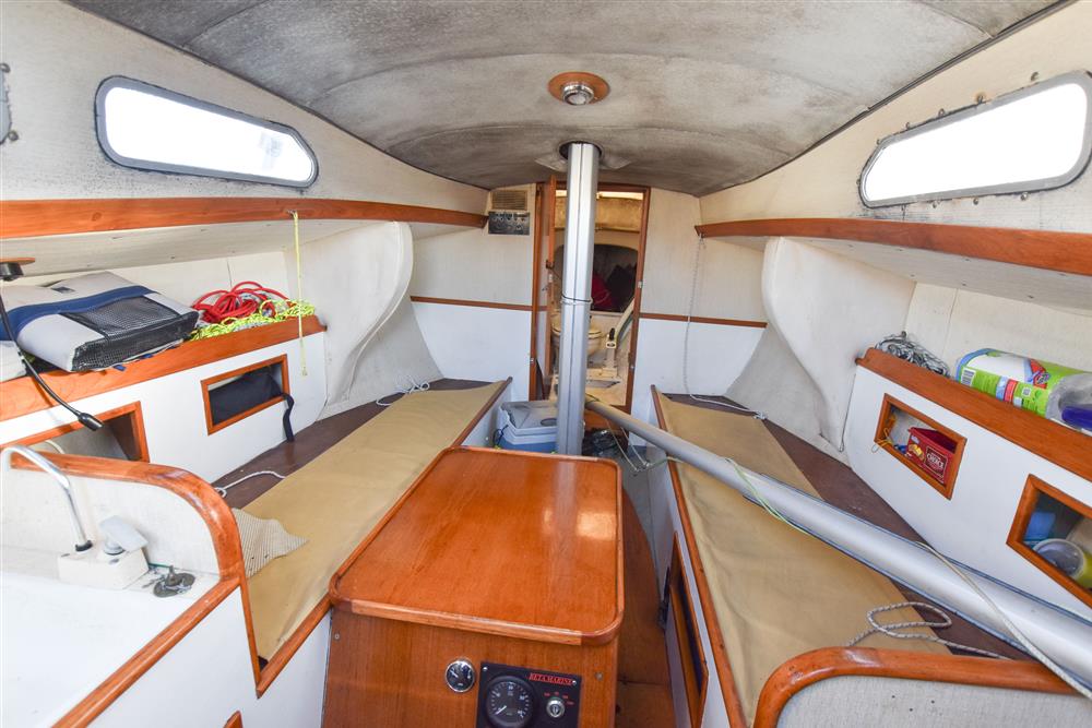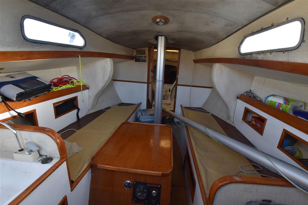 Offering 4 berths in a simple, traditional layout. Up forward is the separate heads compartment with a Jabsco manual marine toilet, good stowage and a deck opening hatch. Moving aft, there are two single settee berths either side of engine box which is used as the saloon table. Two single quarter berths to aft. There is a two burner gas hob to starboard and basin opposite to port with a manually pump cold water supply. 12 volt coolbox. Lee cloths.