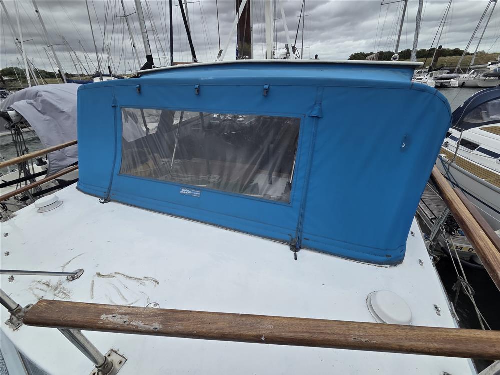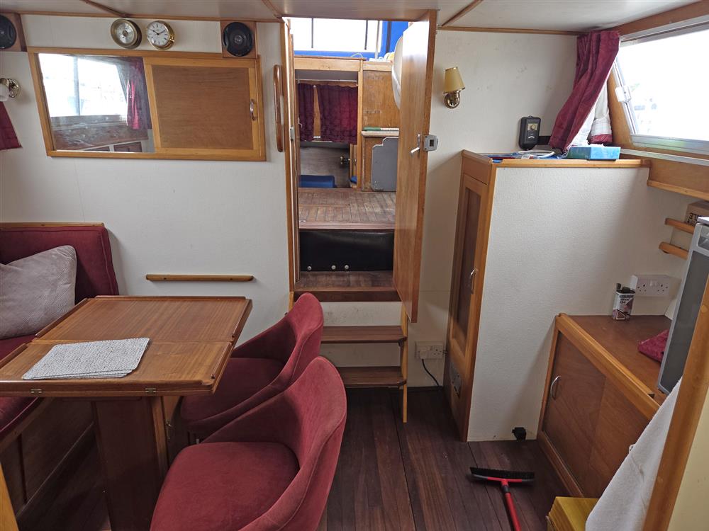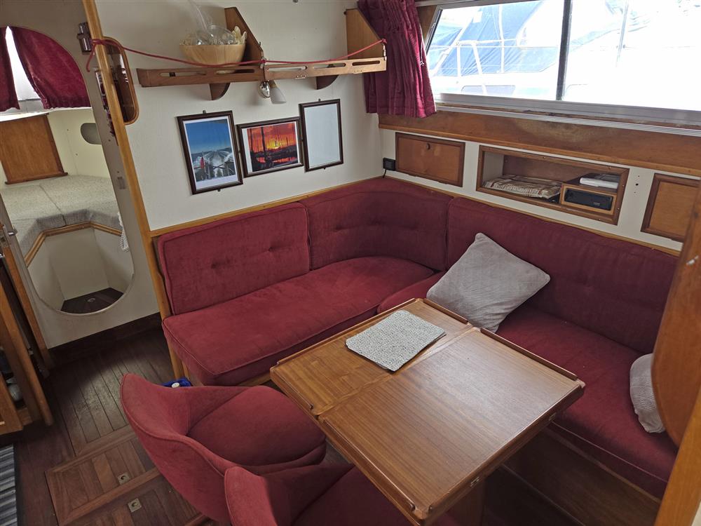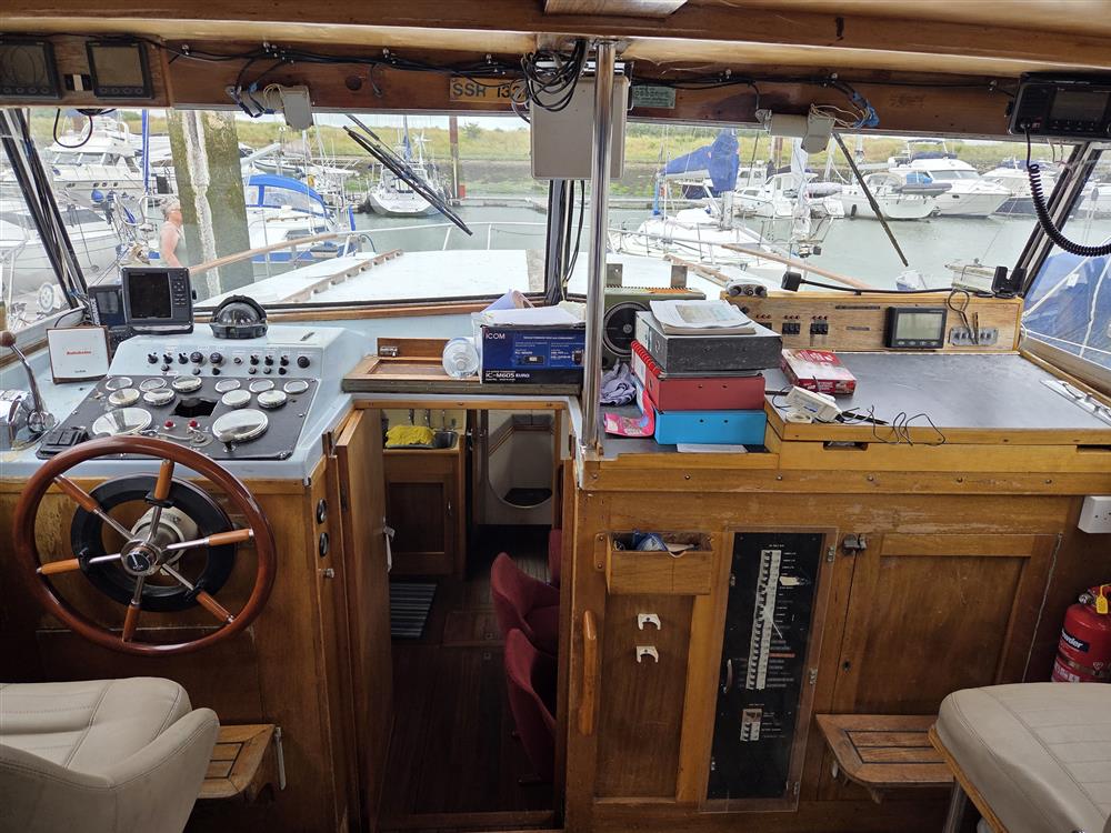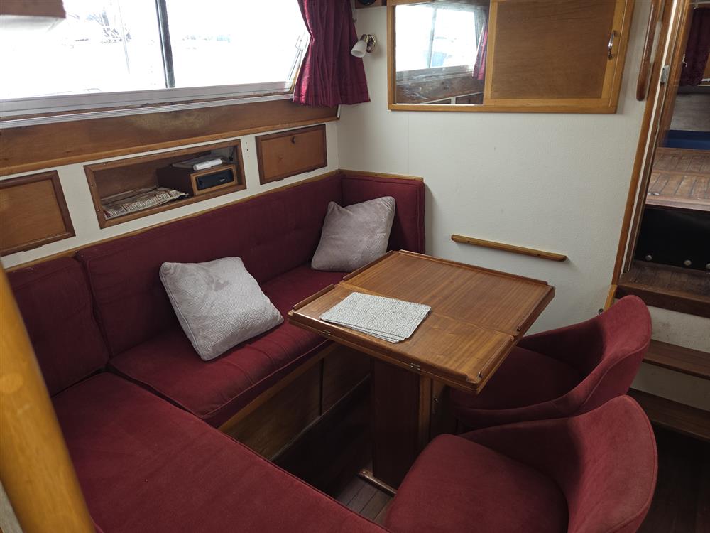 This King Falcon 33 has a unique layout which currently offers four/five berths in three cabins with good headroom throughout. FORECABIN: Permanent double V berth (this could be converted back to two single berths with an infill if required), storage in lockers and beneath berths and deck hatch. New forecabin berth upholstery 2019. HEADS COMPARTMENT: Located to starboard and fitted with a Jabsco marine toilet, washbasin, shower and stowage. GALLEY: An L-shaped galley forward to port equipped with a Voyager 4500 two burner gas stove with grill and oven (new 2019), stainless steel sink and plenty of stowage in various lockers and cupboards. Cutlery, crockery and cookware included. The gas system and cooker were replaced and certified in 2019/20. SALOON: Consisting of a large storage unit with fitted Waeco 12/240V marine fridge and two chairs with L-shaped dining area and bespoke central table with folding leaves opposite. Additional storage is also provided beneath and around the dining area including a large drinks cabinet and various additional racks and shelves. WHEELHOUSE: Helm position with adjustable and removable bucket seat to port, navigator seat with chart storage to starboard and additional seating to aft of cockpit. AFT CABIN: Currently in its original configuration of two good single berths with a storage unit between, which could be altered to form a reasonable size double if her new owners preferred. En suite heads compartment with marine toilet and washbasin. The interior is light and airy with excellent ventilation and is in good condition throughout with beige upholstery (new 2015) in both sleeping cabins and maroon velour upholstery in the saloon. Maroon curtains throughout. She has a pressurised water system providing hot and cold water to both heads and the galley via a calorifier. A diesel fired heater (new 2018 with dedicated battery and charger) provides warm air heating to all cabins and shorepower has been installed along with a Glomex TV aerial.