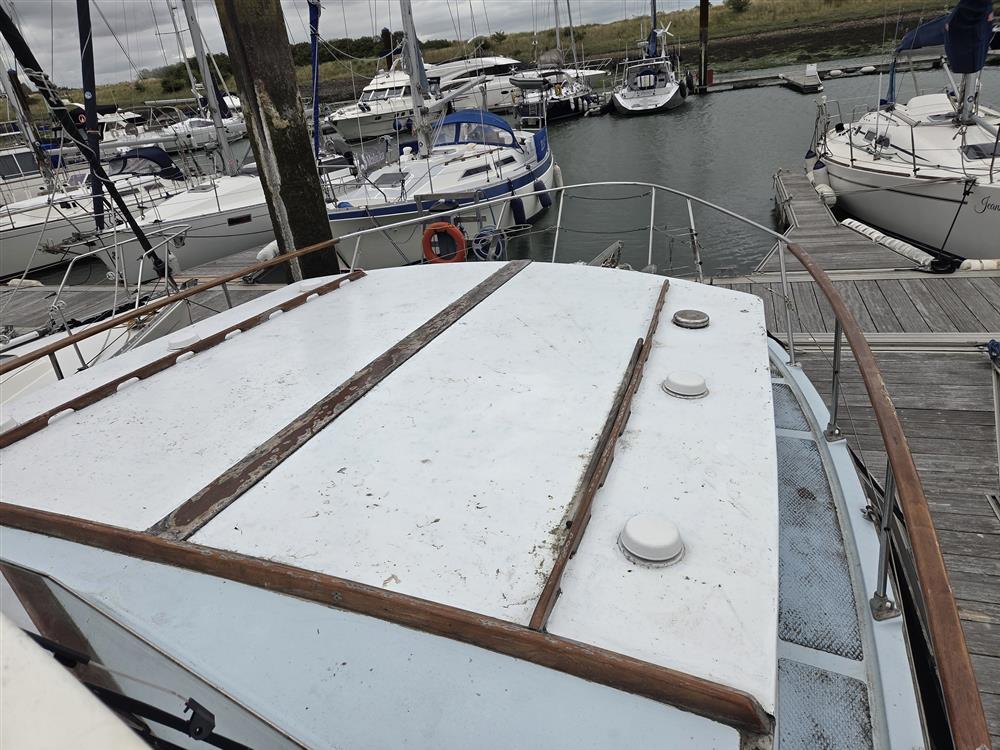 The Osborne King Falcon 33 was built in 1975 by William Osborne Ltd., Littlehampton to their own design. White GRP semi-displacement hull with styling stripes and spray chines. Light blue GRP coachroof with blue Treadmaster decks and blue painted non-slip surfaces to the sheathed cabin and wheelhouse roofs. Teak rubbing strakes. Aluminium framed windows. The hull was professionally stripped and epoxy treated in 2009 and had new propellers, shafts and rudders installed in 2010.