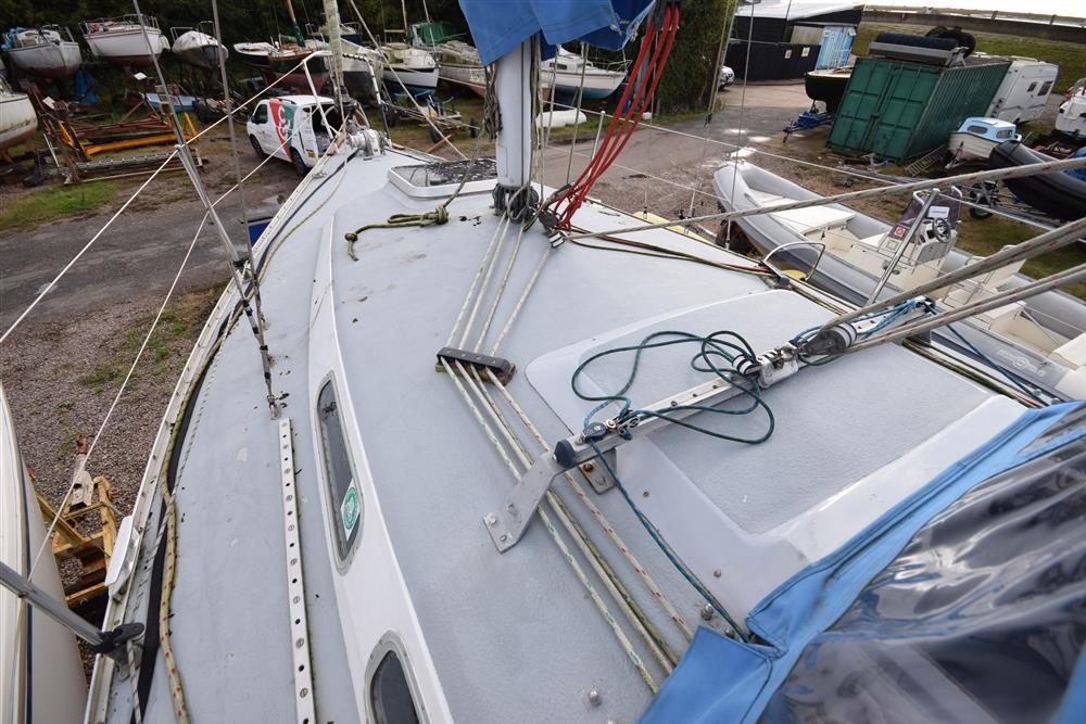 Contessa 28 built by Jeremy Rogers in 1978 to a Doug Peterson design. White GRP hull (epoxy coated in 2003) with style stripes, coachroof and grey moulded non-slip decks. Encapsulated lead ballast in fin keel. Tiller steering to semi-balanced rudder. Self-draining cockpit. Simulated teak finish to cockpit seats. In 2015 the rudder was removed, faired and epoxy coated before being refitted and the aluminium windows were also replaced. A recent survey has identified that moisture has entered areas of the deck, and whilst it is still possible to use without repair, it would be advisable to rectify this in the future. In July 2022, all seacocks were replaced.Disclaimer