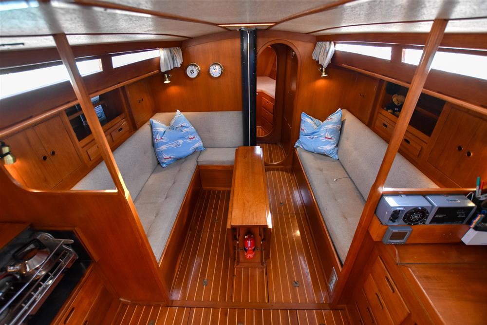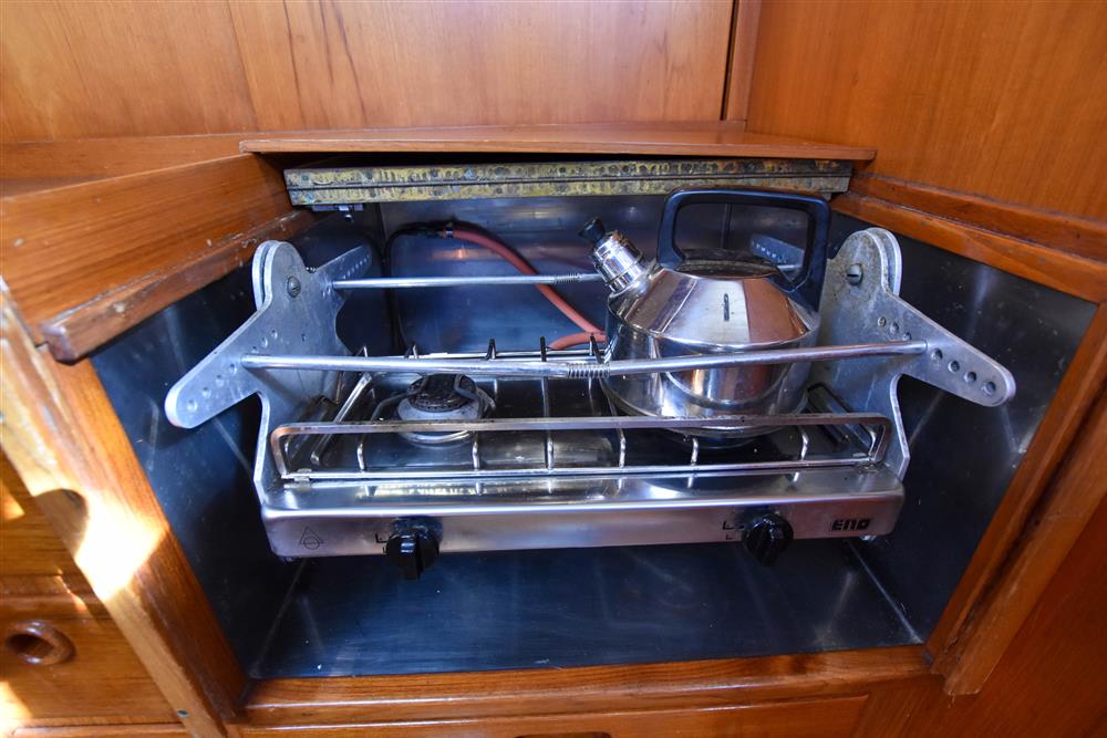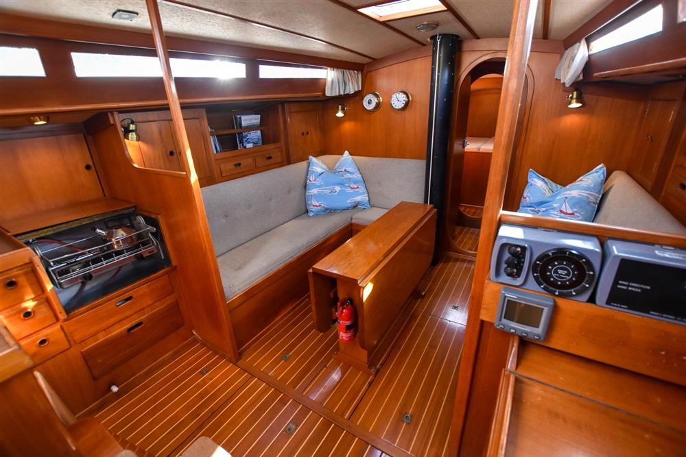 The boat offers up 6 berths in a beautiful teak interior. In the forecabin, there is a V-berth with good stowage underneath and a deck opening hatch. Separate heads compartment to port with a Jabsco marine toilet, stainless steel basin with a hot & cold pressurised water supply. Large hanging locker opposite to starboard. Moving aft, into the spacious saloon featuring two single settee berths, either side of a fixed saloon table with double drop leaves. Superb stowage around the saloon with eye level cupboards and shelving. To port, there is a L-shaped galley with a two-burner gas hob, twin stainless steel sinks with a hot and cold pressurised water supply. Extra manually pumped cold water supply and a filtered drinking water tap. Deep storage lockers. Opposite to starboard, is the forward-facing chart table with the electrical distribution panel, navigation instruments and chart stowage. Moving into the aft cabin, there are two quarter berths to port and starboard, with excellent stowage and a little seat. Cream upholstery through. Eberspacher diesel cabin heater (fully serviced but requires fitting). Curtains.