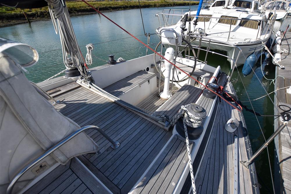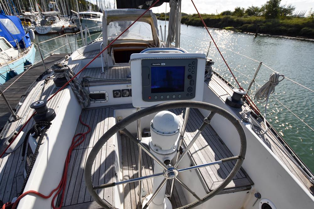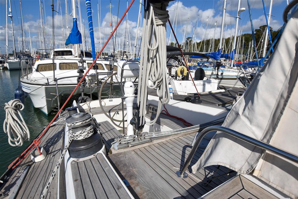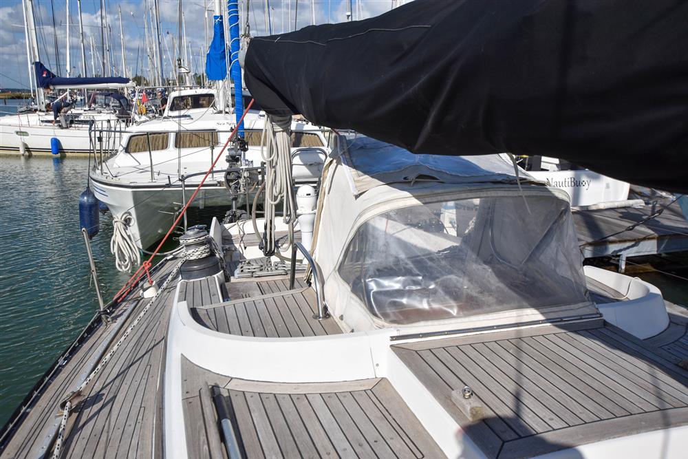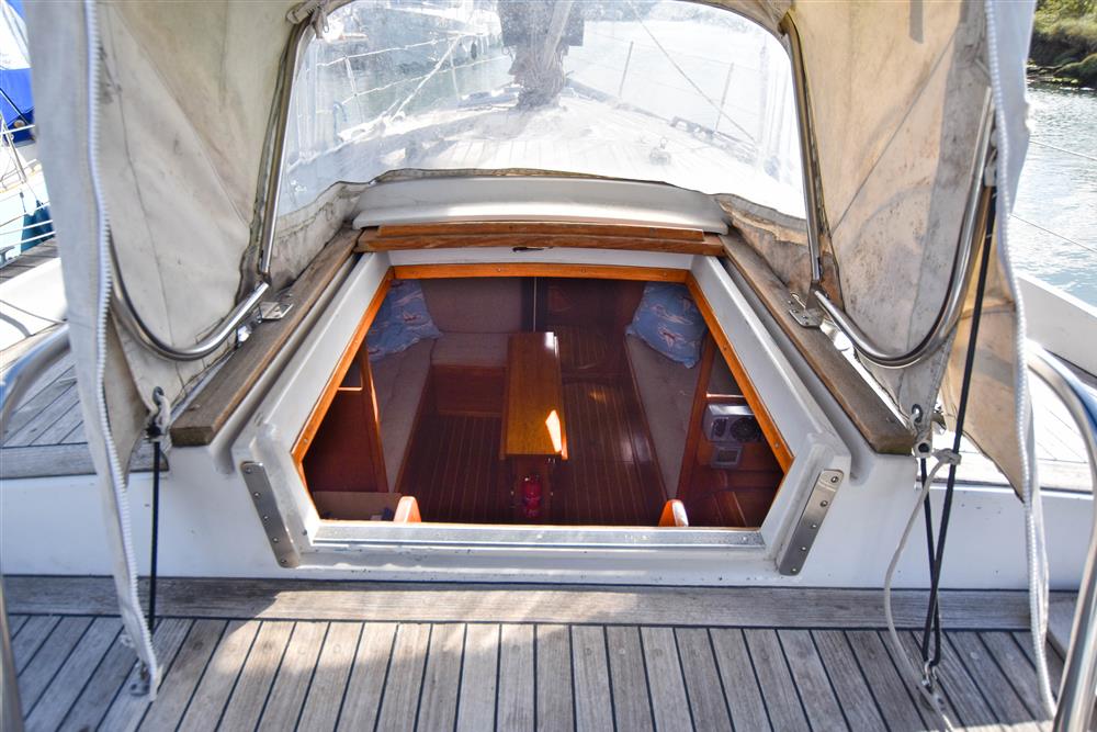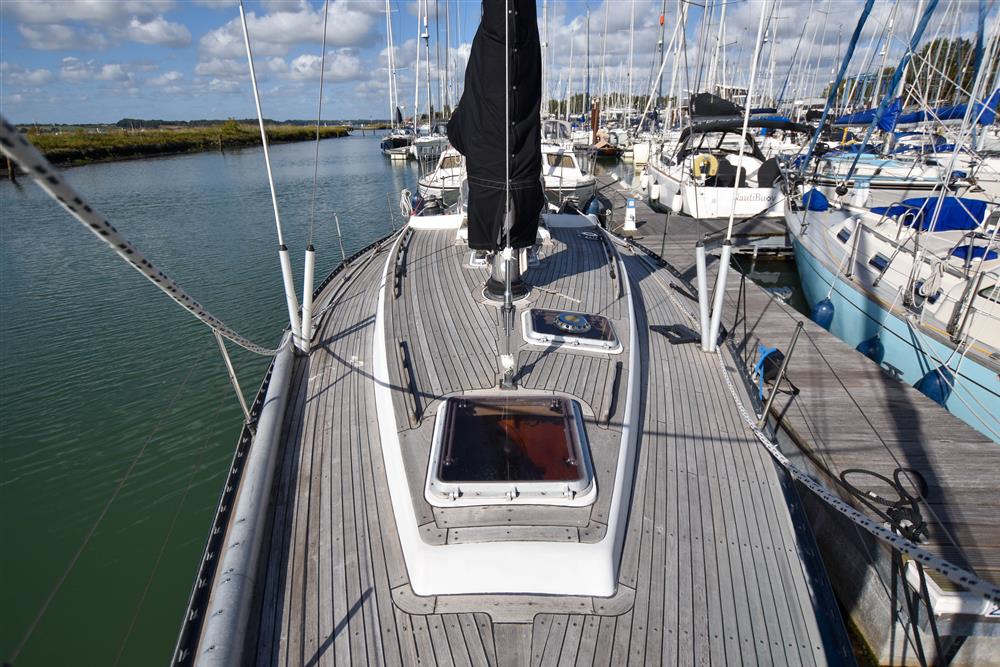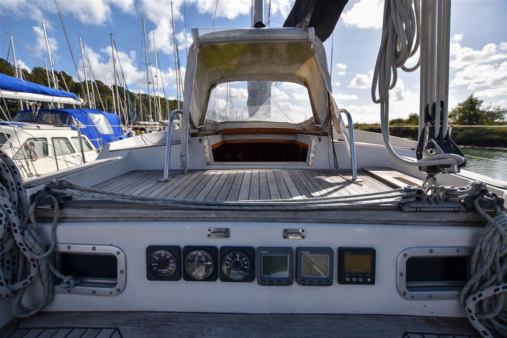 Built by Standfast Yachts in 1979 to a design of Frans Maas. White GRP hull with black style stripes. Lead fin keel. Wheel steering to a ½ skeg hung rudder. White GRP deck with a teak laid finish. Aft self-draining cockpit. Teak laid cockpit seats and sole.