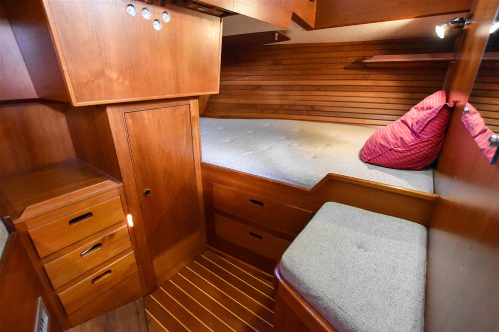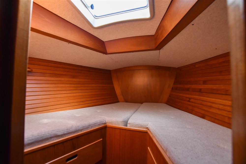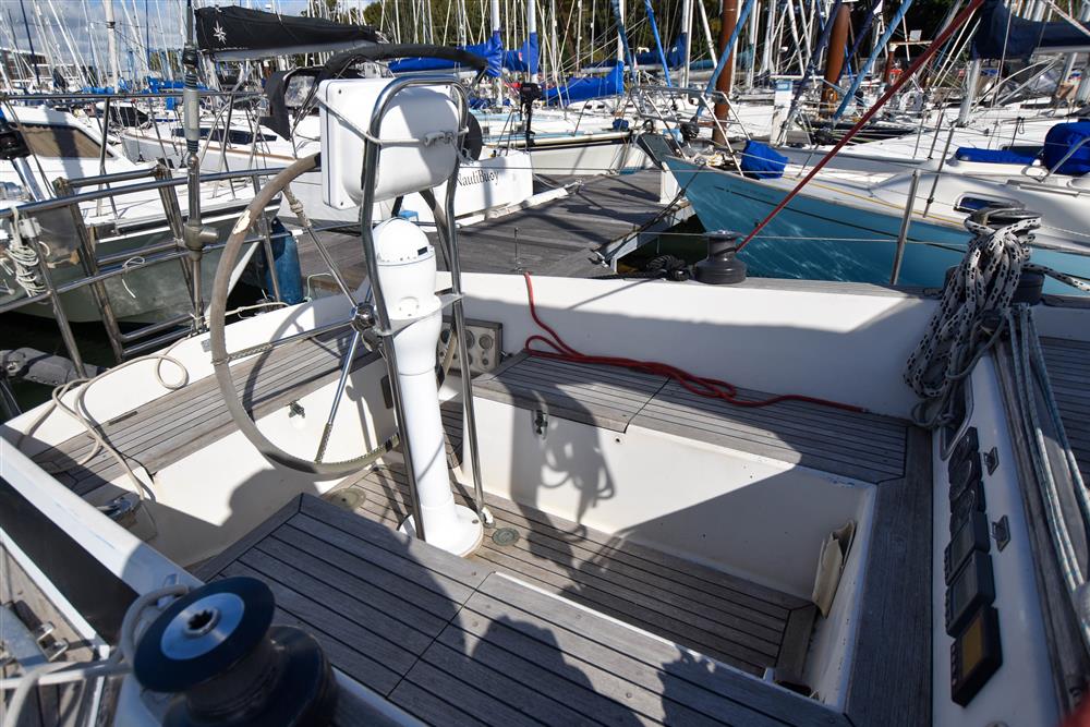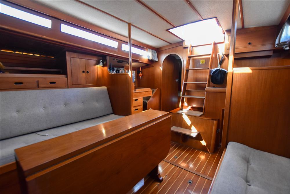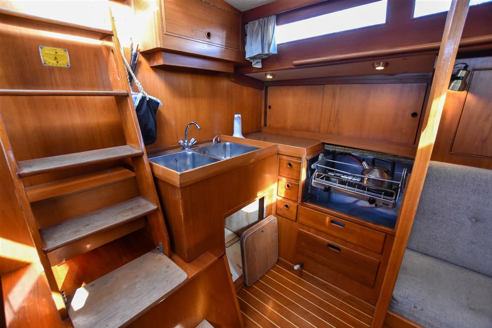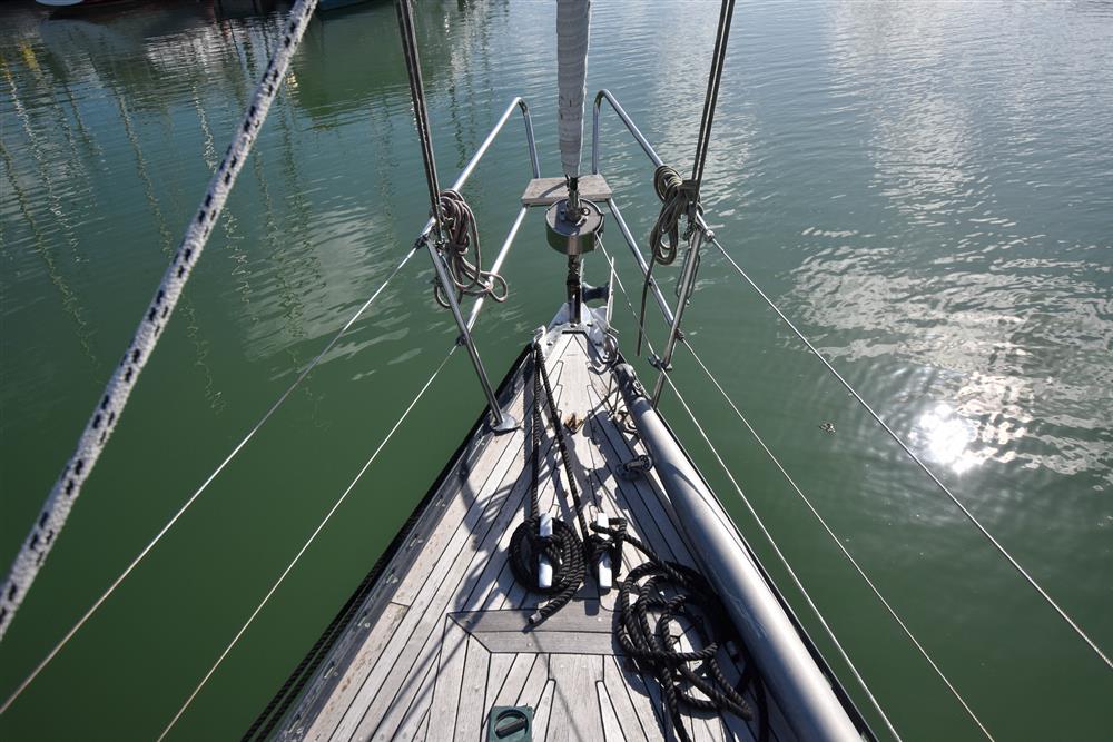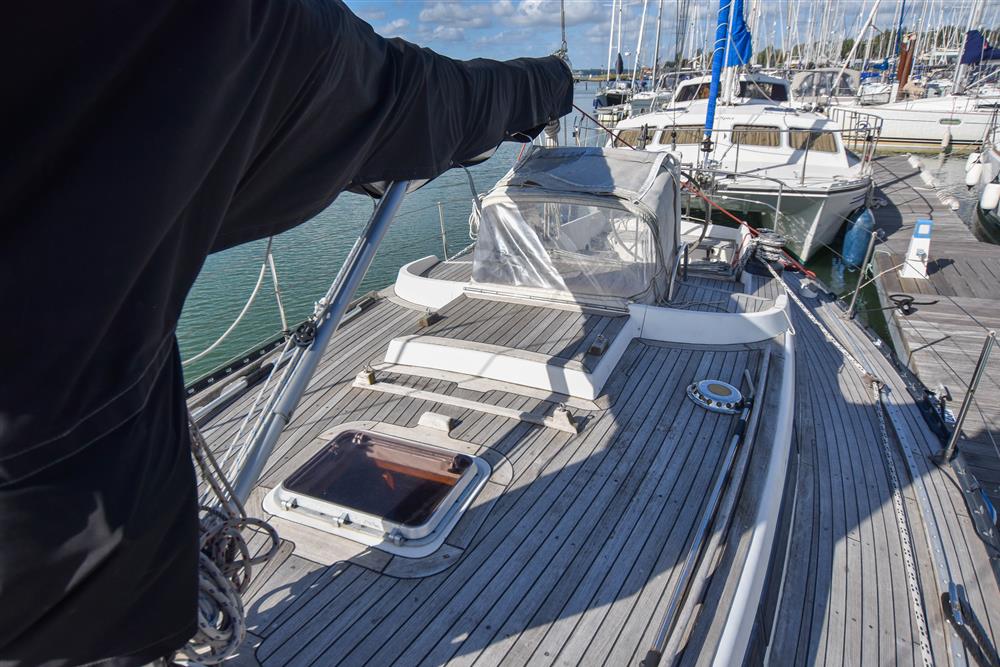 Built by Standfast Yachts in 1979 to a design of Frans Maas. White GRP hull with black style stripes. Lead fin keel. Wheel steering to a ½ skeg hung rudder. White GRP deck with a teak laid finish. Aft self-draining cockpit. Teak laid cockpit seats and sole.