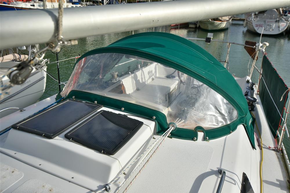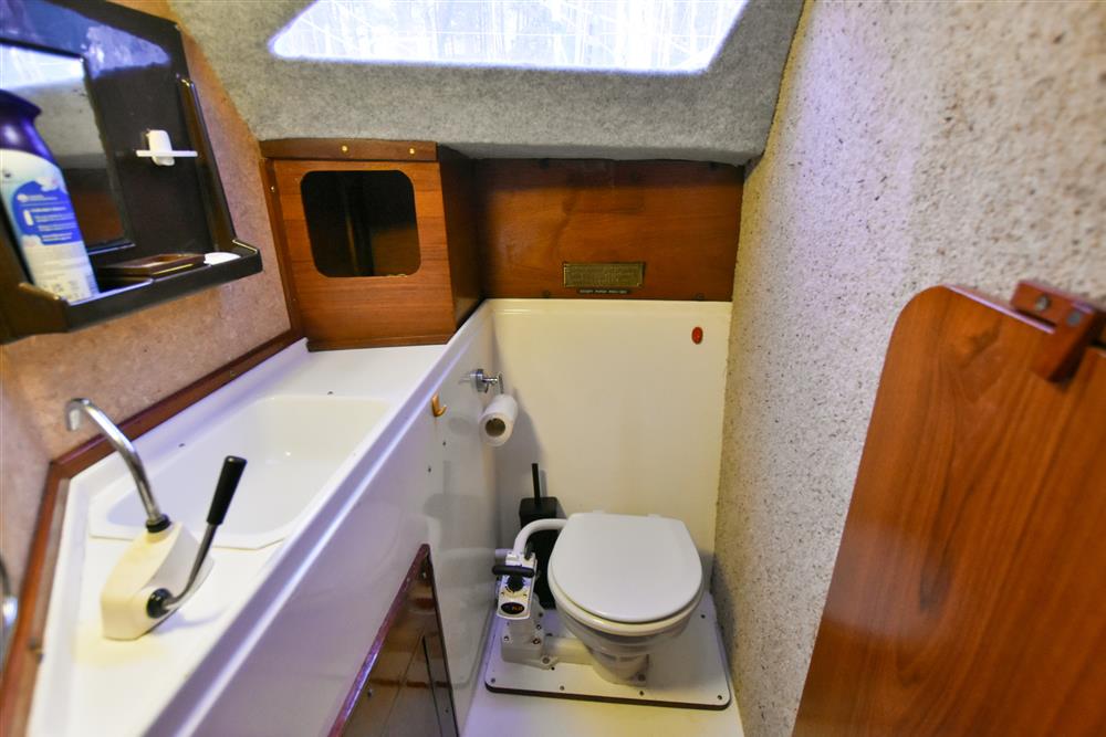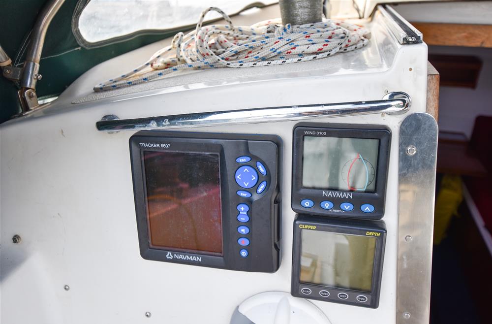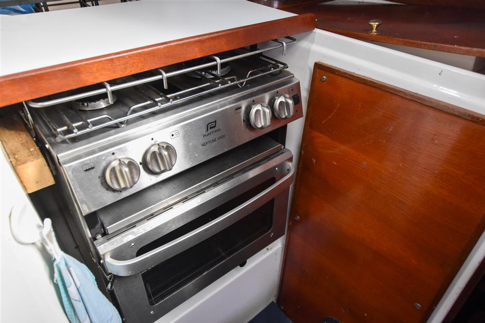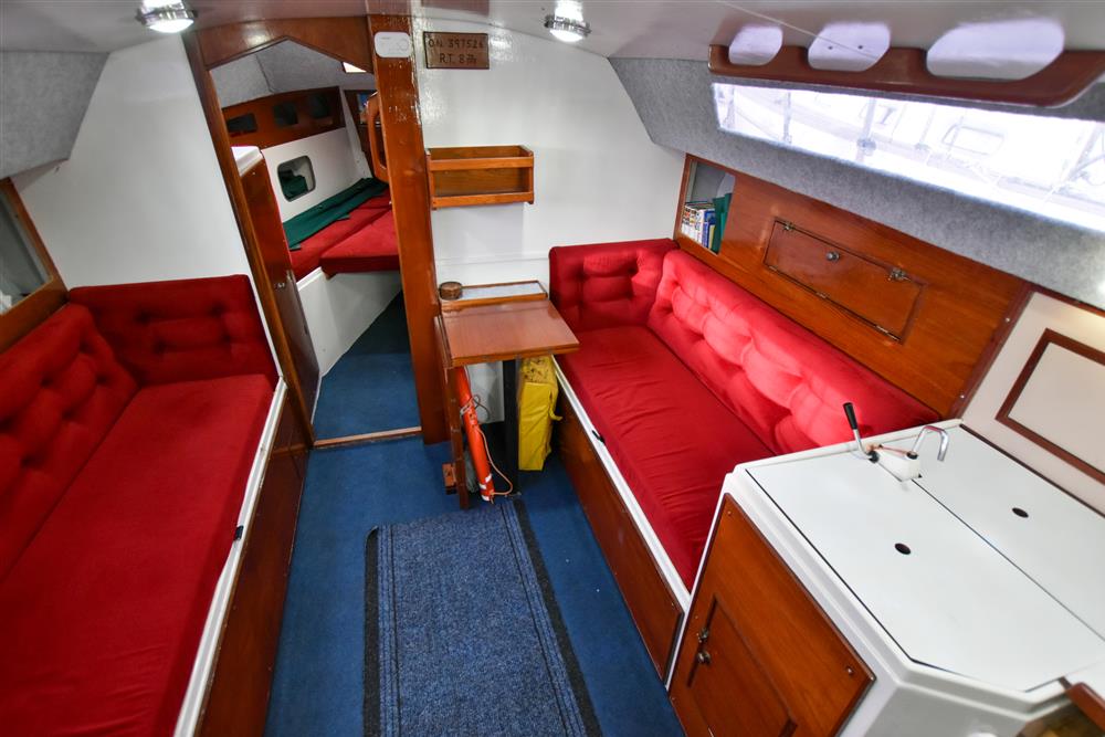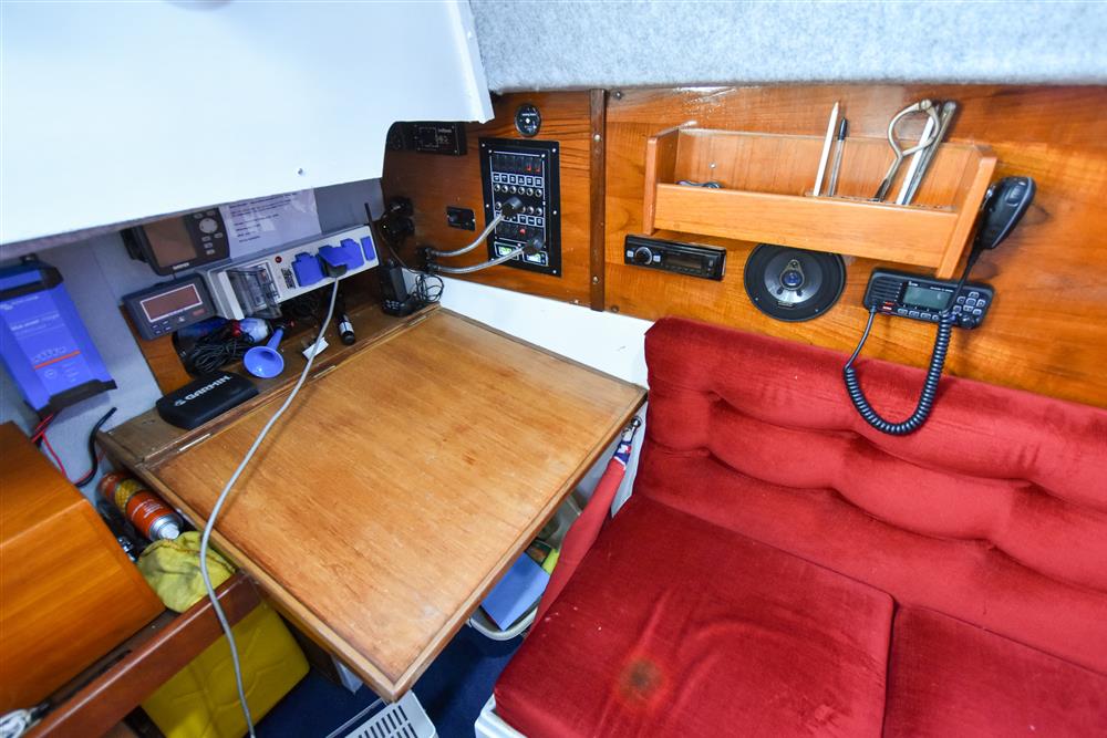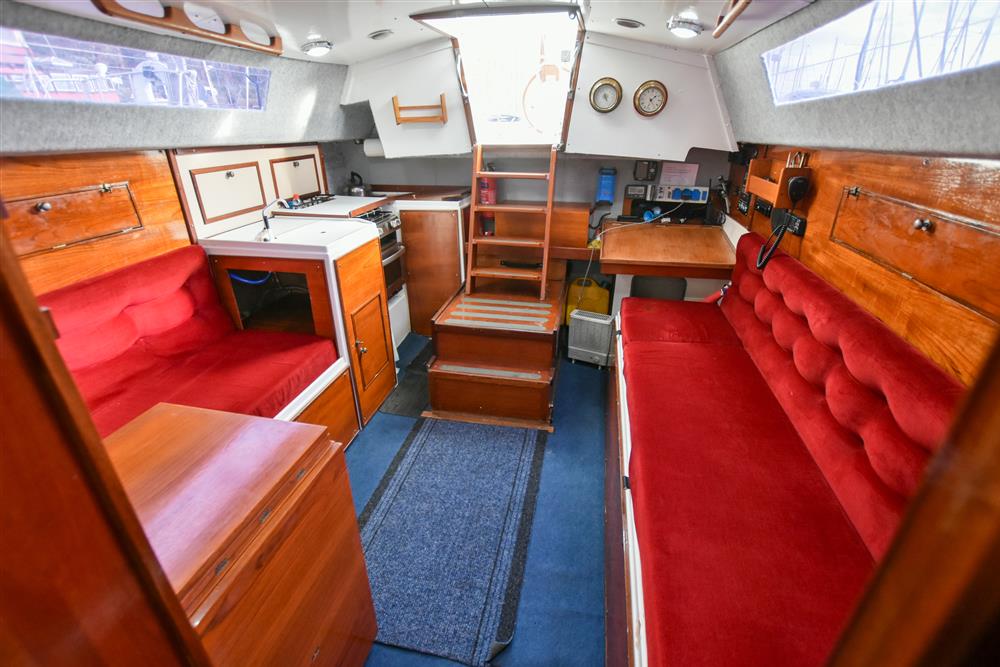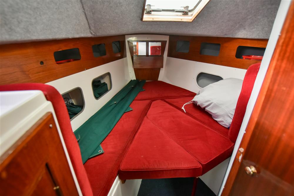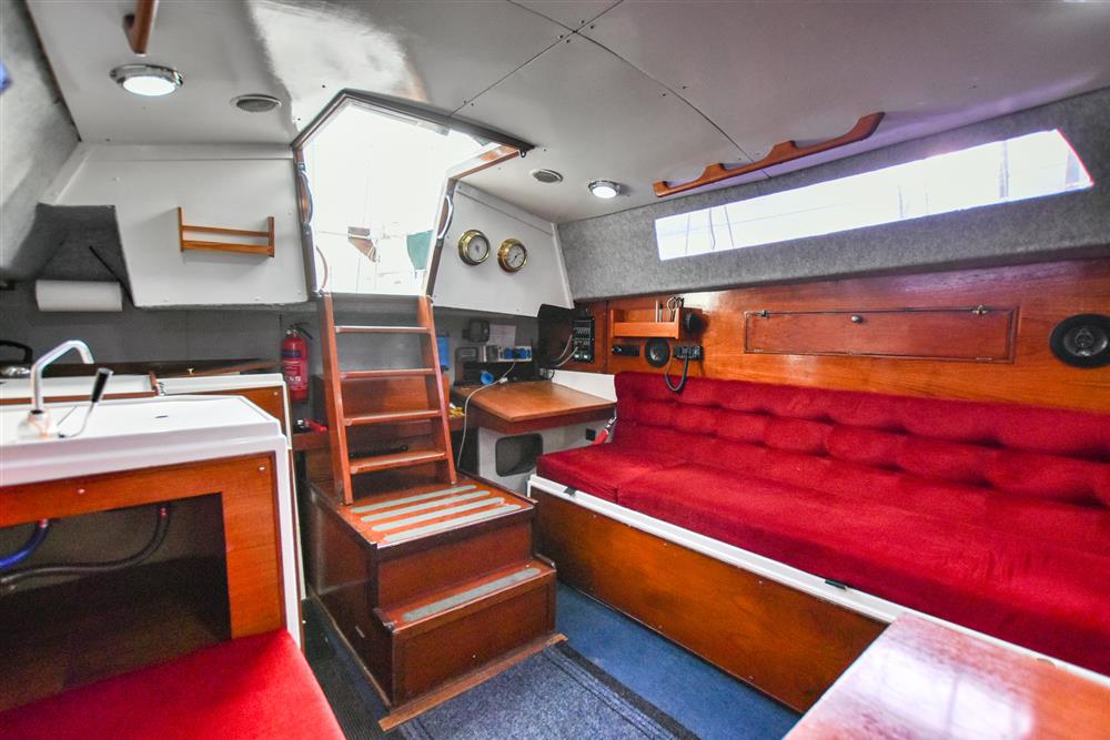 Offering up to four berths in two cabins. Up forward there is V-berth with an infill, to make a spacious double. Storage under berth. Large hanging locker to port. Separate heads compartment with a manual marine toilet (new 2025), basin with a manual cold water supply. Moving in to the saloon, there are two large settee berths to port and starboard with, with storage behind and under. A folding table to centre. Aft facing chart table in the port quarter with some navigation instruments and electrical control panel (new 2025). Opposite to starboard, is the galley with a Plastimo Neptune 2 burner gas hob with oven and grill (mounted on gimbals 2025). Twin stainless sinks with a manually pumped cold water supply from 125 L water tank under cockpit floor. Top opening Isotherm refrigerator with freezer box. Red upholstery. Radio/CD (new 2025). Eberspacher cabin heating. New hull linings 2025.