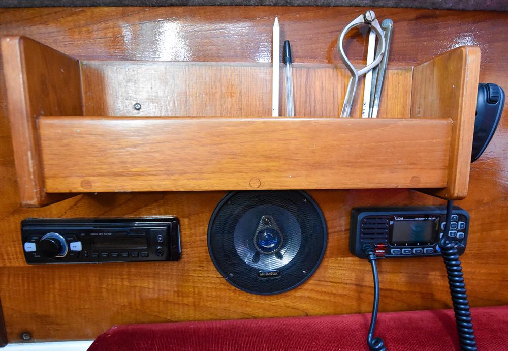 Located under the companionway stairs is the 1987 Thorneycroft 108/2 marine diesel engine. 38hp, 4 cylinders, fresh water cooled via a heat exchanger. Shaft drive to a fixed three bladed propeller. Single lever controls. Electric start. Approximately 1200 engine hours. Engine professionally serviced June 2025. New stern tube and cutlass bearing 2024. Raw water inlet and 112 L s/s fuel tank under saloon floor.