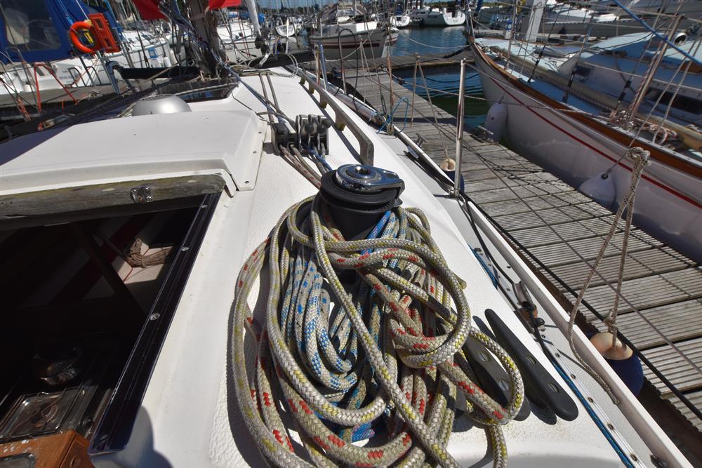 Fractional rigged sloop. Anodised aluminium mast and boom by Selden Spars, 1980. Stainless steel standing rigging (1997). Backstay adjuster (no runners). Terylene running rigging. Slab reefing mainsail with lazyjacks and stack pack cover. Furlex 100S head sail furler with Selden self tacking jib system. Lines led aft to cockpit. Two Harken 40ST primary sheet winches. Two Barlow secondary sheet winches. Two Harken 16ST control line winches on coach roof. Harken main sheet system. Spinnaker pole.