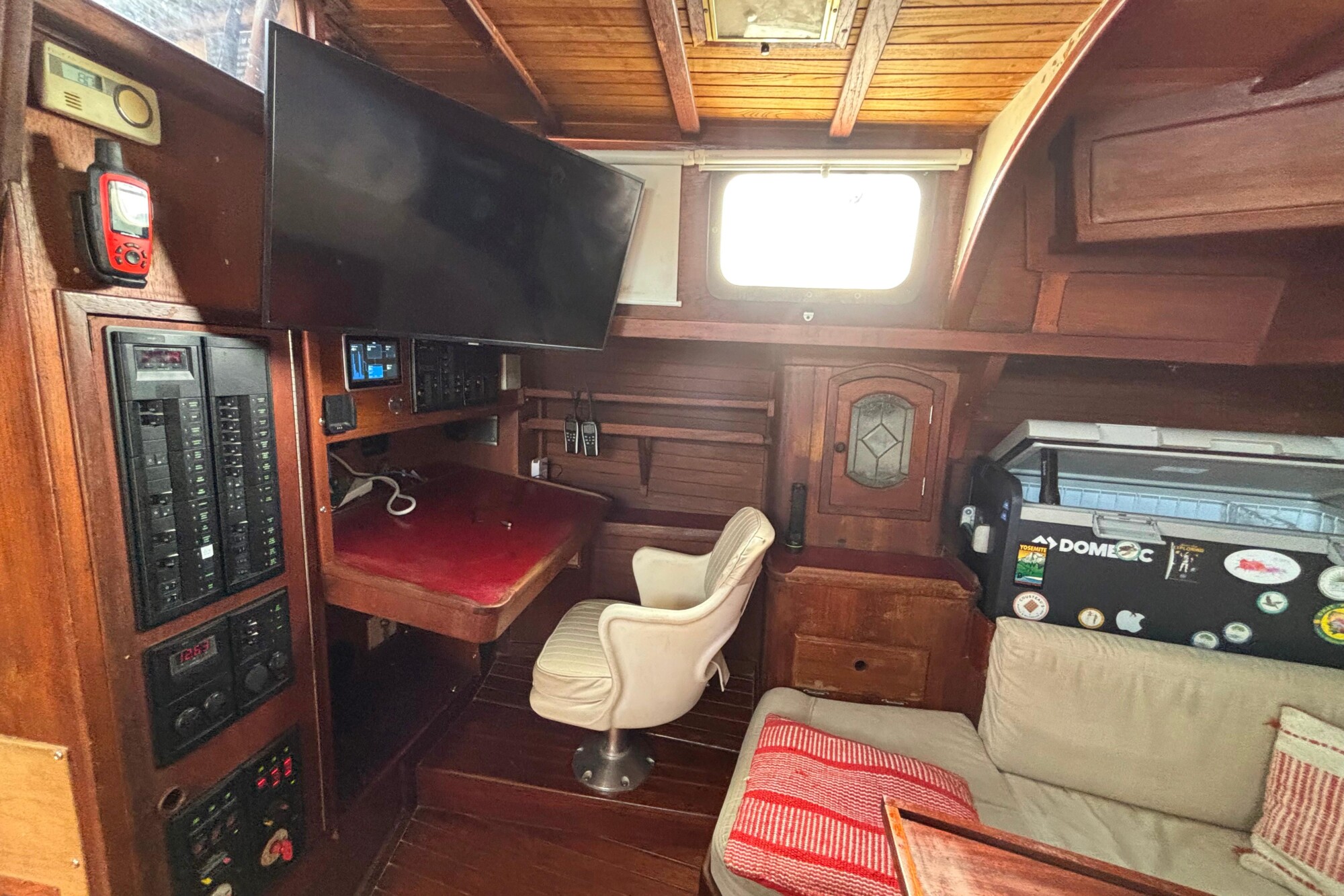 NAV STATION: To Starboard, with chair, chart table desk and electrical panels.