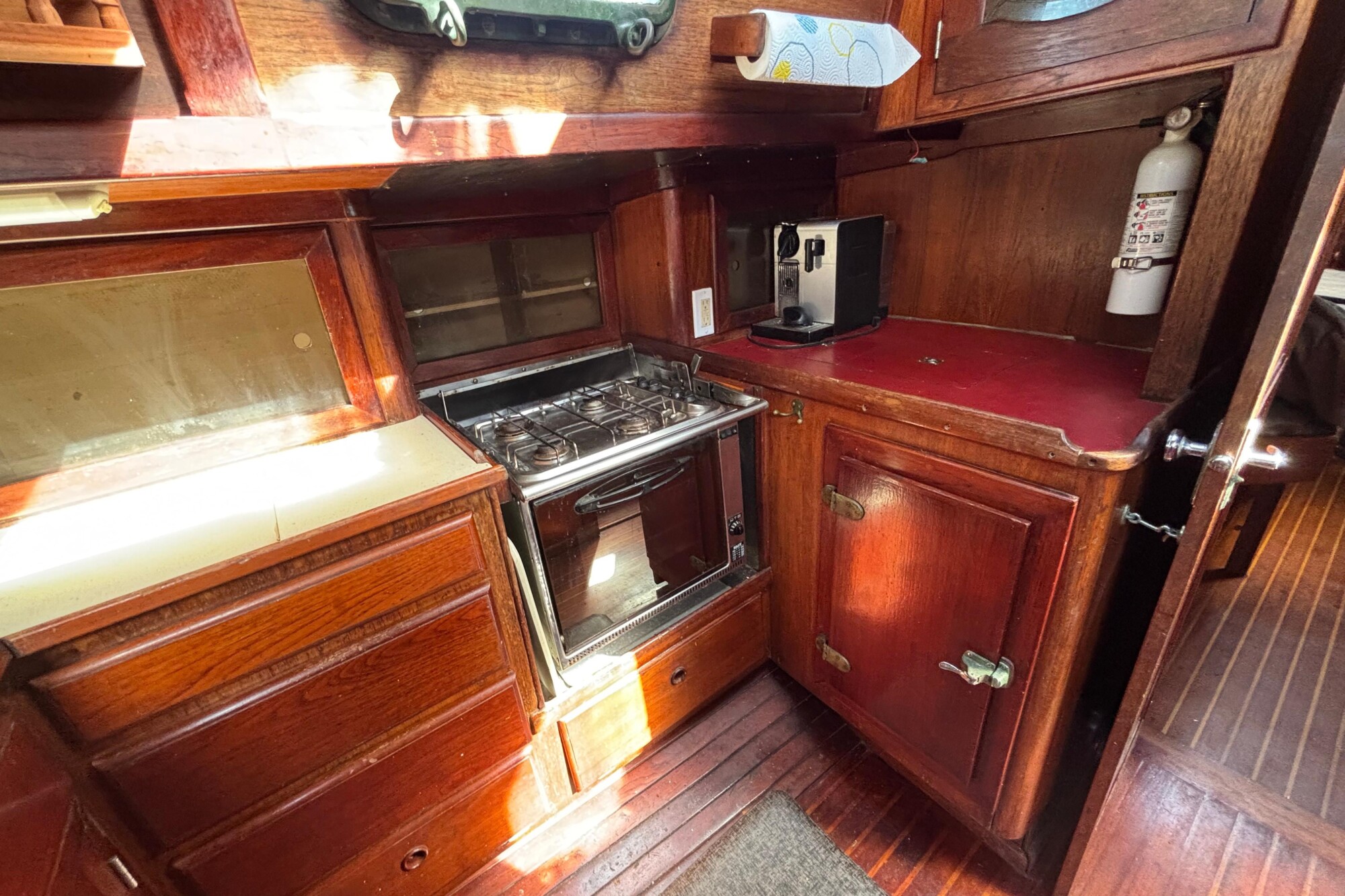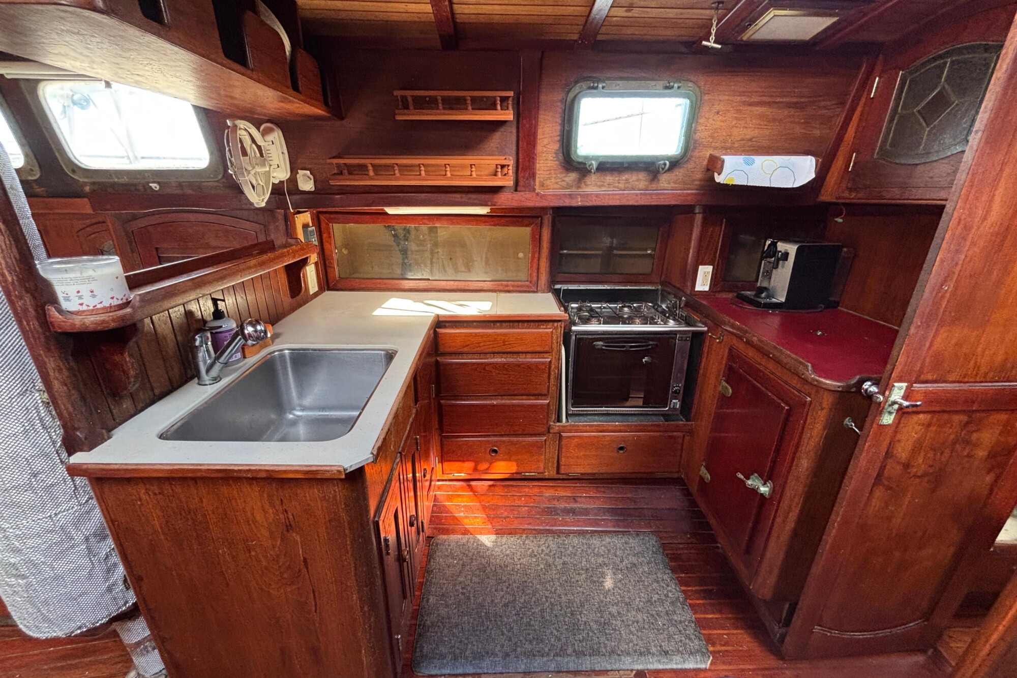 GALLEY: Midships to port, U-shaped galley with large s/s sink, 4 burner hob and oven, fridge (not working, needs compressor), (Dometic CFX 100 fridge or freezer in saloon), counter tops and plenty of drawers and storage.