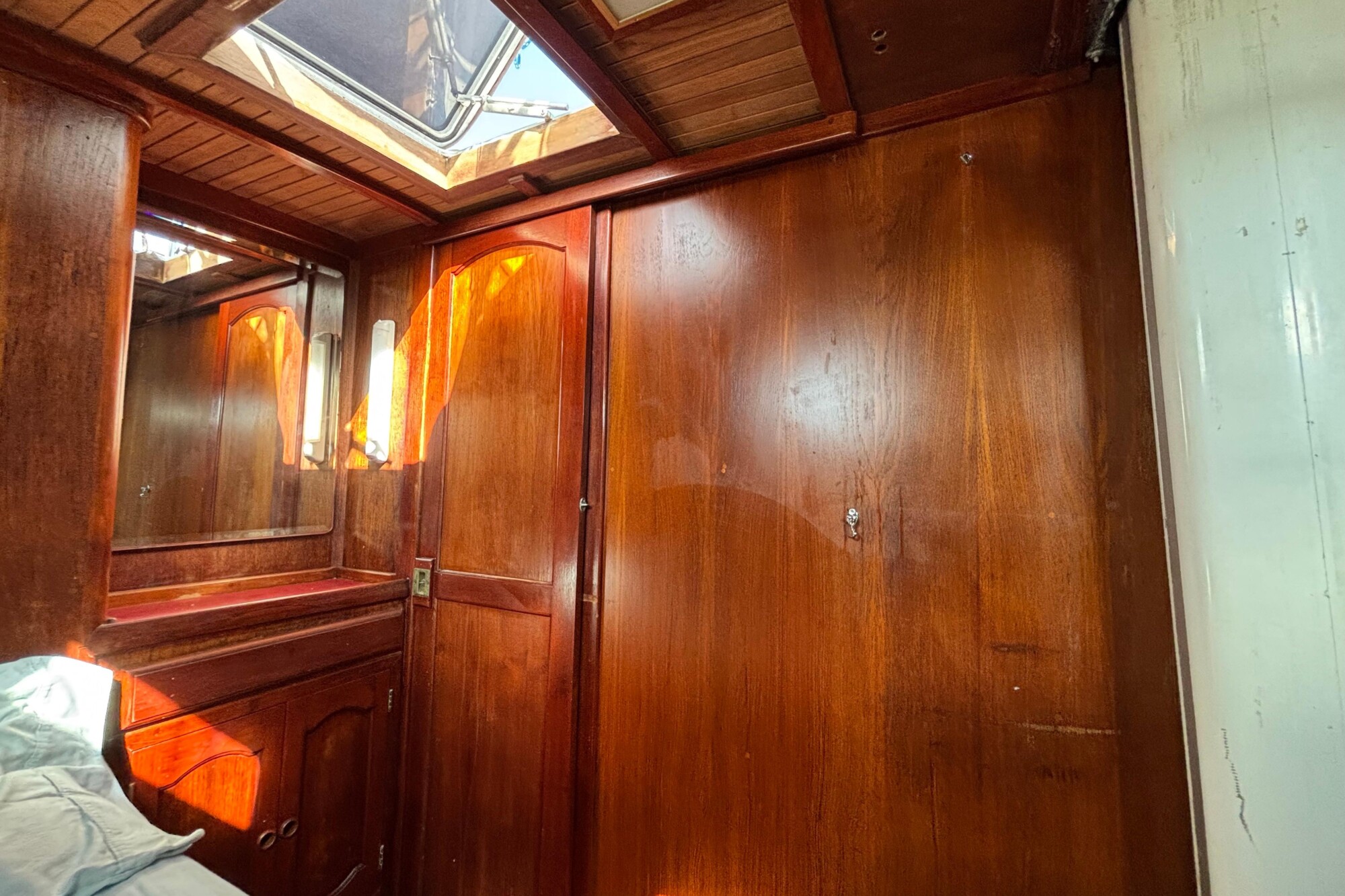 PORT & STB CABINS: Owners cabin to stb, with double pullman style berth, vanity area and hanging locker. To port, cabin with double pullman style berth which can be converted to two sea berths.