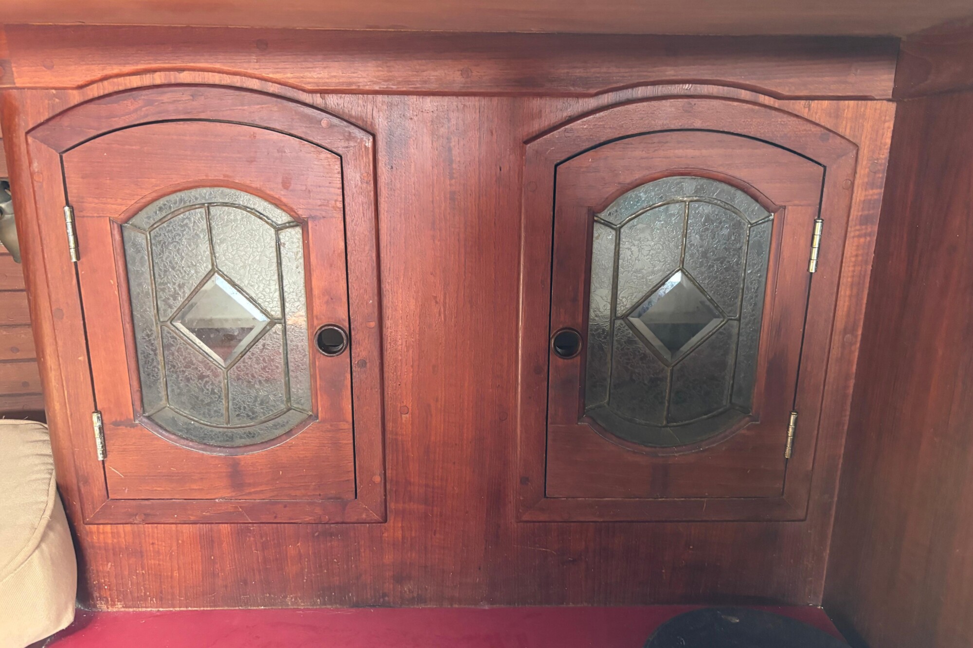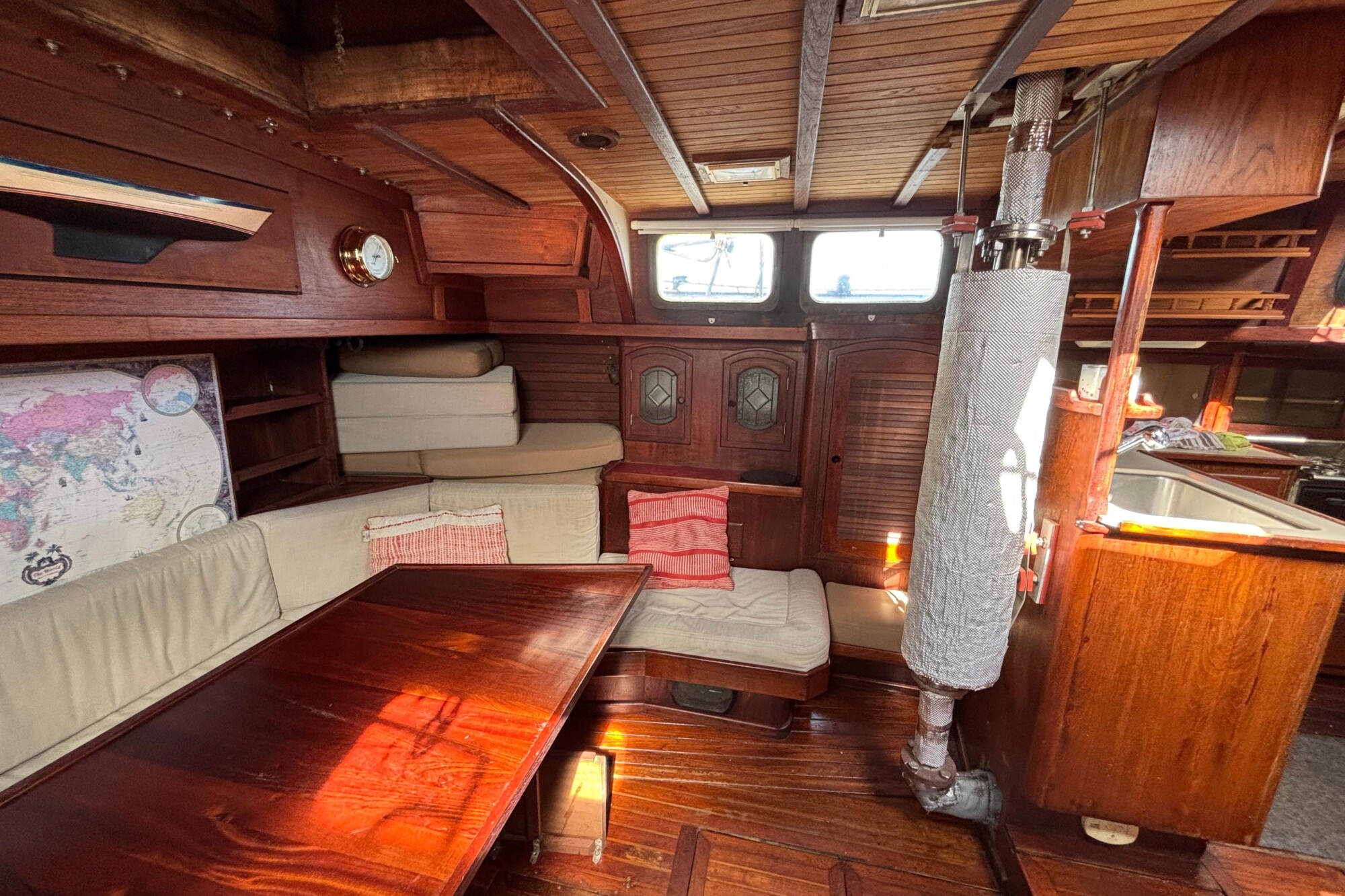 SALOON: Aft large horseshoe dining area that converts into double berth. Outboard surrounded by bookshelves and cabinets with stained glass inserts.