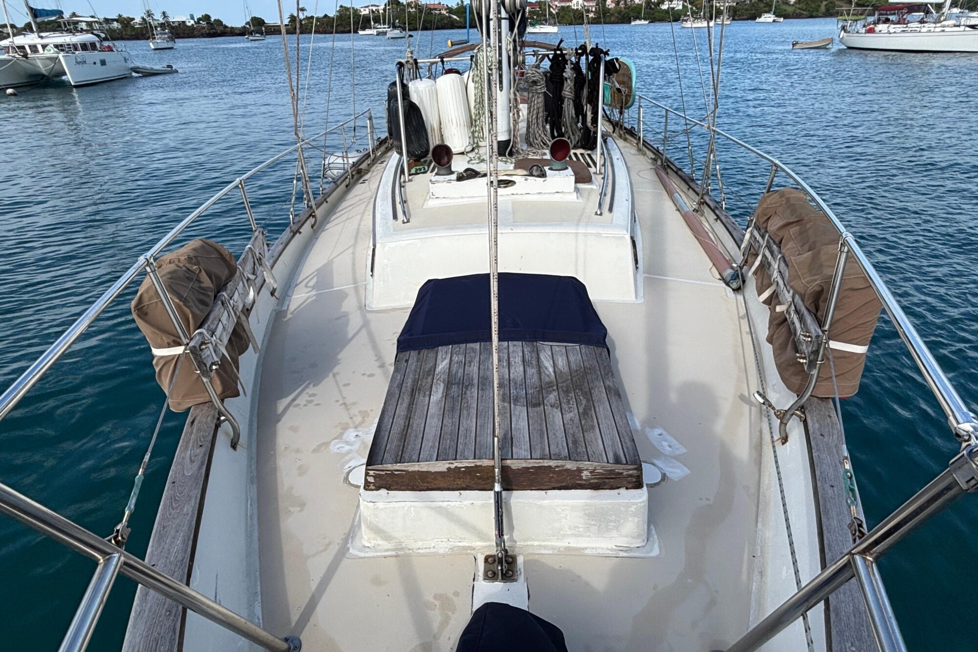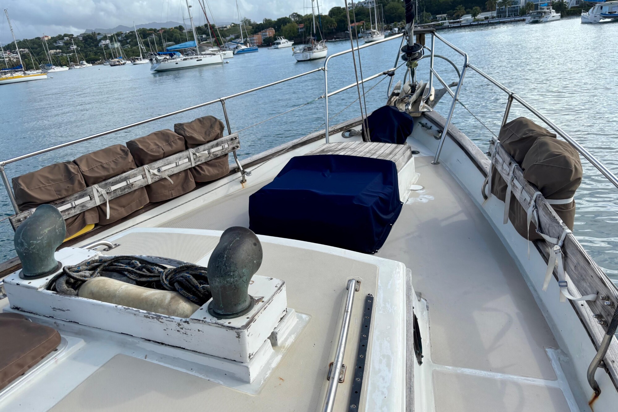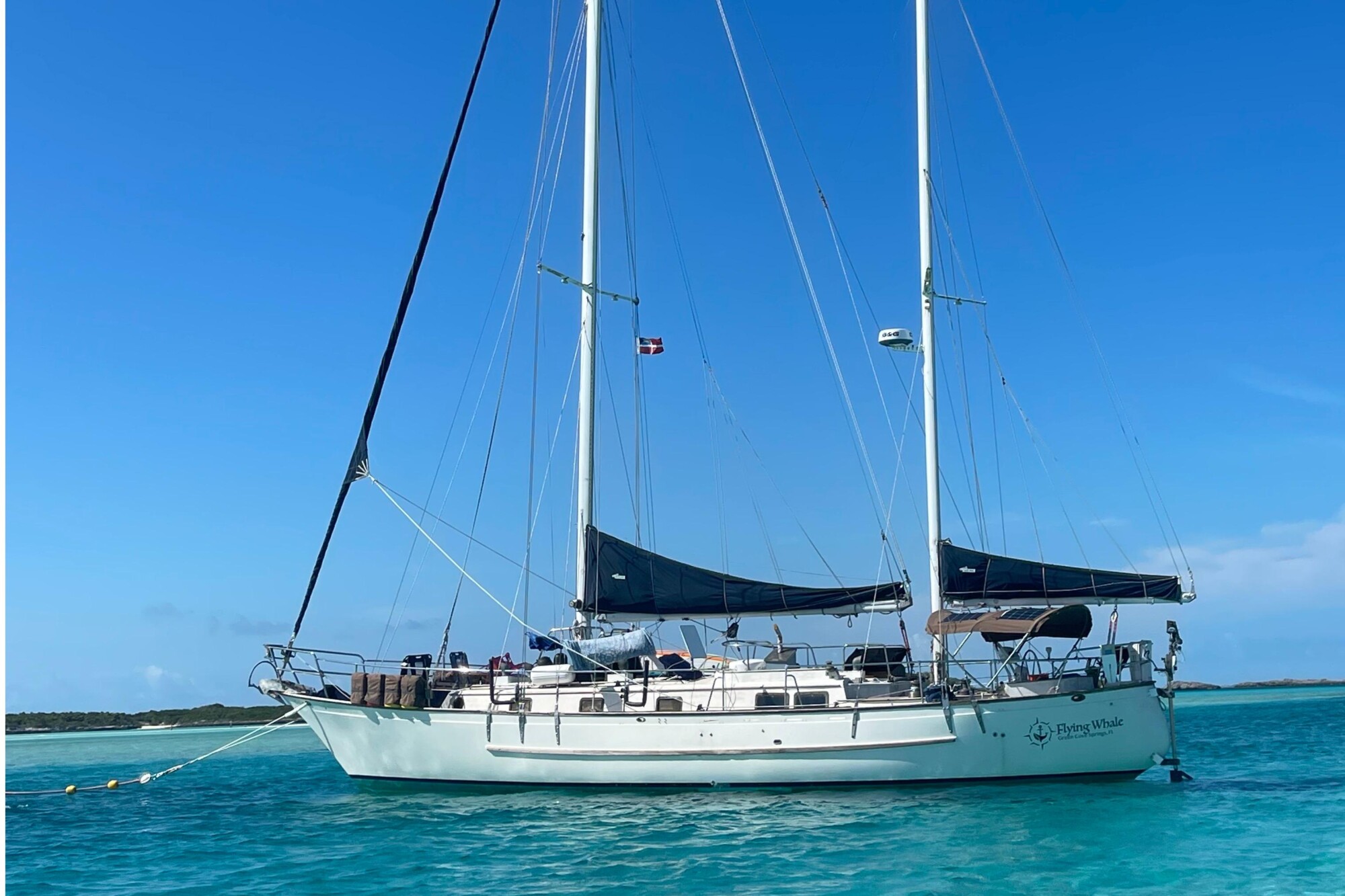 Flying Whale was built by Alajuela Yacht Corp., USA to Lloyds standards. She is an ocean cruiser built with hand-laid fiberglass, a fin keel and skeg-hung/partial-skeg rudder, heavy lead ballast and traditional teak trim. Last anti-fouled August 2025. Decks are painted and need re-painting.