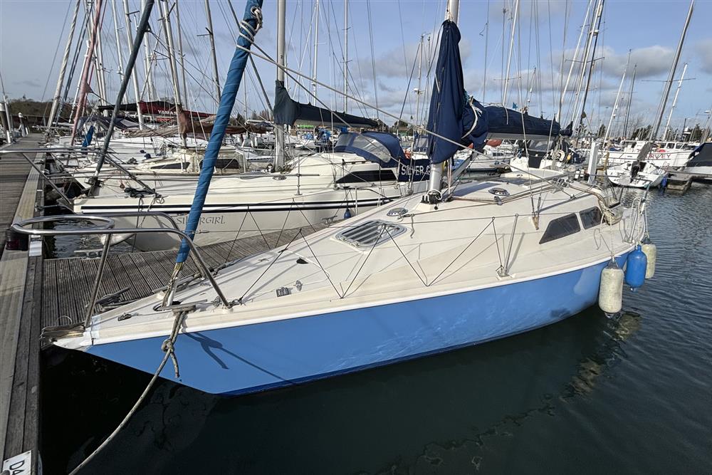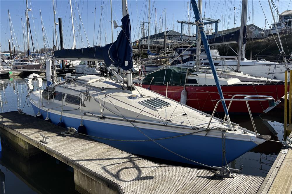 Built by Hunter Boats Ltd in 1981 to a design by David Thomas. Blue painted GRP hull (professionally sprayed in 2025). White GRP deck with a moulded non-slip finish. Tiller steering to a transom-hung lifting rudder. Cast iron lifting keel. The keel was sandblasted and epoxy coated in 2024.