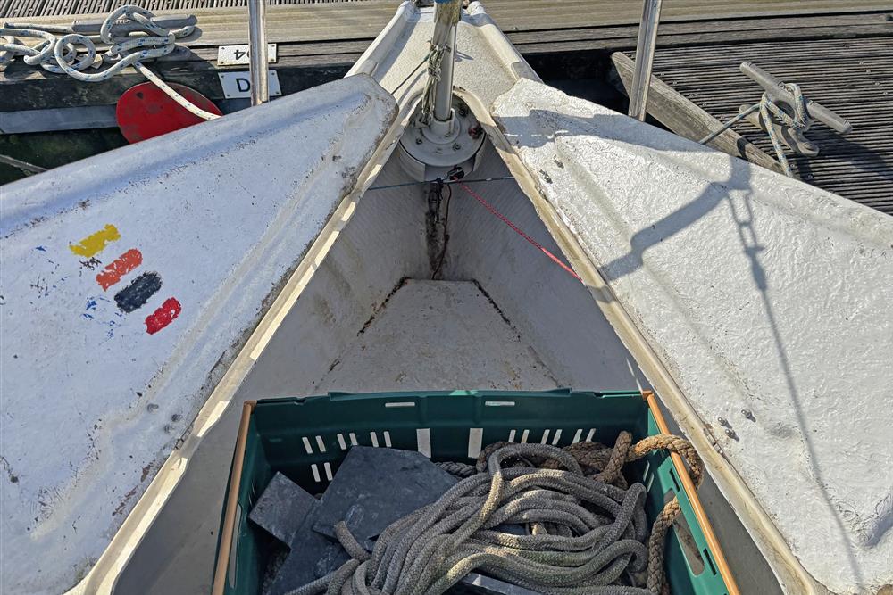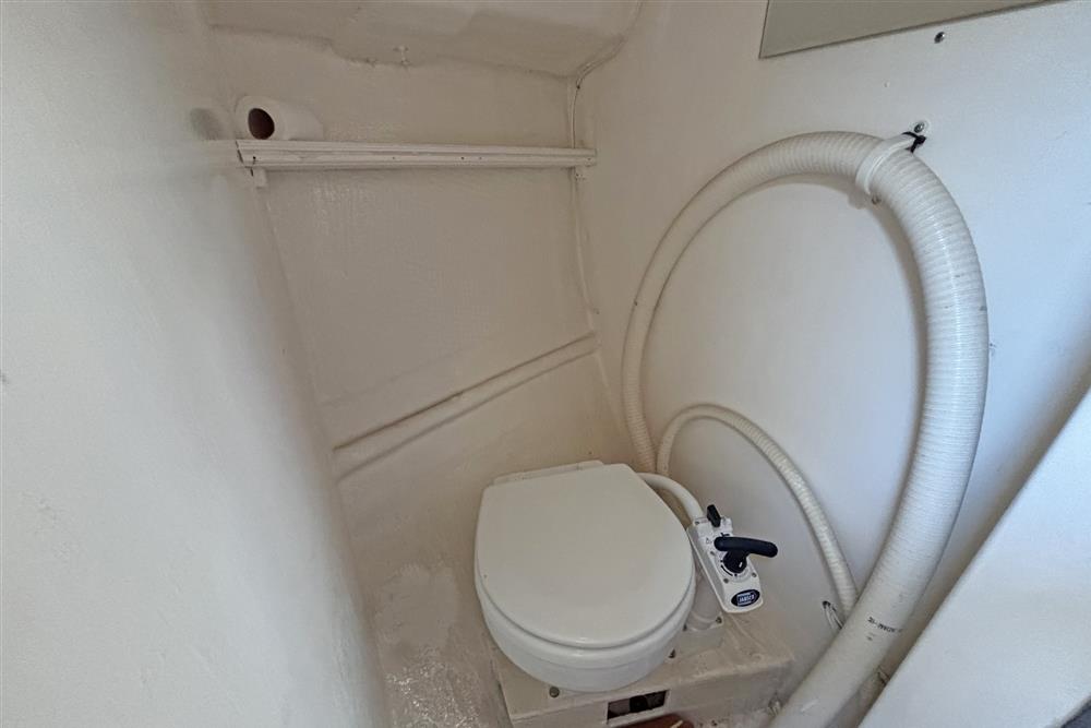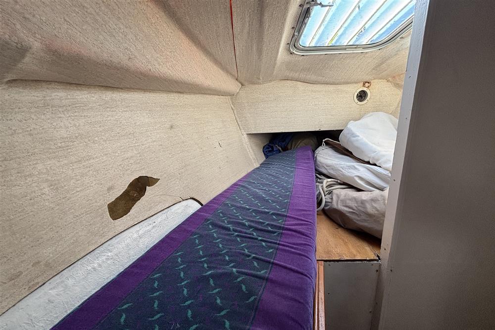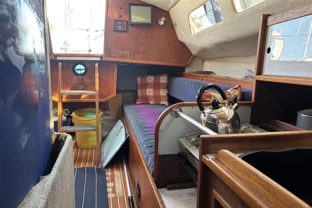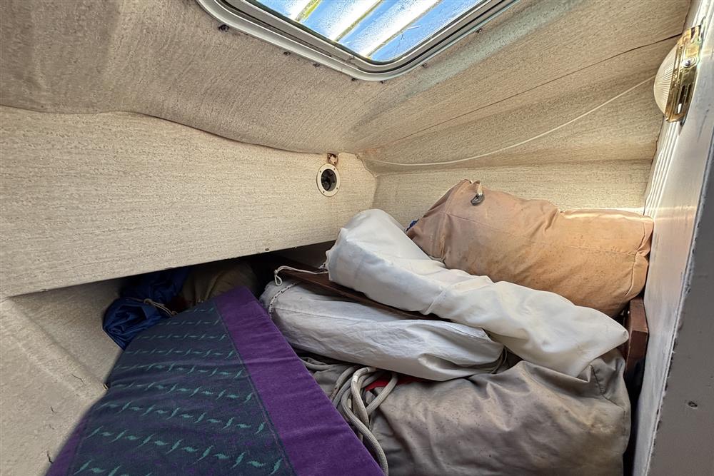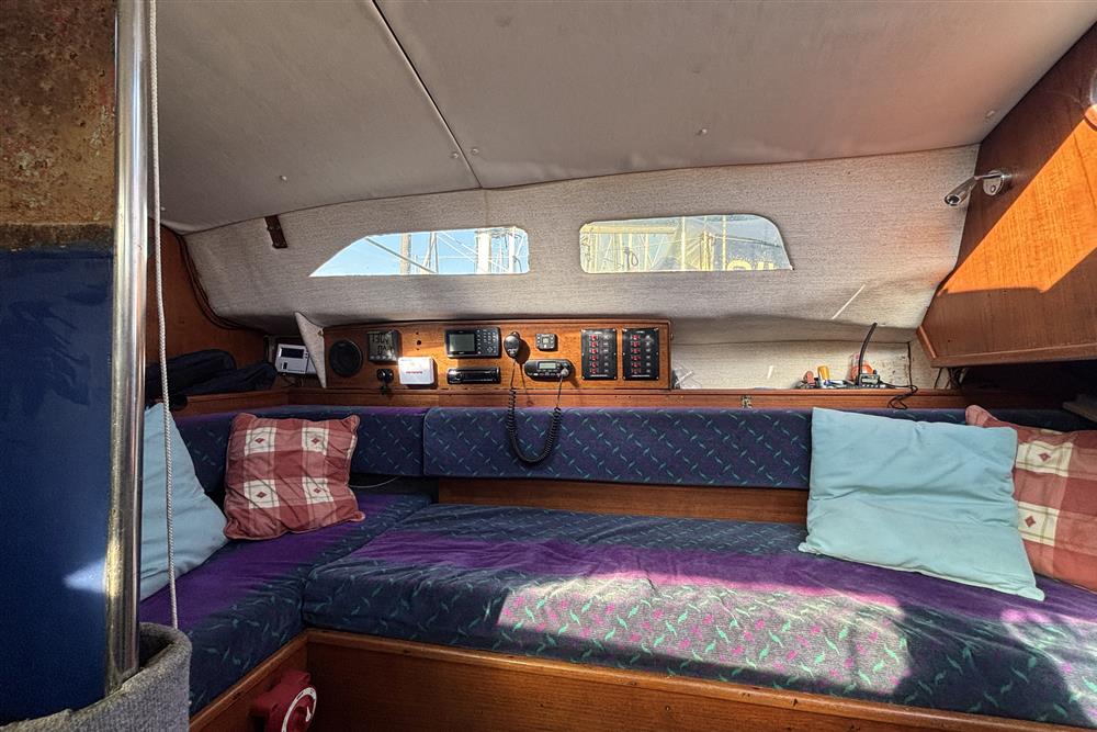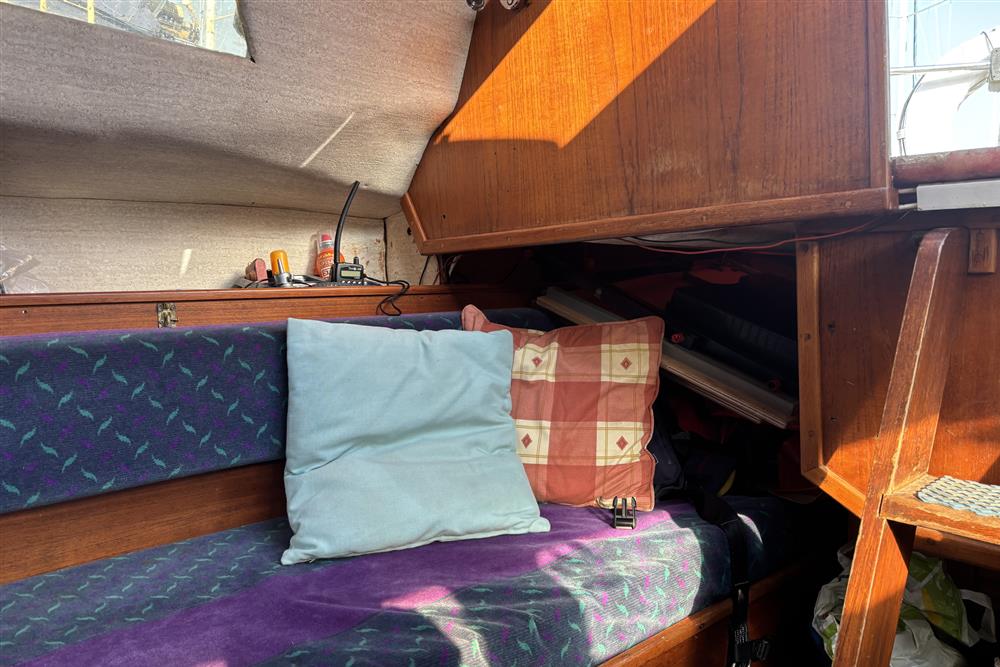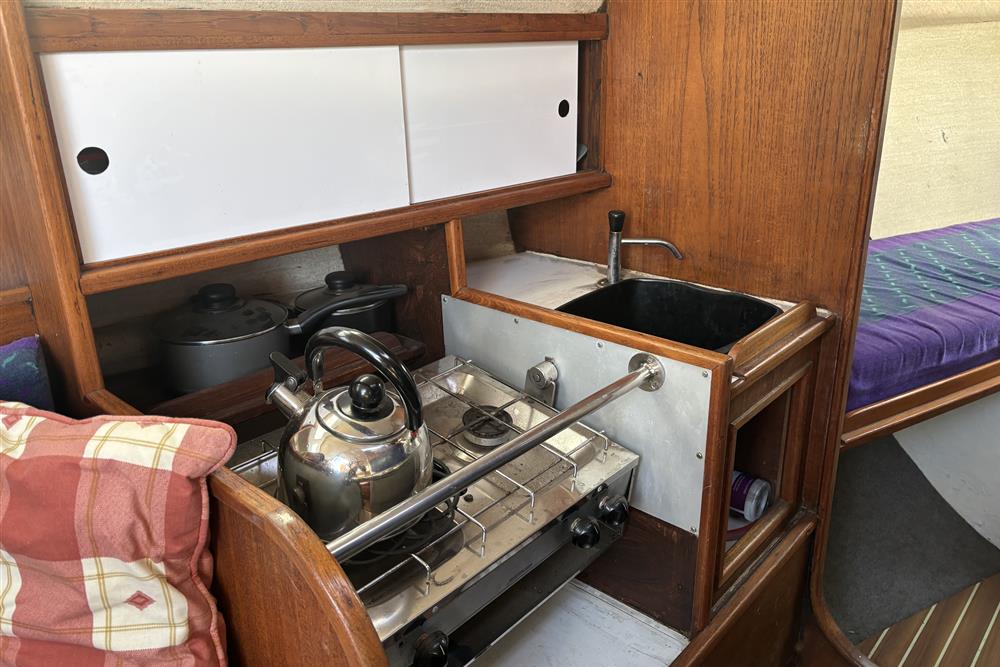 Offering 4 berths in a simple internal layout. Up forward, there is a double V-berth with stowage underneath and a deck-opening hatch. A manual marine toilet is fitted to starboard. Stepping aft into the saloon, there is a small linear galley to port with a two-burner gas hob and a single sink with a manually pumped cold water supply. Two single settee berths are located either side of the keel box. Removable saloon table to centre.