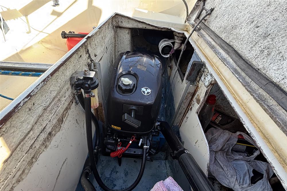 The four-stroke Tohatsu 6hp long-shaft outboard (new 2024) is located on the cockpit transom. Approximately 46 engine hours. Manual start. 10-litre auxiliary fuel tank. Annually serviced (last serviced December 2025).