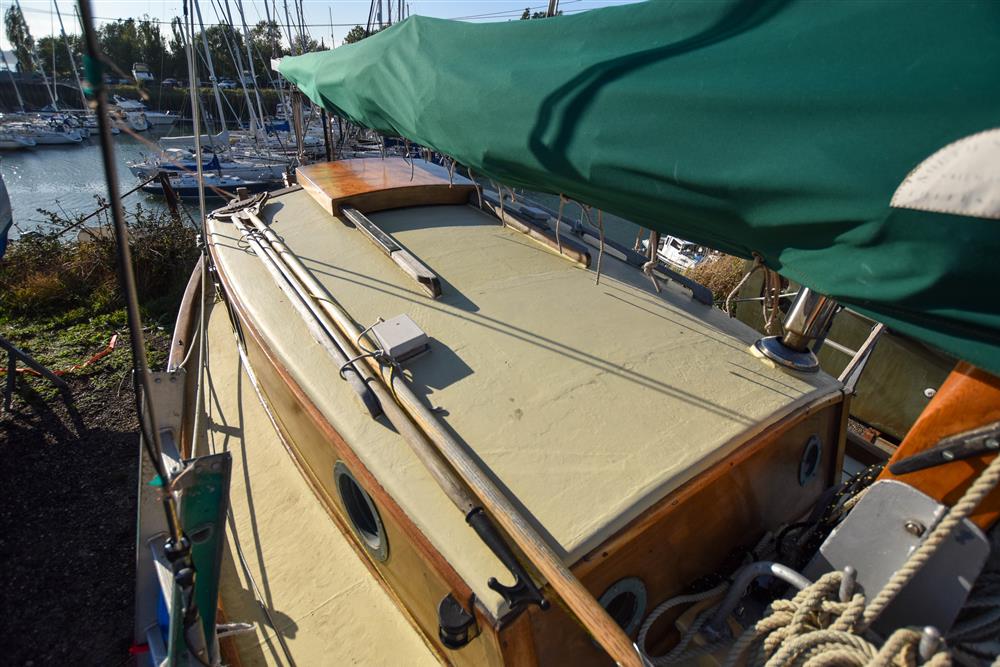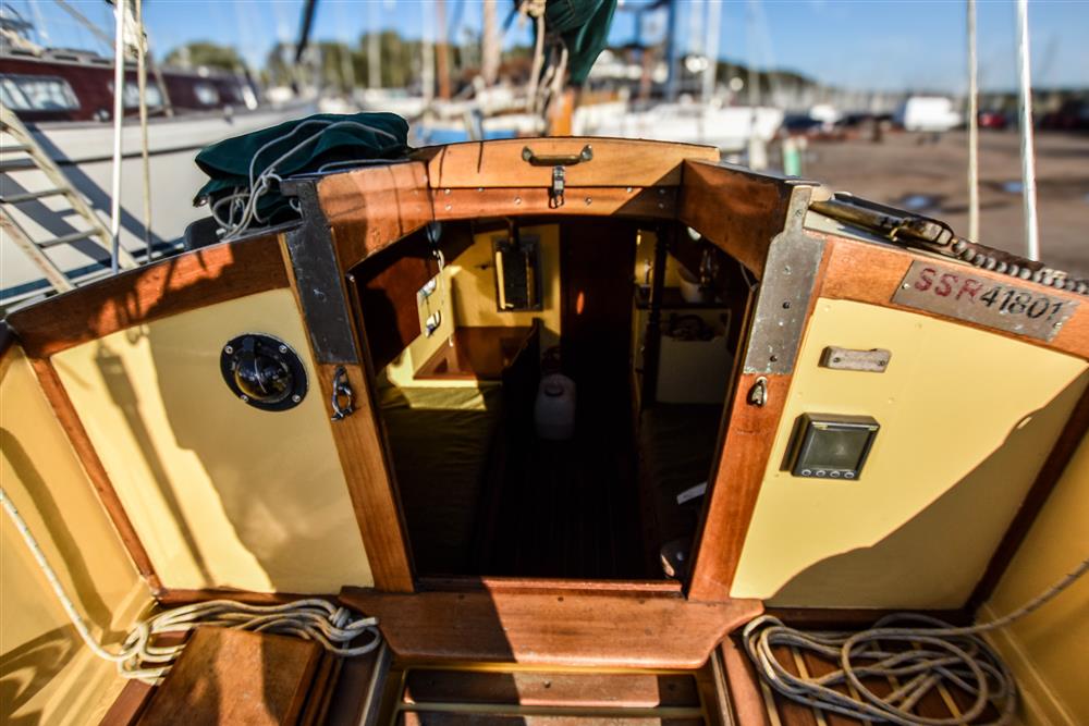 Built in 1981 to a David Channell design. GRP hull with dark green painted topsides. Teak rubbing strakes. Plywood deck with a painted non-slip finish. Teak toe rail. Teak coachroof. Aft self-draining cockpit with teak slates. Tiller steering to a transom hung rudder. Long keel with an encapsulated keel.