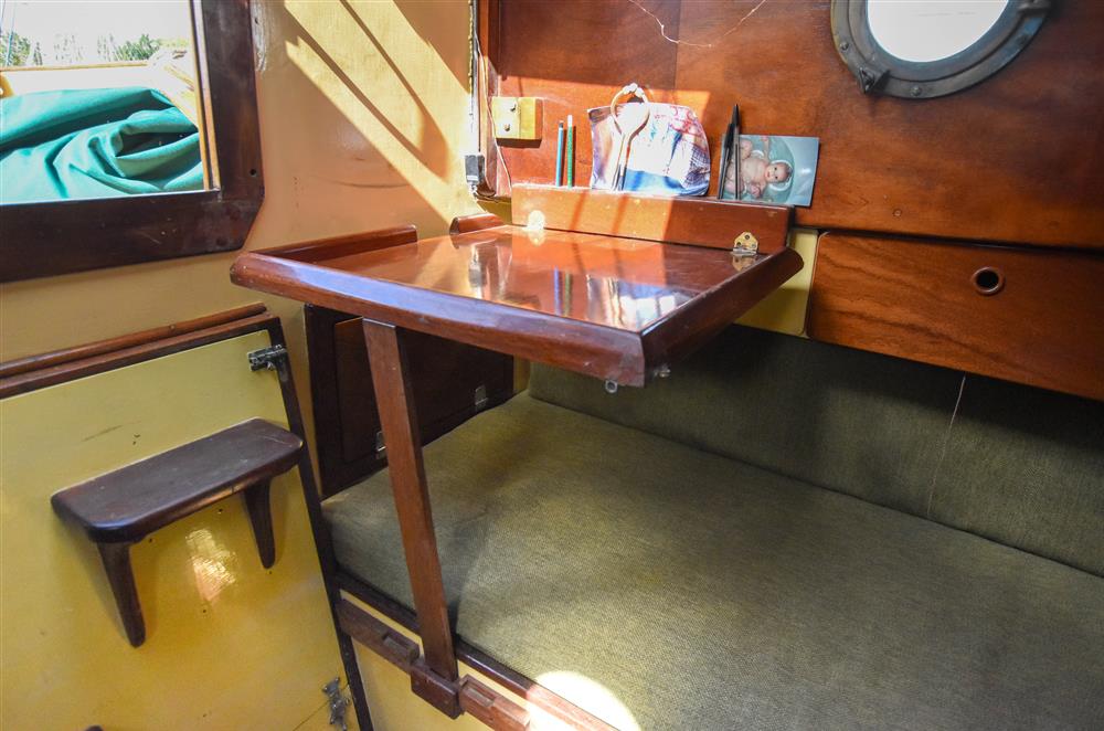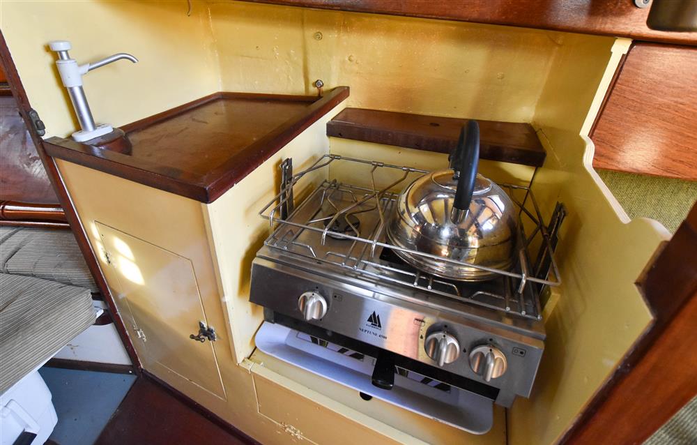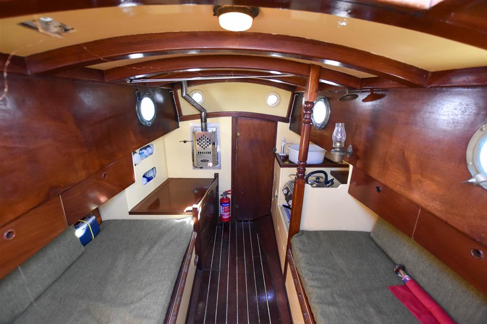 The compact interior offers up to 4 berths. Up forward there is a V berth. In the saloon, there is a single settee berth to port with a quarter berth behind. Opposite to starboard is the linear galley comprising of a Neptune two-burner gas hob with grill. Galley sink with a manually pumped cold water supply. Taylors diesel cabin heater. Jabsco manual marine toilet.