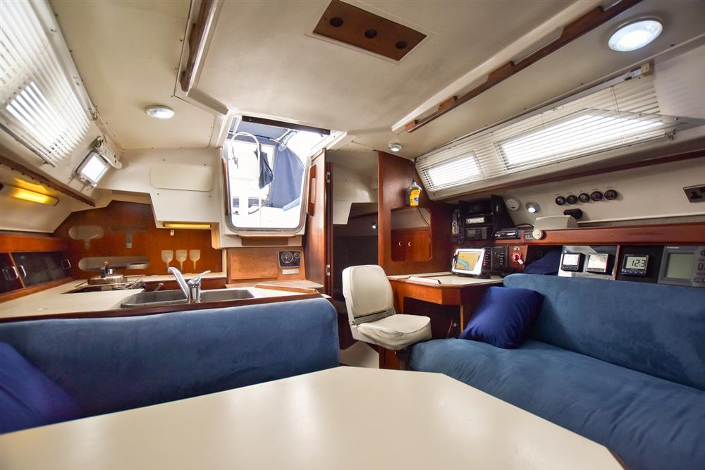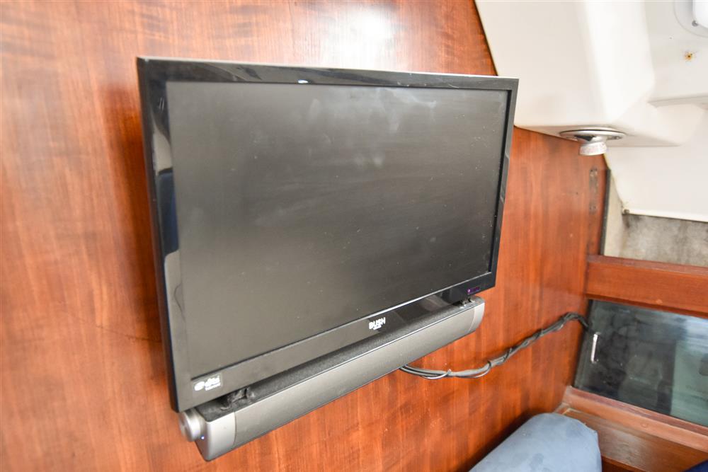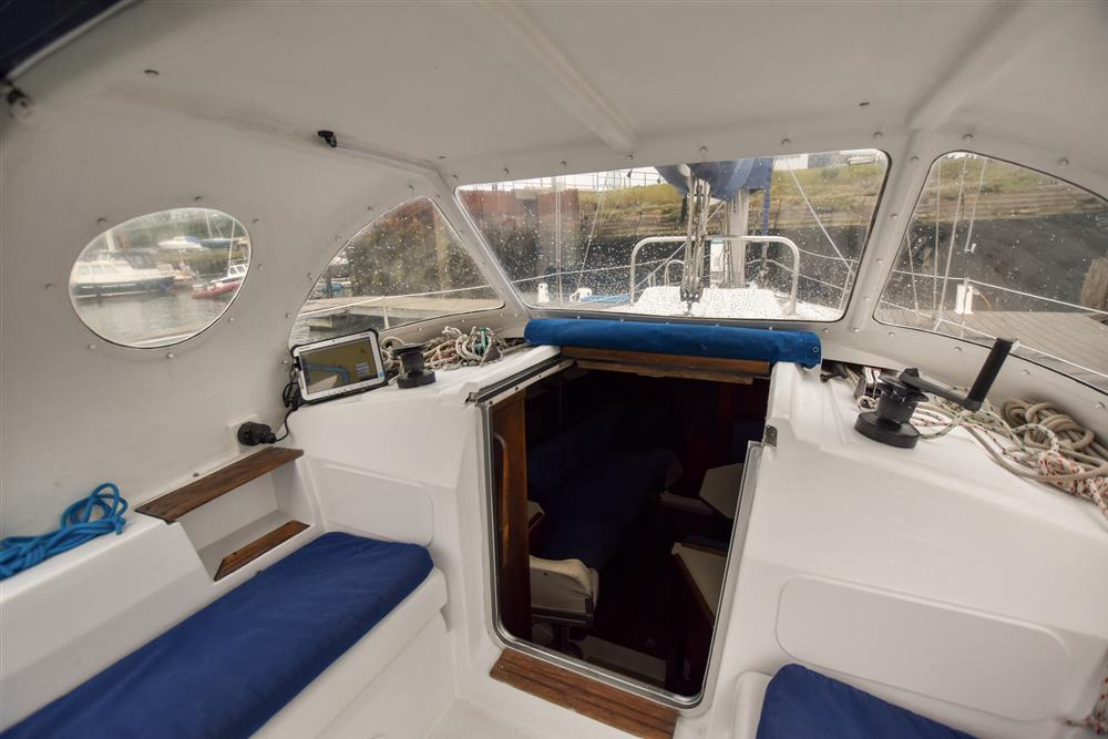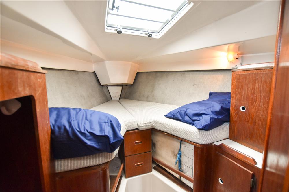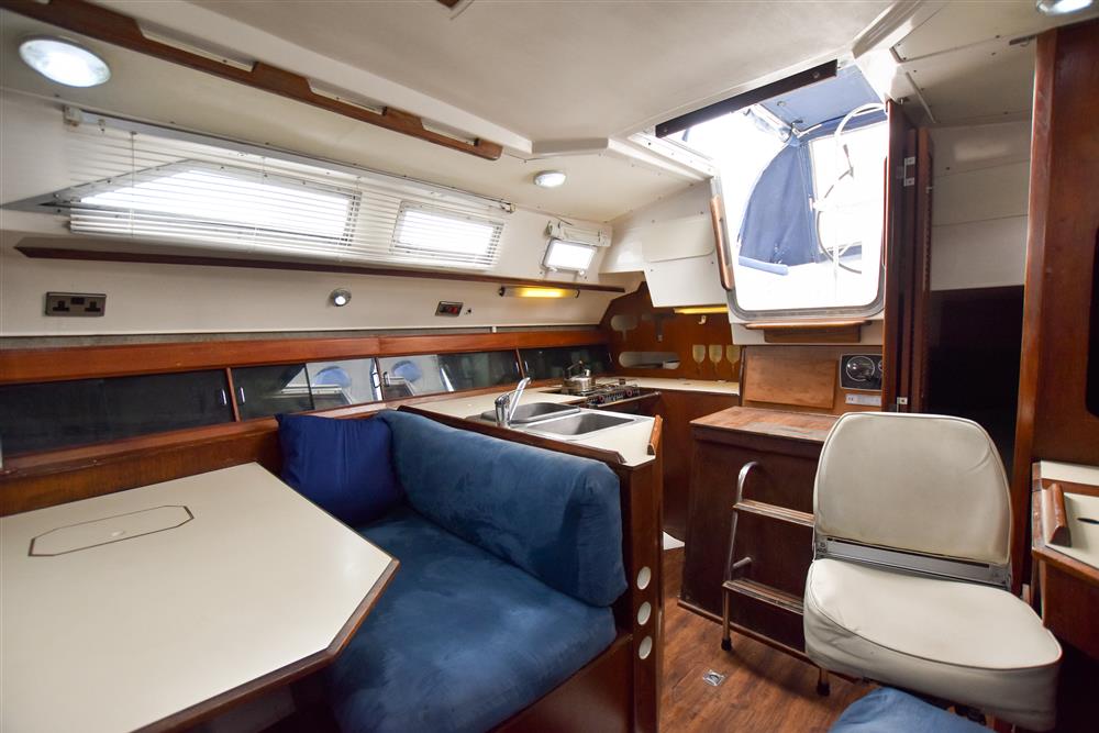 Up to seven berths in two cabins plus the saloon with excellent headroom and teak joinery. The forward cabin has a double V berth. Plenty of stowage under the berths, in hanging locker and stowage lockers. Heads compartment across the boat with stainless steel sink with hot and cold pressurised supply to port in vanity unit and marine toilet plus shower unit to starboard. The saloon has a large dinette to starboard (table drops to make a double berth) plus a settee berth to port. Aft of the settee is the outboard facing chart table with a dedicated PVC armchair. The very large U-shaped galley is to starboard and is equipped with gimballed 2 burner bio-ethanol cooker with microwave oven, fridge, double stainless-steel sinks and masses of storage. The aft cabin is to port and has a single berth that converts to a double. Diesel fired central heating system (4Kw - new in 2025). Hot and cold pressurised fresh water system heated by 240v immersion and engine. Two x 200 litre water tanks. Blinds to saloon windows. Curtains. Blue saloon upholstery. Bulkhead mounted TV.