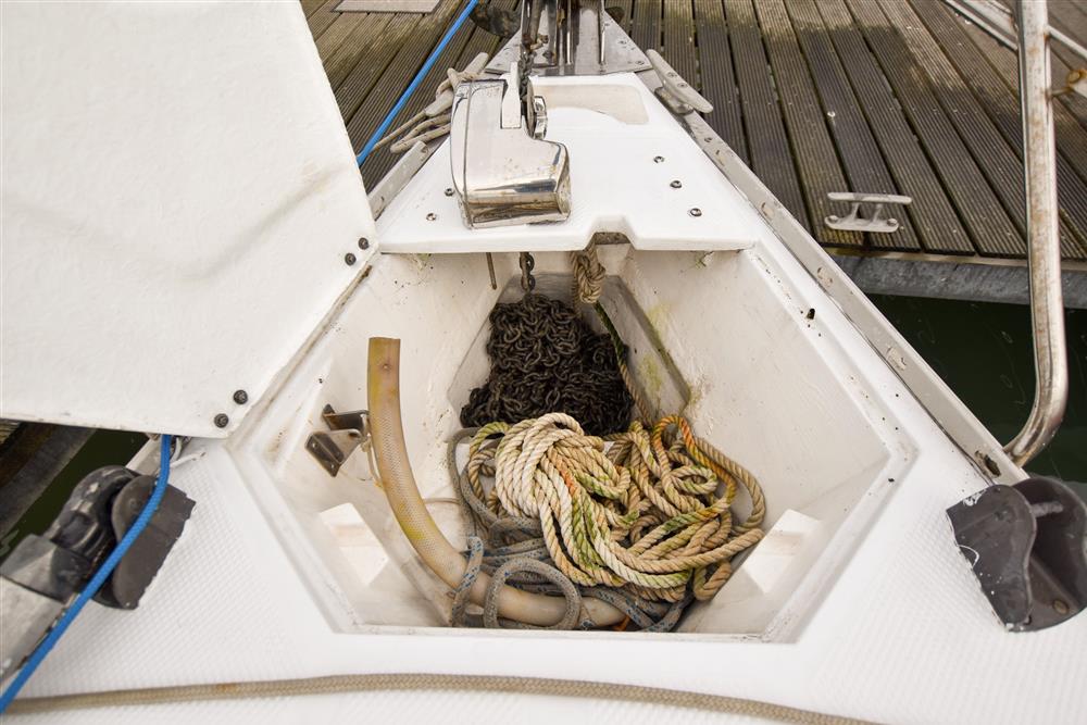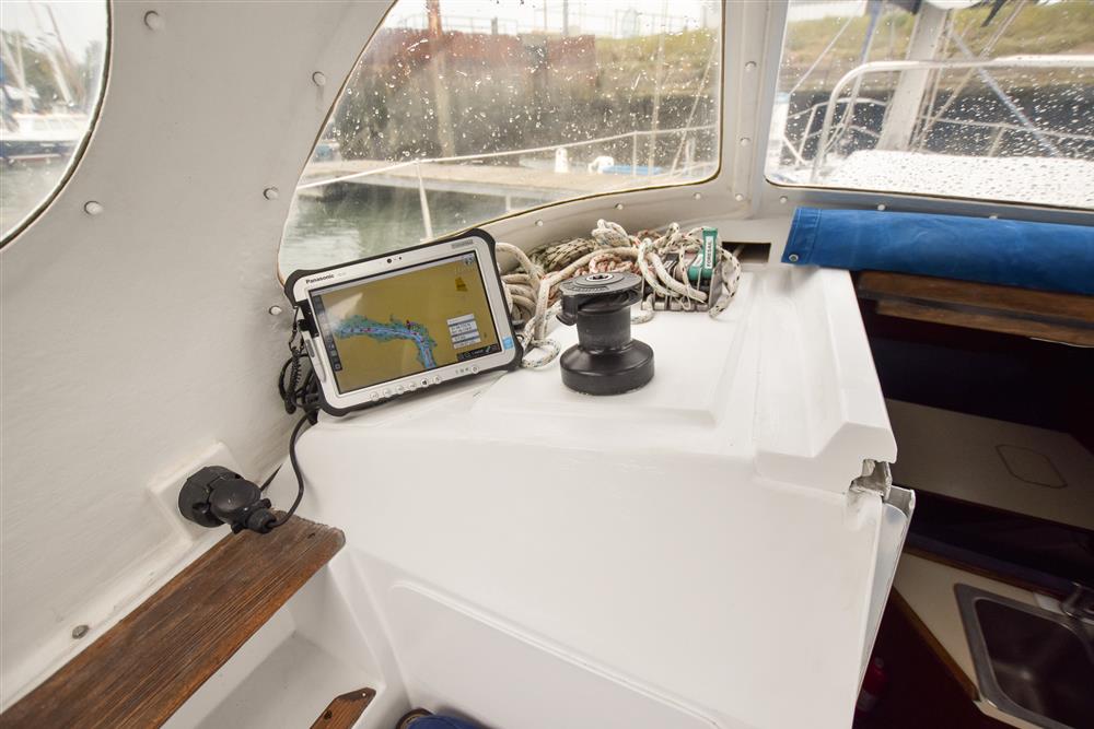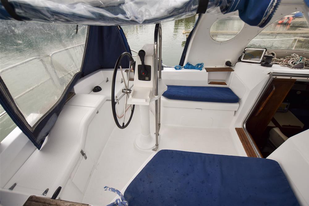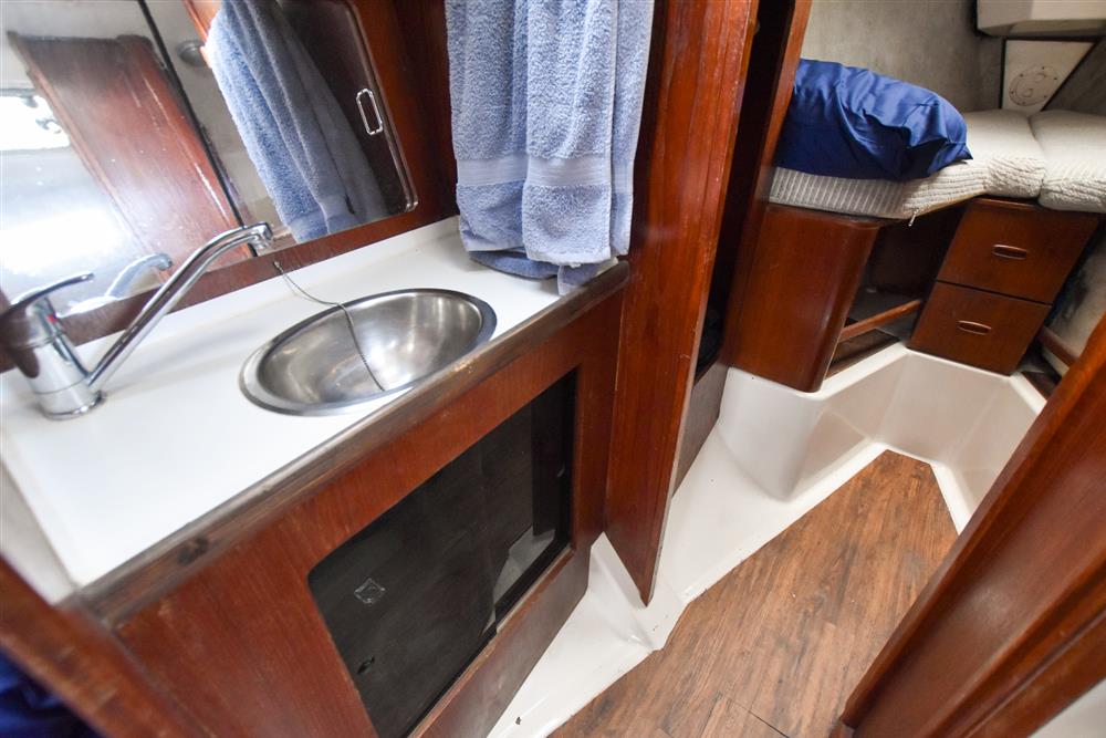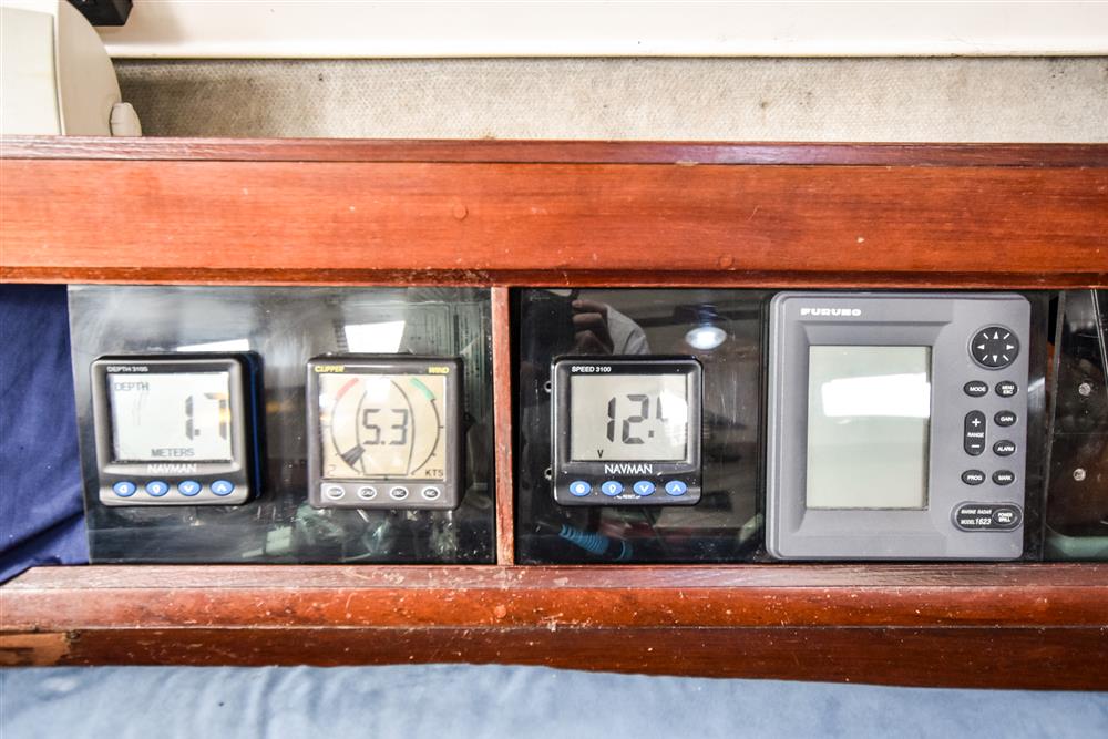 Located under companionway is the Vetus N3.29 marine diesel engine (new 2022). 29hp. Shaft drive to three bladed fixed propeller. 65 litre fuel tank plus holding tank converted for extra diesel capacity. The engine has logged only some 252 hours and has been serviced at 50 & 250 hours. Approx 6 knots cruising at some 1.5 litres per hour consumption (subject to fouling and loading).