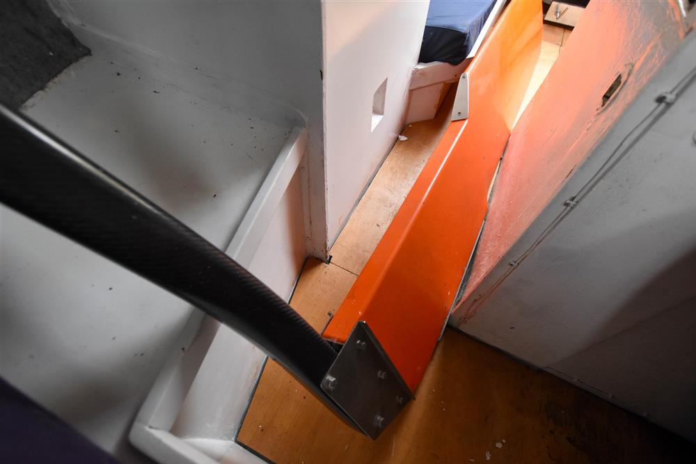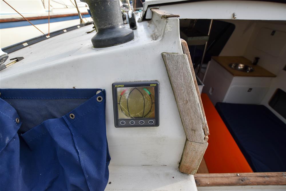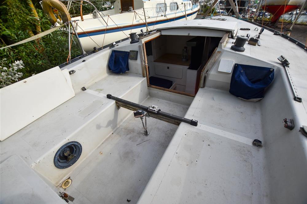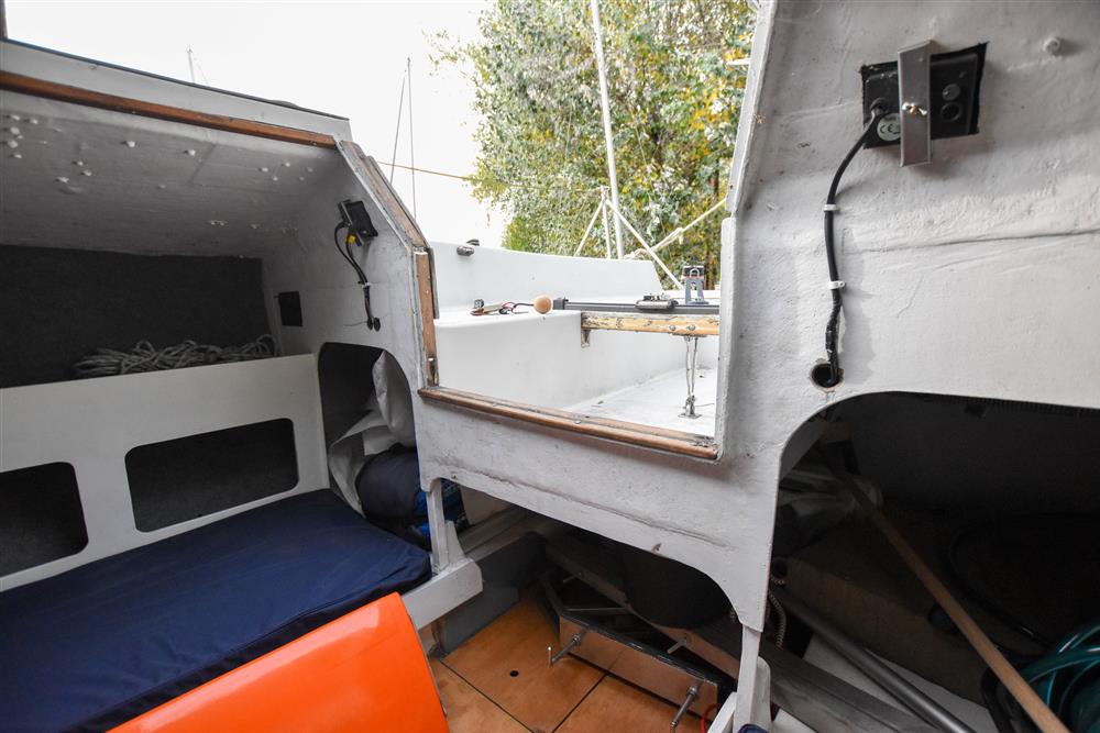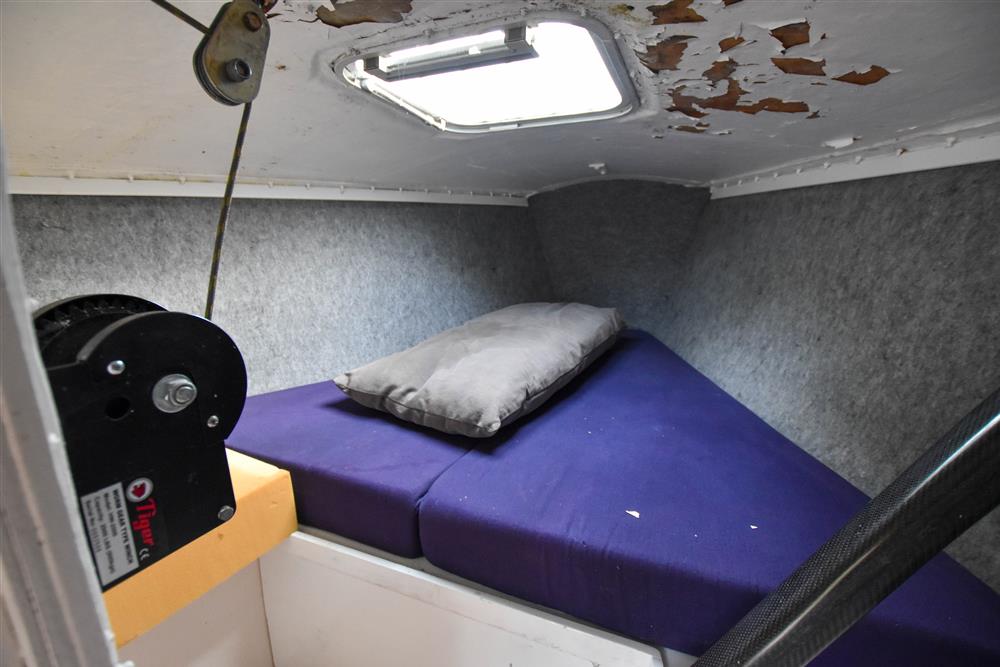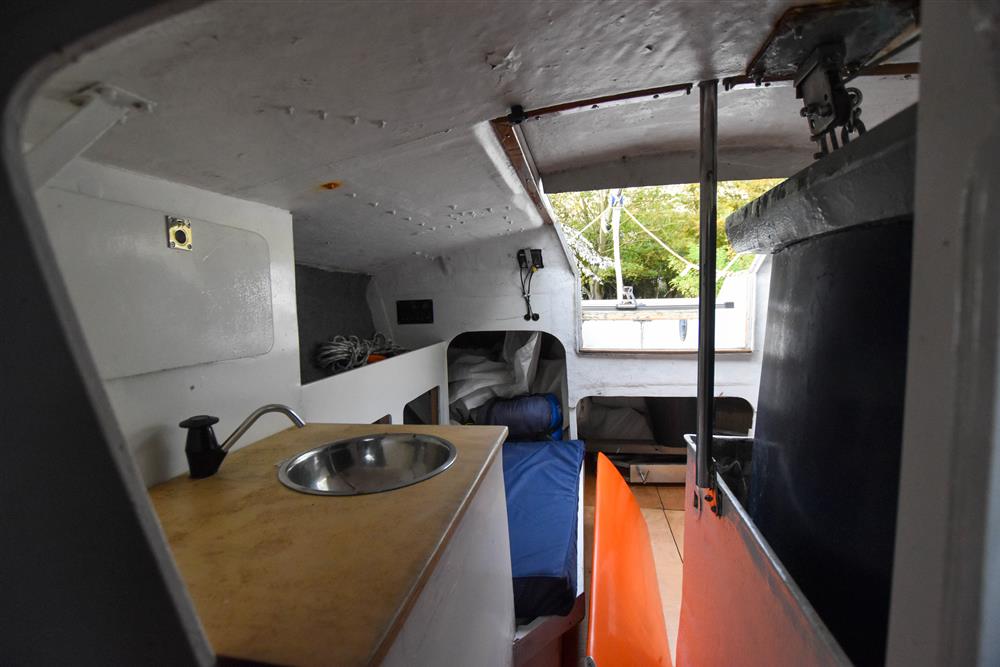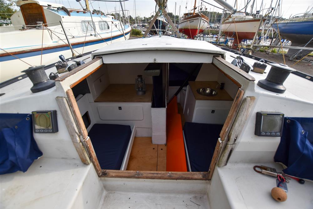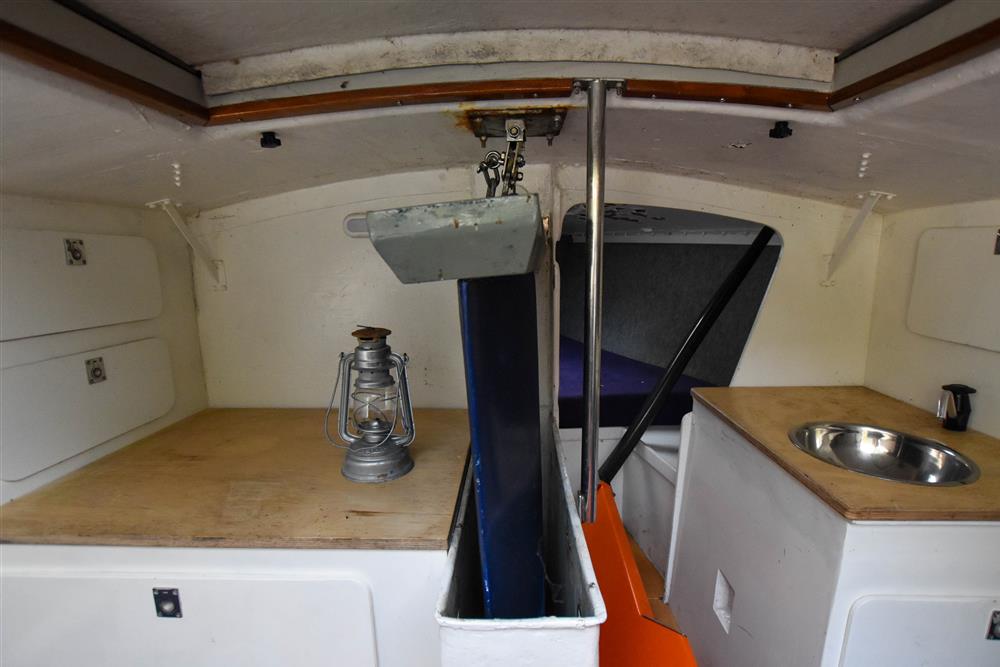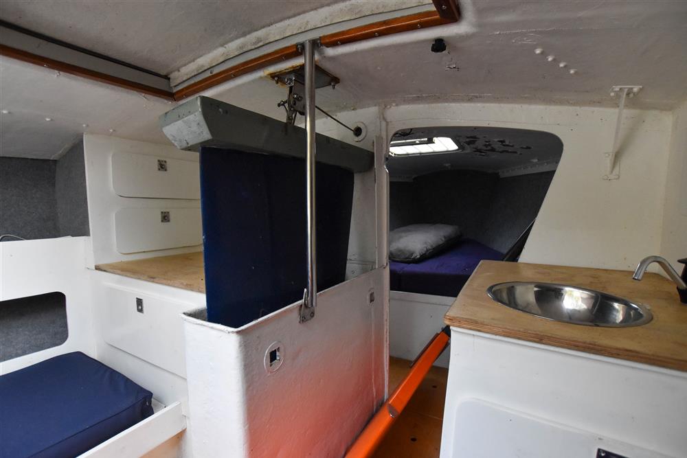 Simple layout offering four berths with sitting headroom throughout. Double V-berth in forepeak and two qyarter berths. Small wash basin to starboard with a manually pump water supply. Blue upholstery.
