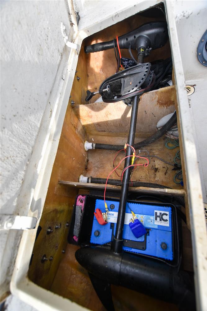 Located on the transom hung outboard bracket is the 12 volt electric outboard.