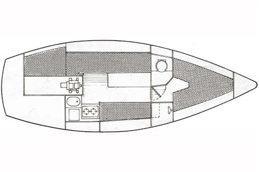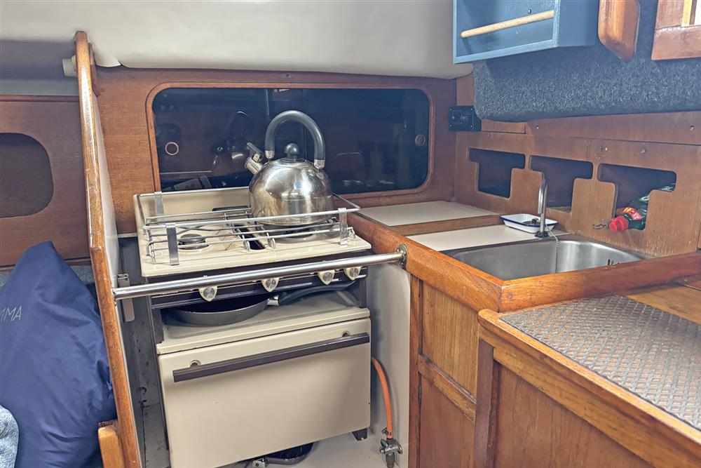 Located under companionway, Volvo Penta 2002 18 hp 2-cylinder diesel engine. Seawater cooled. Single lever controls with electric start. Shaft drive to fixed pitch 2-bladed propeller. Recent replacements include new sea water pump, new stainless steel exhaust elbow, new stern and cutlass bearings plus engine insulation fitted. There is a new starter motor ready to fit.