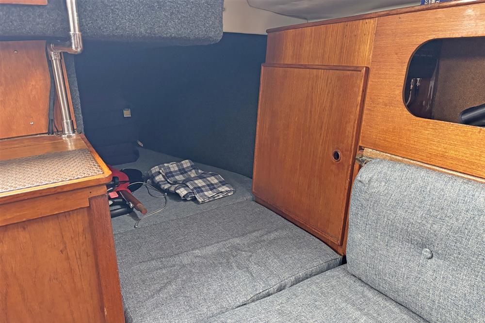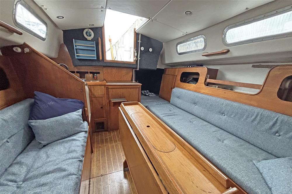 The accommodation is fitted out with teak joinery throughout and offers up to 6 berths in 2 cabins with approximately 6ft headroom. The forecabin is fitted with a V berth with infill and beneath berth stowage, shelves, and opening hatch to foredeck. The separate heads compartment to port with marine toilet and pullout washbasin, with hanging locker opposite. Stepping aft into the traditionally laid out saloon, there are two settee berths (port can convert to a double) either side of a central table with built in storage, and good storage in a range of lockers. The galley is aft and to starboard and equipped with a gimballed Flavel Vanessa gas cooker with two burners, grill, and oven, stainless steel sink with manually pumped cold water supply, new fridge unit to cool box, and storage. Opposite to port, is the quarter berth with large storage cupboard and electrical distribution panel. All head linings replaced in 2024/5. New LED reading lights in saloon and quarter berth.