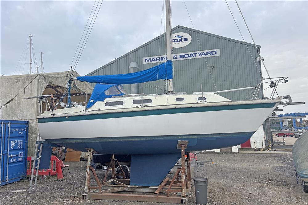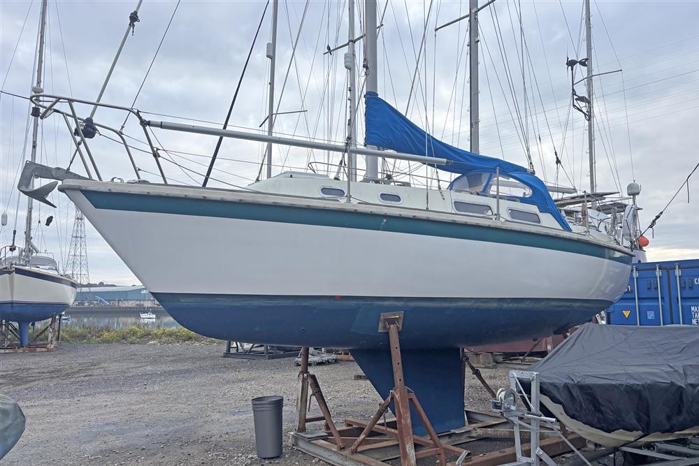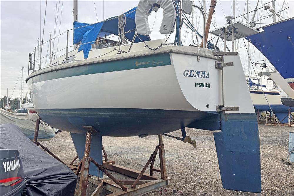 Westerly Griffon built by Westerly Yachts in 1984 to an Ed Dubois design. White painted (2025 in Epifanes) GRP hull, superstructure, and decks with grey painted non-slip surfaces. Teak toe rail and rubbing strake. Cast iron fin keel. Tiller steering to transom hung rudder. Self-draining aft cockpit. All coachroof windows removed, refurbished and refitted in 2025. Overall a solid boat that is ready to be launched and used.