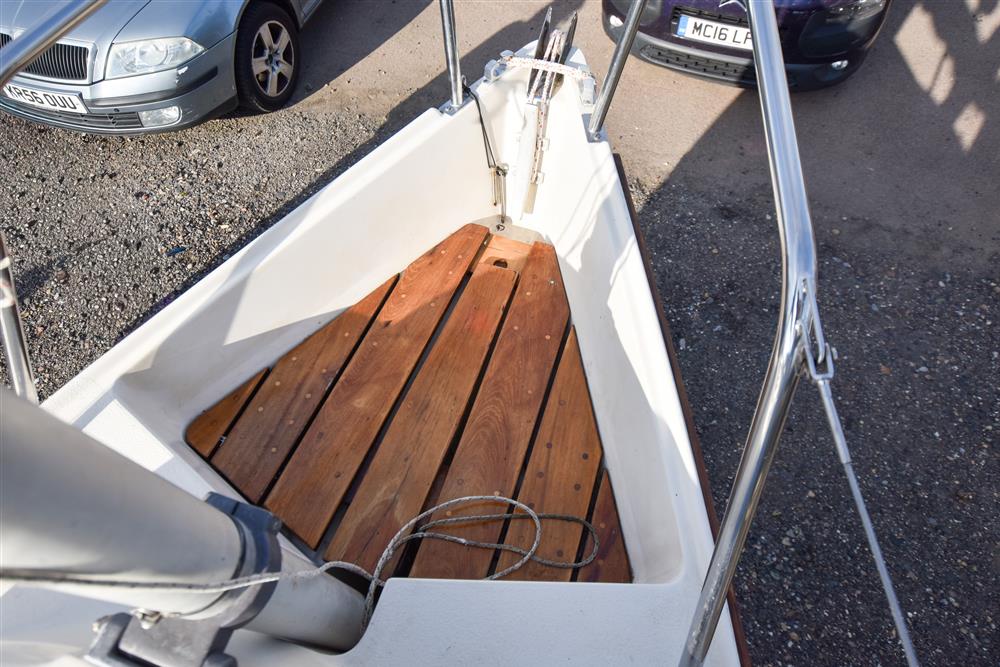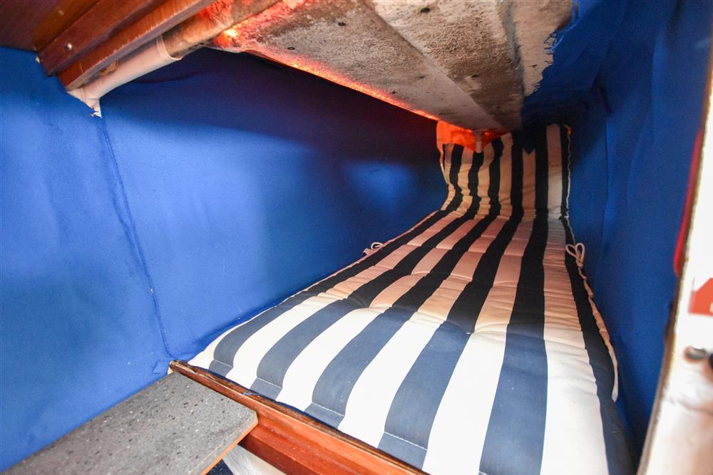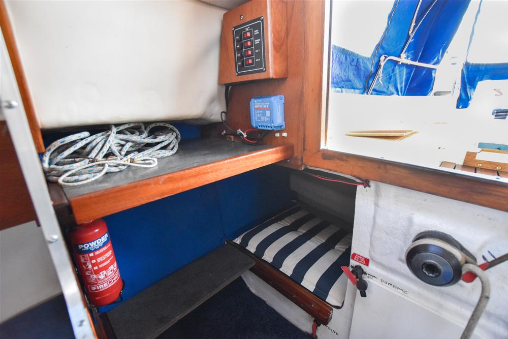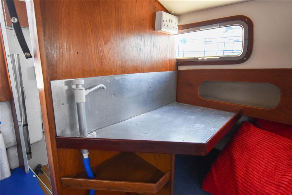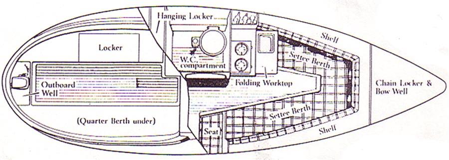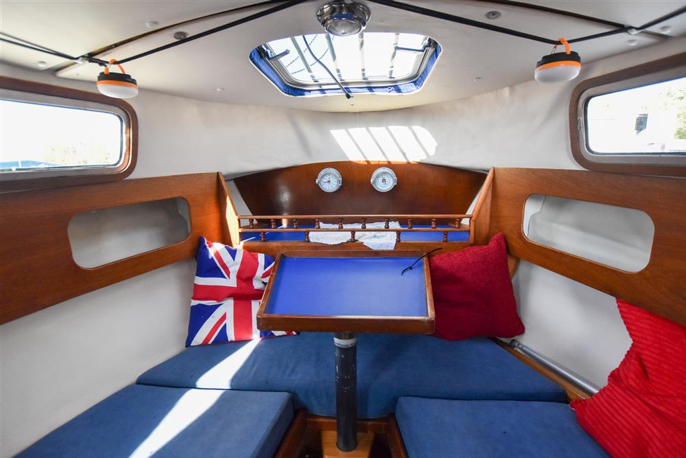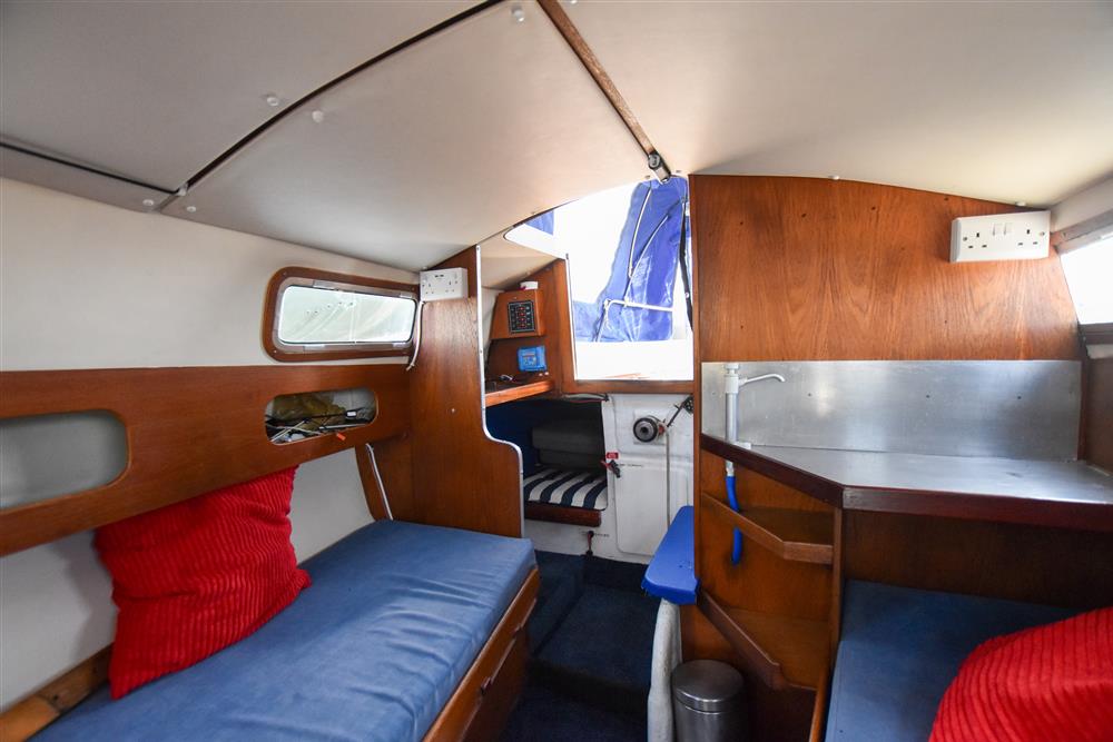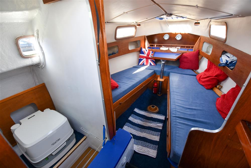 The accommodation offers up to three berths in one cabin. Twin berths forward, with infill converting to a double berth. Stowage above and below. Opening hatch to foredeck. Quarter berth aft to starboard. Head compartment with Porta Potti chemical toilet and retractable wash basin.