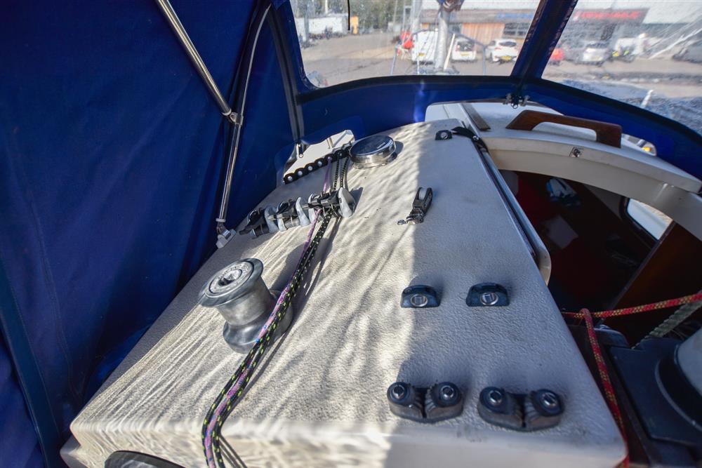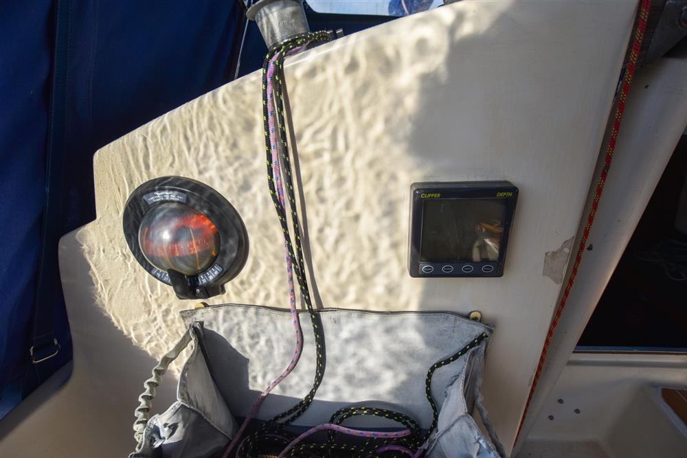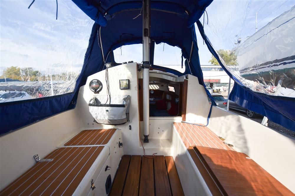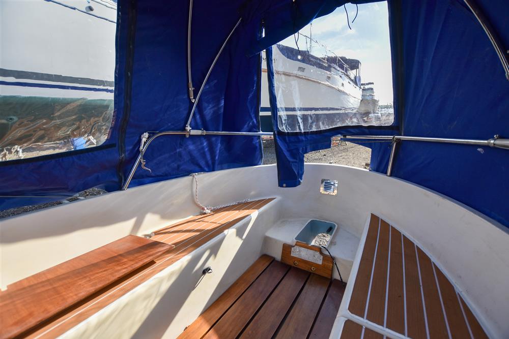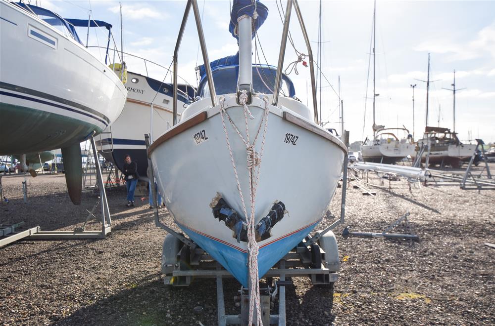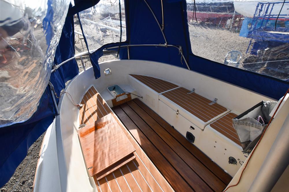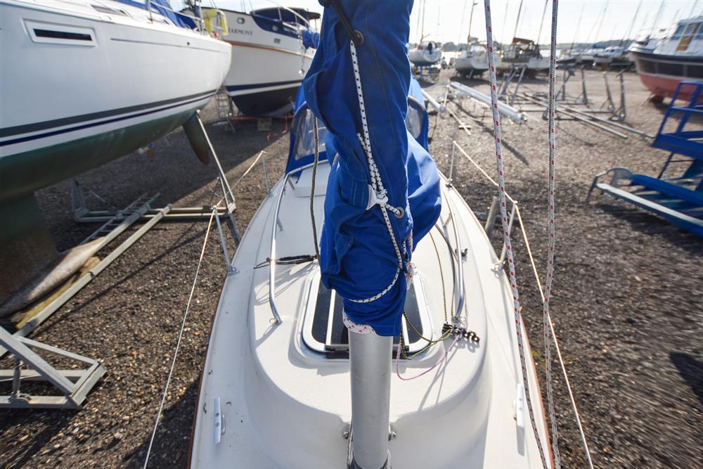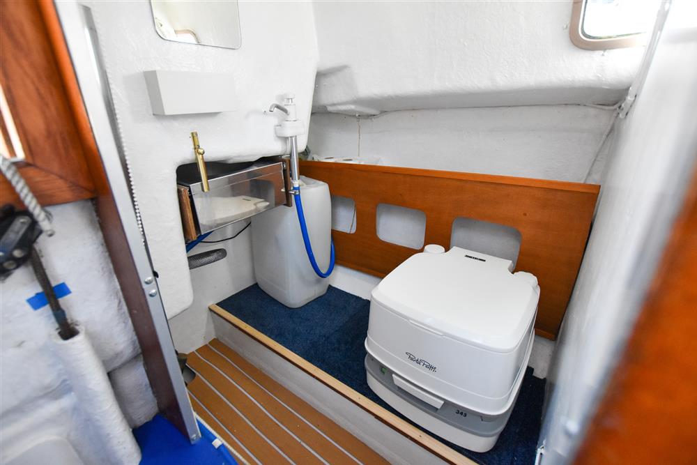 The accommodation offers up to three berths in one cabin. Twin berths forward, with infill converting to a double berth. Stowage above and below. Opening hatch to foredeck. Quarter berth aft to starboard. Head compartment with Porta Potti chemical toilet and retractable wash basin.