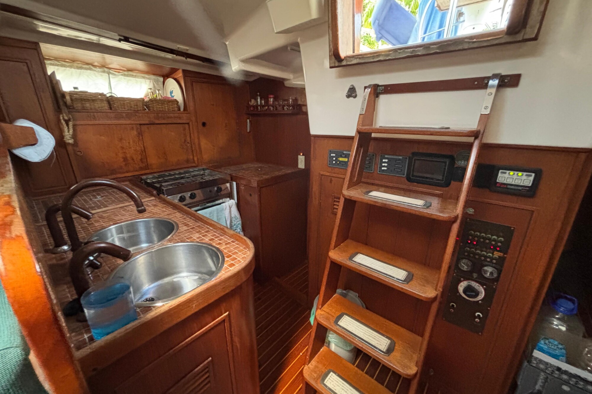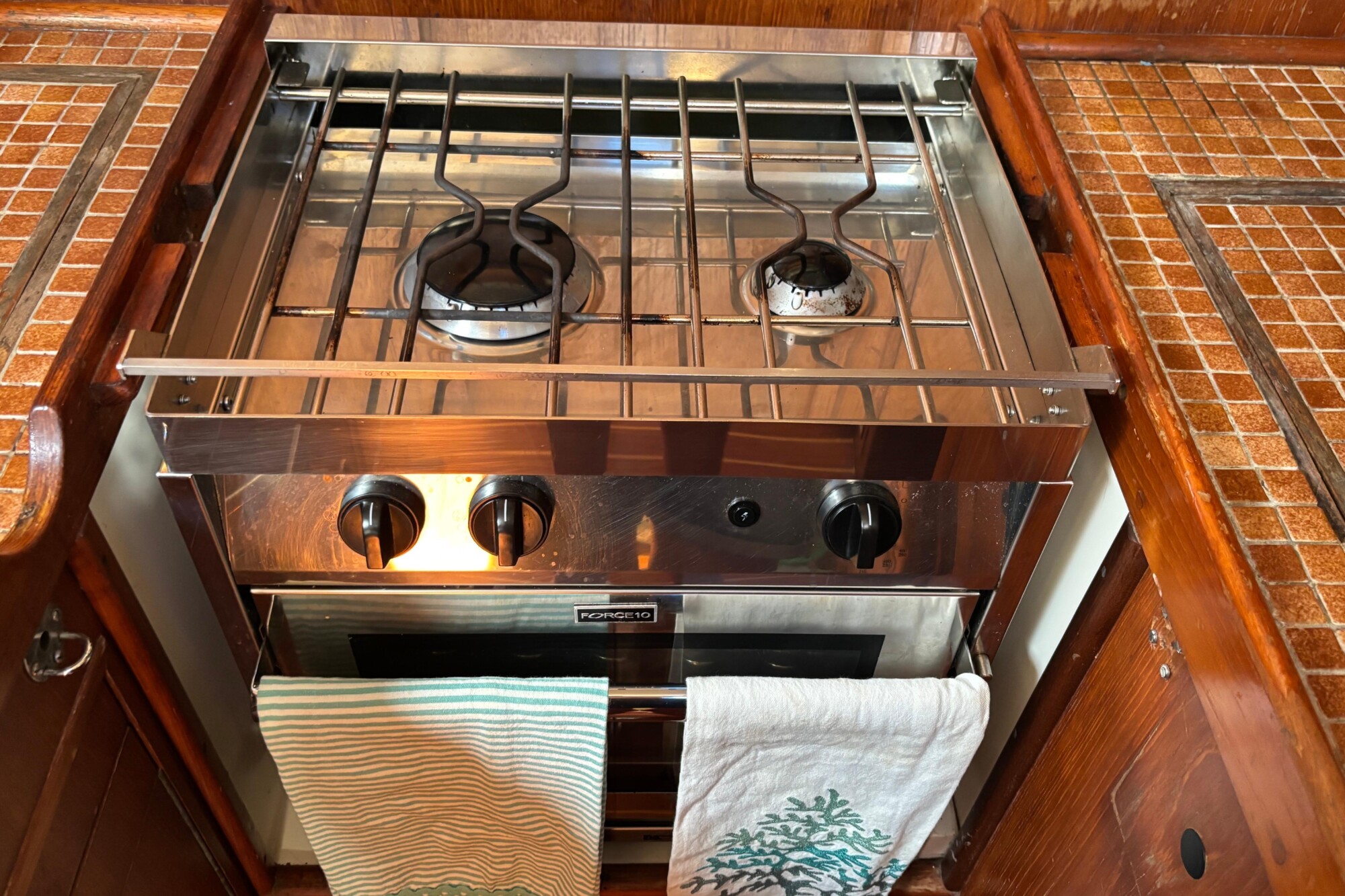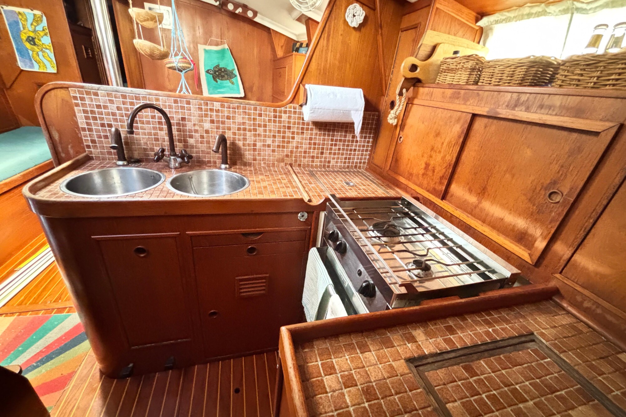 Galley: To starboard, well-appointed L-shaped galley to port, equipped with a Force 10 two-burner gas stove and oven - 2019, top-loading frigoboat keel cooled fridge with small freezer plate and Engle portable freezer. Double stainless-steel sinks, with pressurized water and sea water foot pump. Plenty of lockers and generous count space. Aft of the galley, small workshop room housing the generator and small work area.