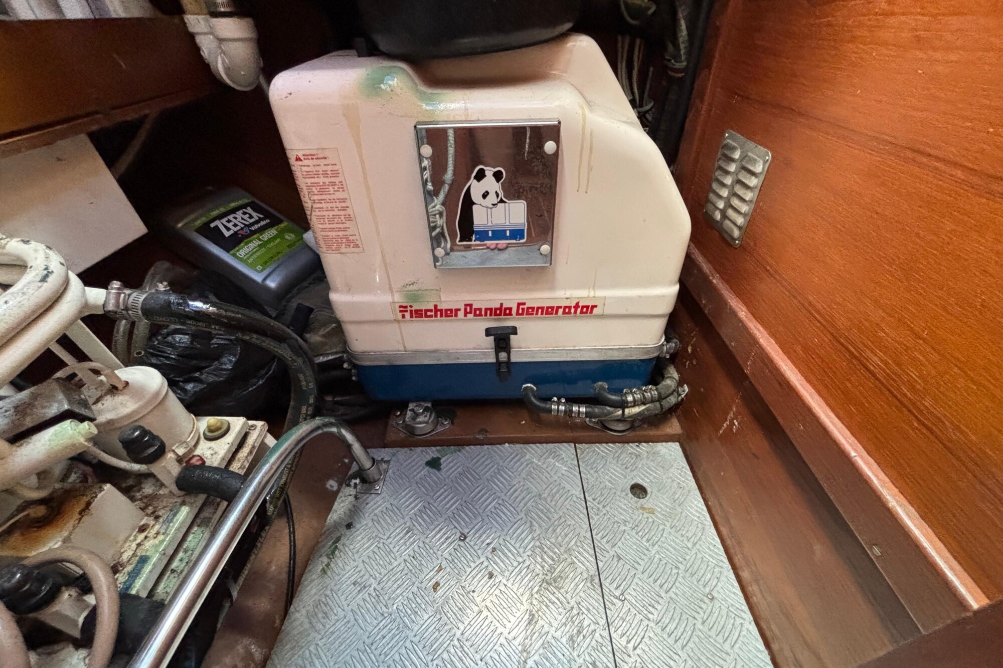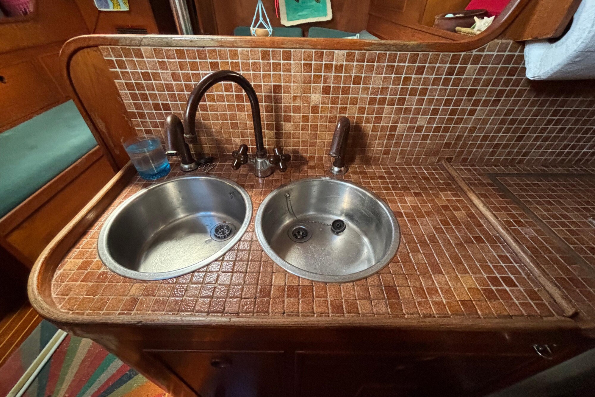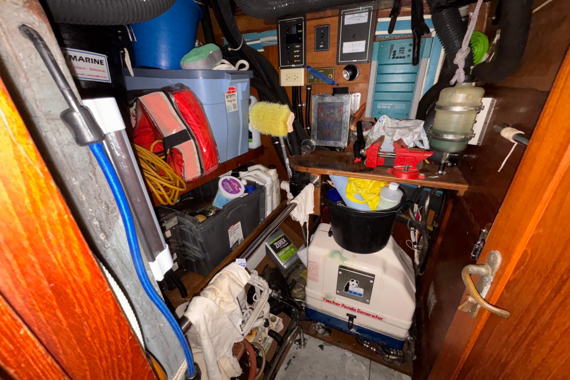 Galley: To starboard, well-appointed L-shaped galley to port, equipped with a Force 10 two-burner gas stove and oven - 2019, top-loading frigoboat keel cooled fridge with small freezer plate and Engle portable freezer. Double stainless-steel sinks, with pressurized water and sea water foot pump. Plenty of lockers and generous count space. Aft of the galley, small workshop room housing the generator and small work area.