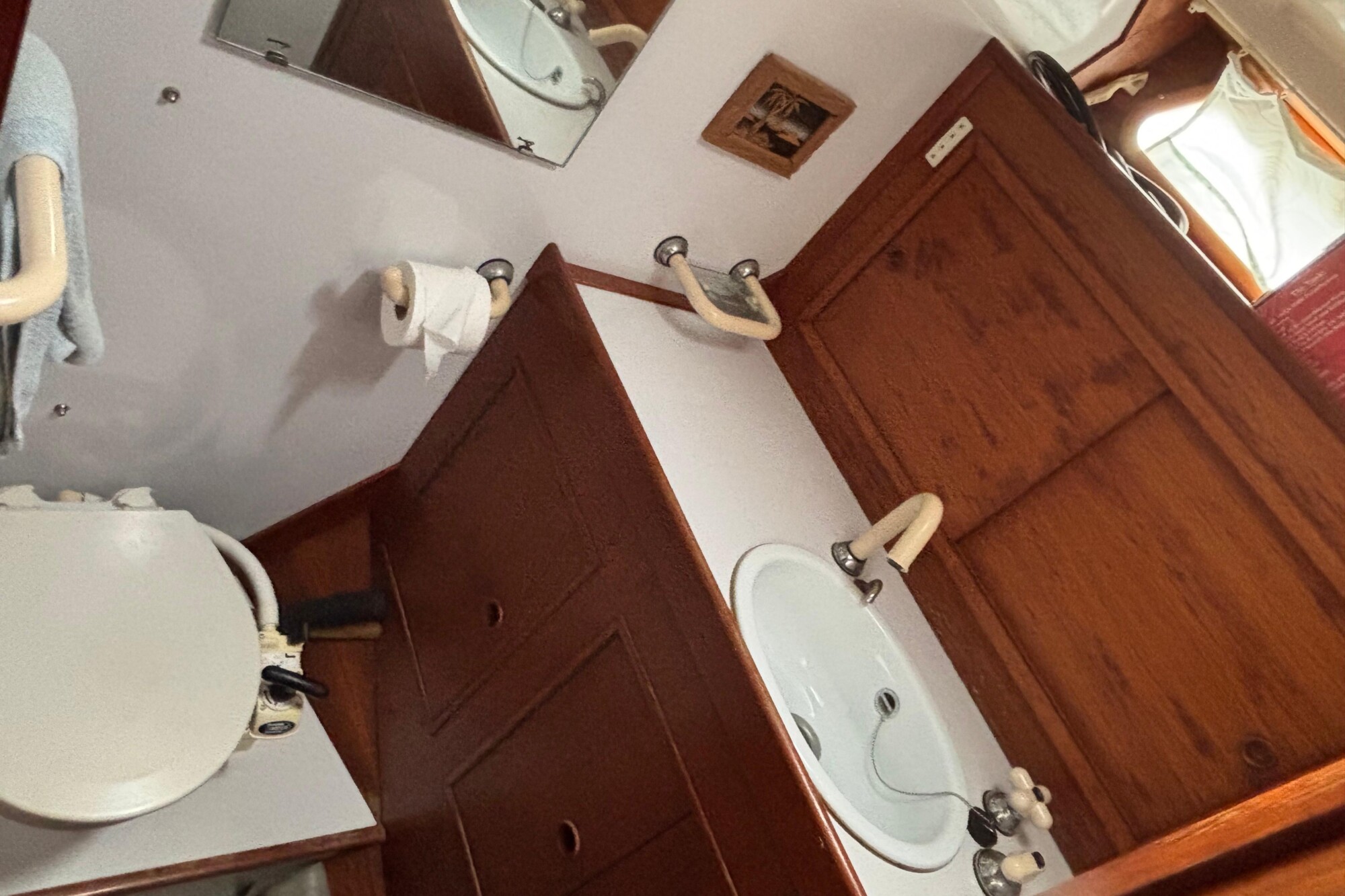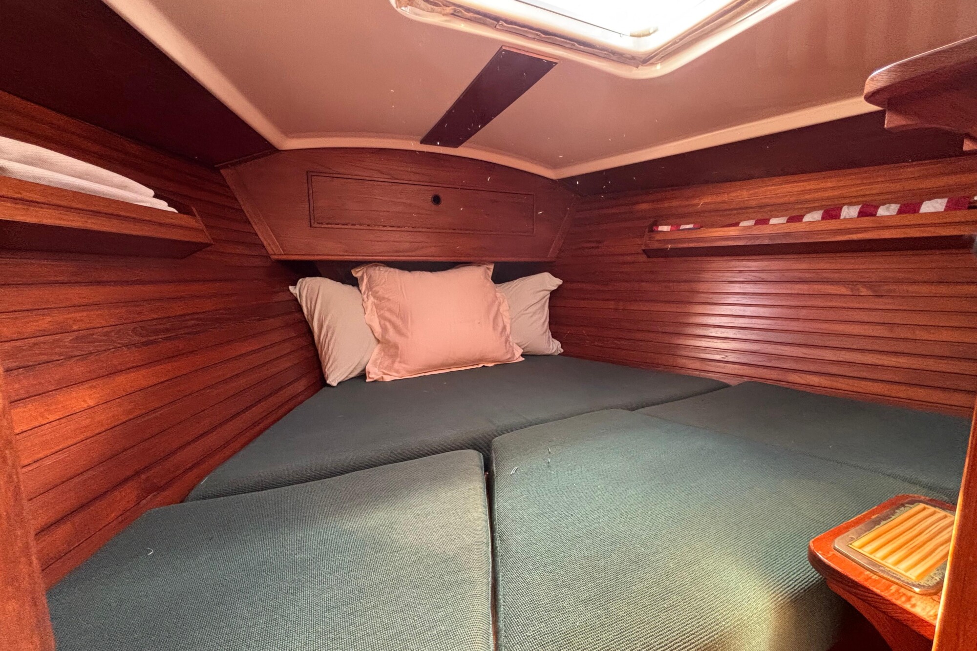 Forward Cabin: A comfortable V-berth with infill converts to a large double. Plenty of storage in lockers and drawers, with natural light from overhead hatches. Access to the forward head compartment with marine toilet, washbasin, and shower.