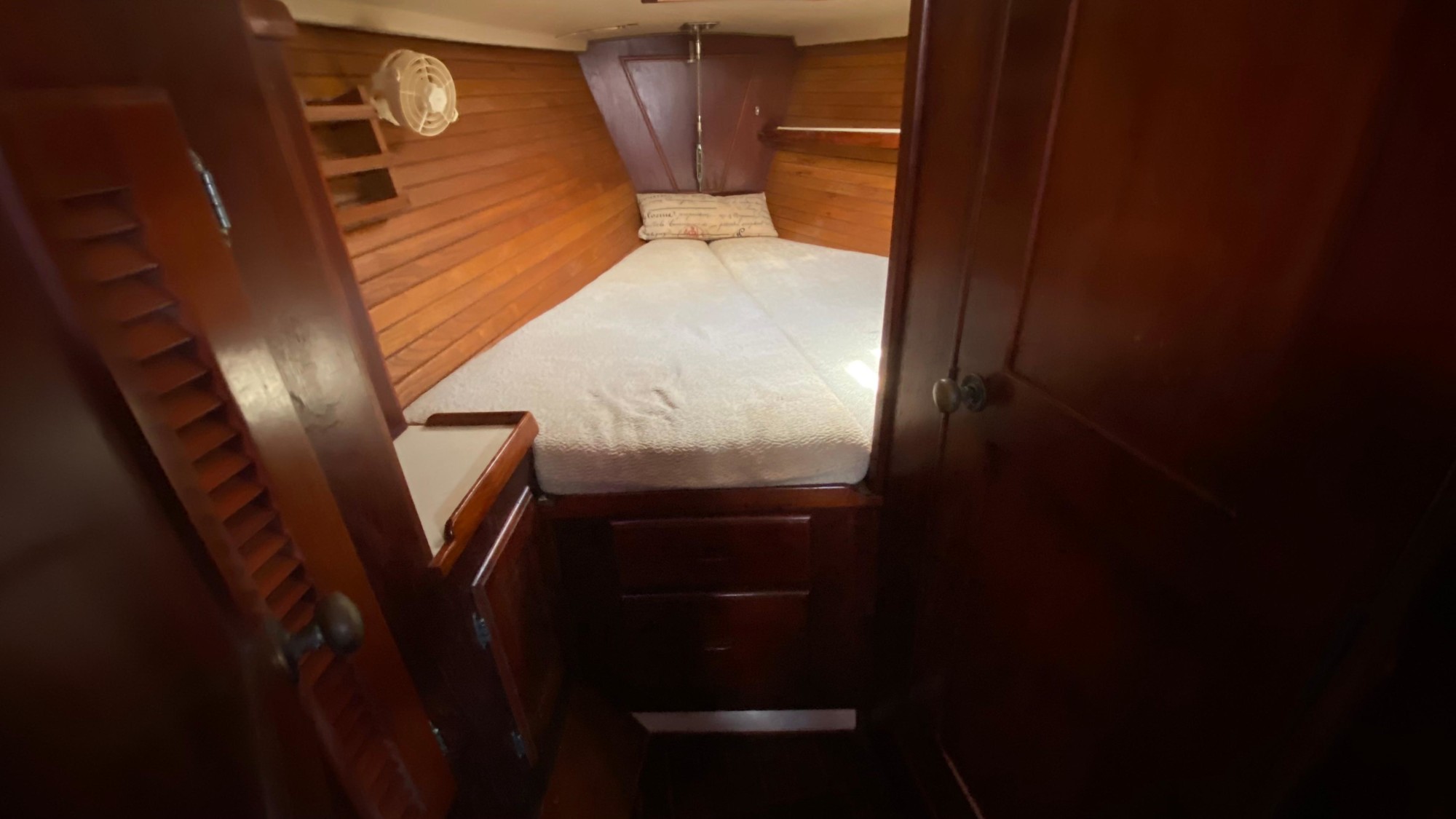 Starting forward is the private guest stateroom which contains a large V berth, anchor locker access, hanging locker to port, and lots of storage. There is private entry to the fwd head and shower cubical. Continuing aft, the main salon has a port settee and wrap around starboard settee. Drop leaf table seats 4 to 6. Port settee converts to double berth, stb settee can be used as a single berth. There is ample storage below & behind settees with large shelves above. There is a second entry into the fwd head from main salon.