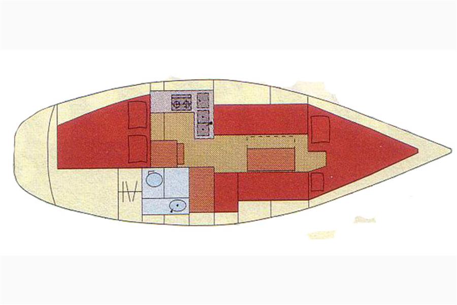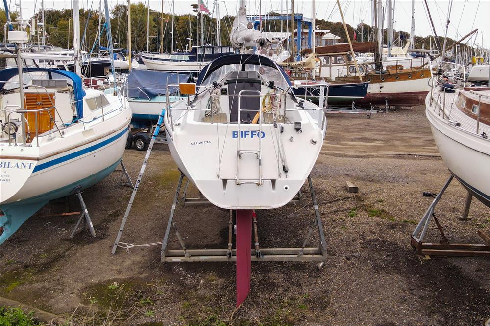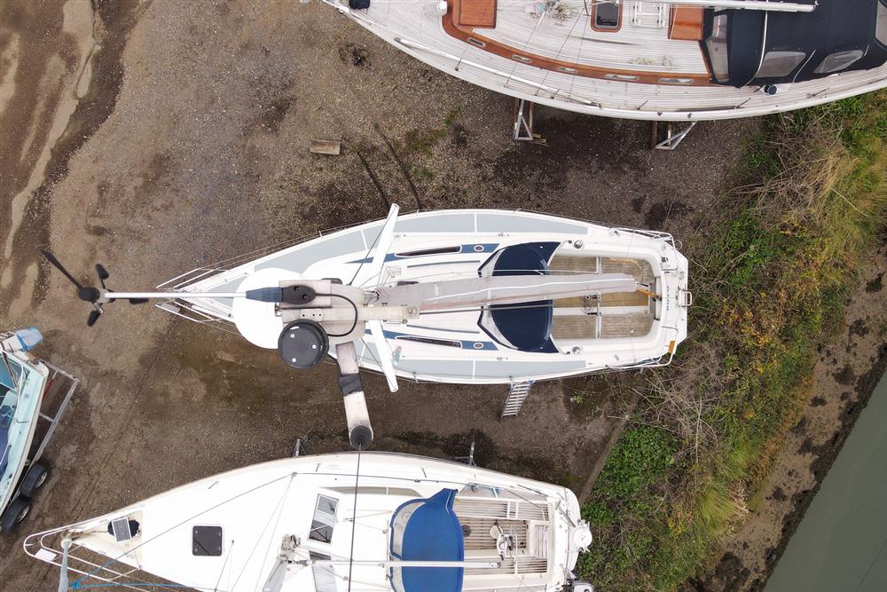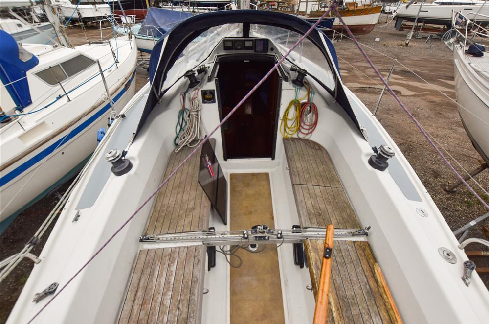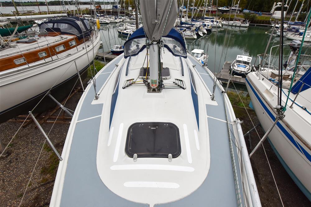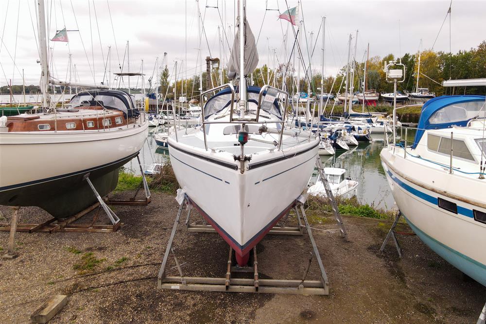 Built by Dehler Yachts in 1988 and designed by EG Van De Stat. Off white GRP hull with style stripes. Rubbing strake. White GRP superstructure with painted non-slip moulded top deck. Cast iron fin keel. Spade hung rudder. Tiller steering. Aft self-draining cockpit.