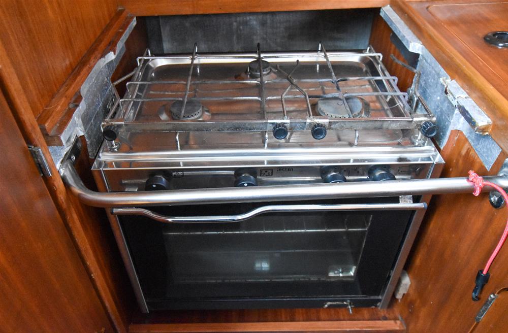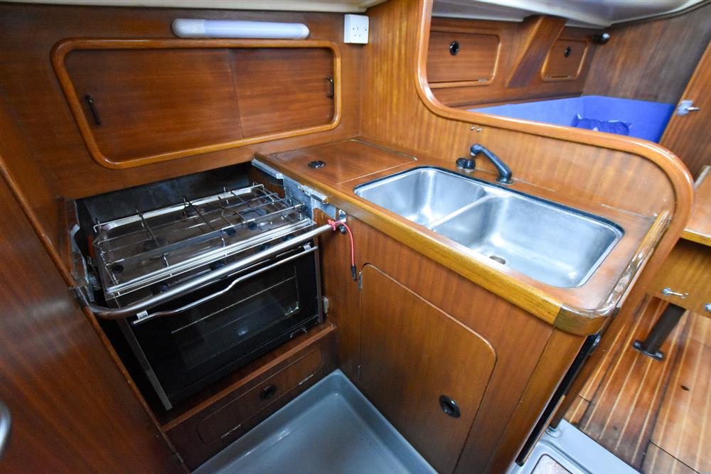 The layout offers up to six berths in three cabins with two double sleeping cabins separate from the main accommodation. Natural wood finish to bulkheads. Approx 6ft headroom. In the fore cabin, V berth with stowage under. Opening hatch to foredeck. In saloon, two settee berths. Fixed table with drop leaves. Chart table to starboard with galley opposite. Three burner gimballed gas cooker with oven. Twin stainless steel sinks with cold-water supply pressurised via electric pump. Refrigerator. Separate heads compartment with wet locker to starboard with marine toilet and wash basin. Aft cabin with double berth.