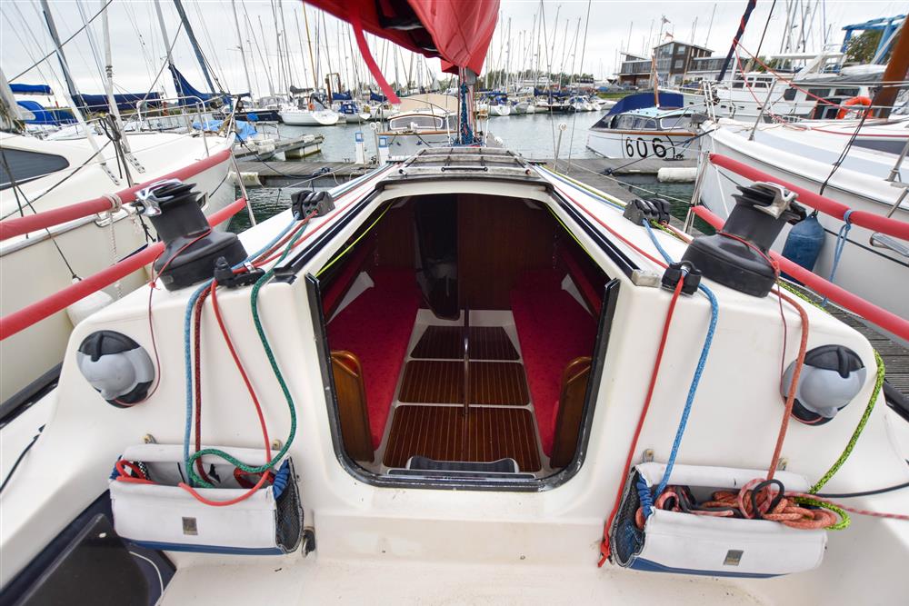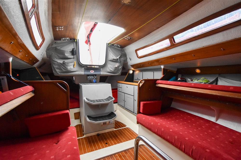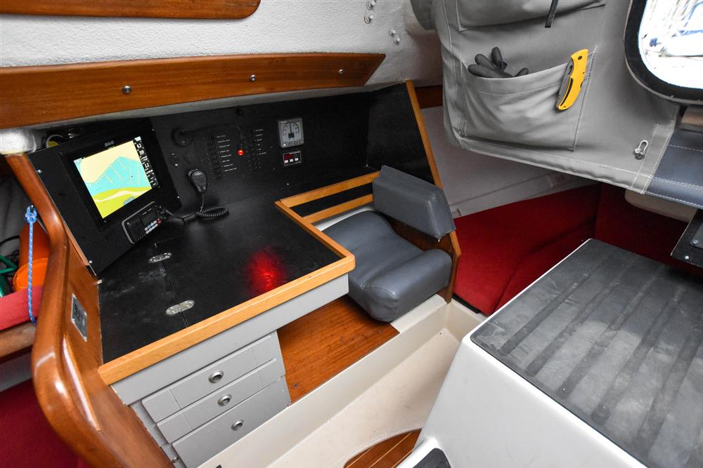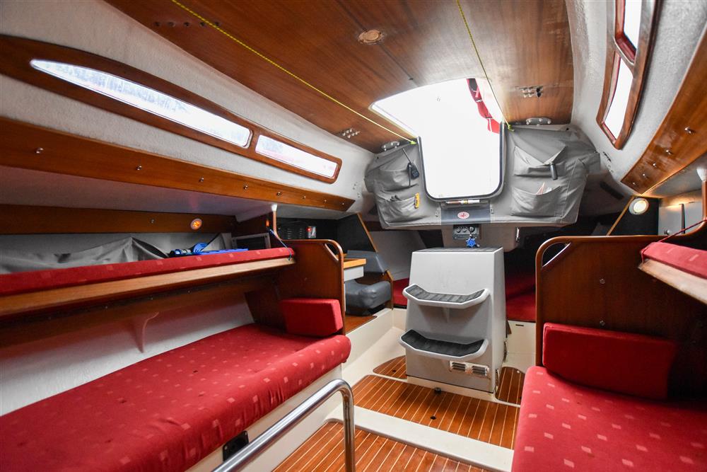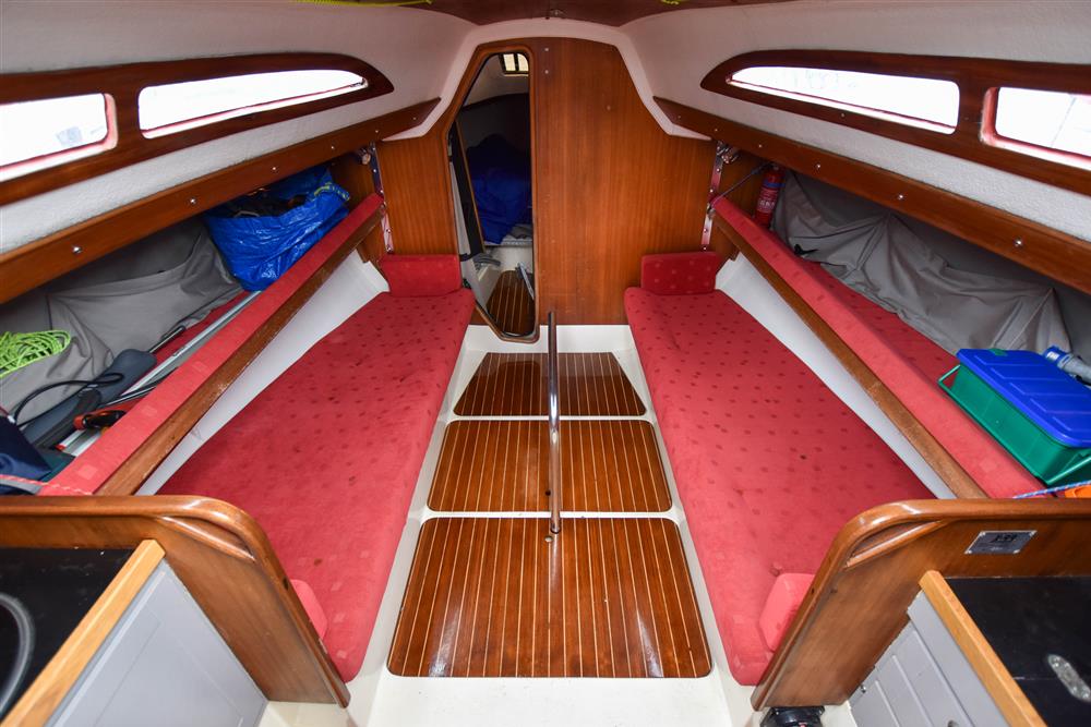 Offering up to 6 berths in a neatly finished interior, with red velour upholstery and teak & holly soleboards. Up forward, there is a double V-berth with stowage under. Jabsco marine toilet to starboard and a handy stowage shelf and locker opposite to port. Stepping aft into the saloon, there are two single settee berths to port and starboard with stowage underneath. The linear galley is to port, which was refitted in 2015 giving ample work surfaces, cupboards and drawers. Stainless steel sink unit with integrated single burner gas hob and hinged glass cover. The forward-facing chart table is opposite to starboard, giving a good size chart table with navigation equipment, electrical distribution panel, internal stowage and drawers under. Chart table seat trimmed in grey leather. Large aft berth extending across the whole area under the cockpit.