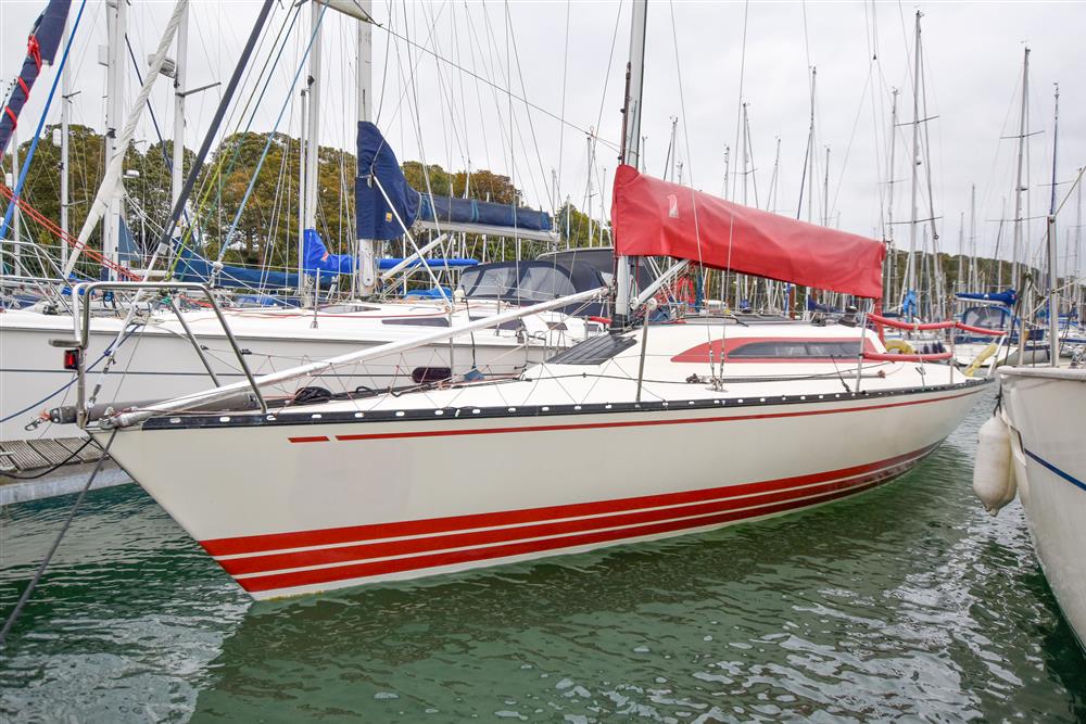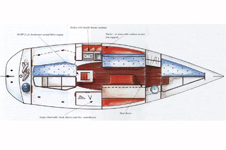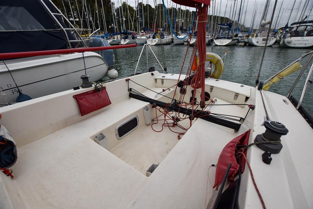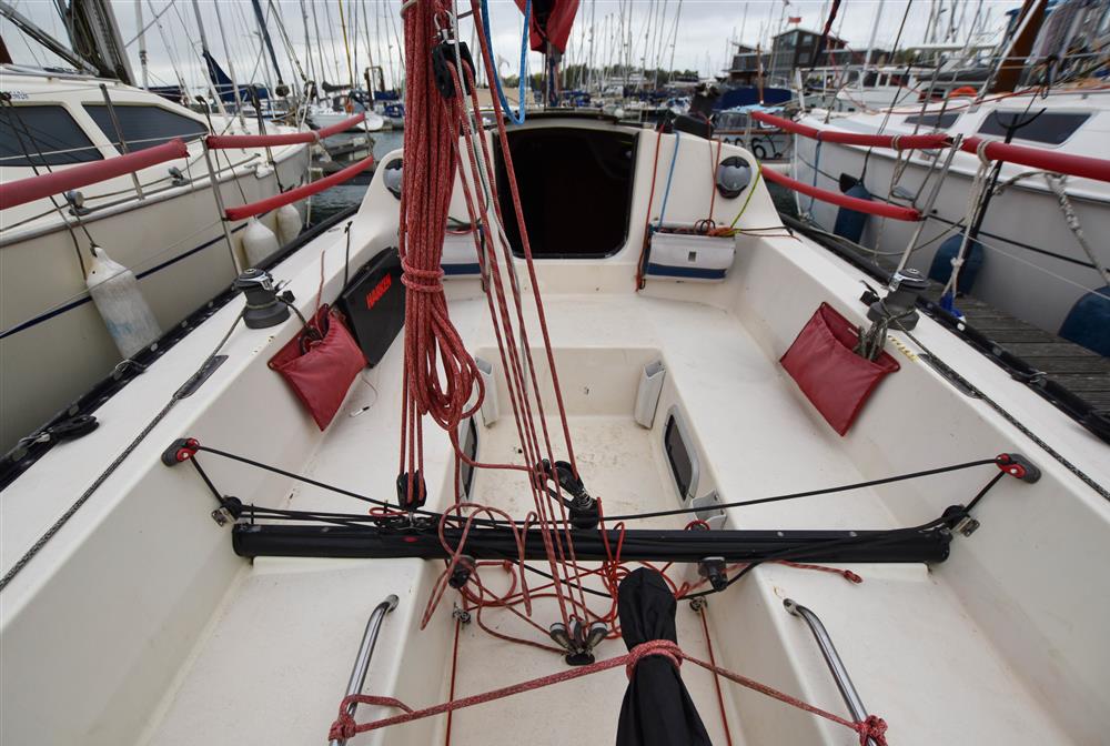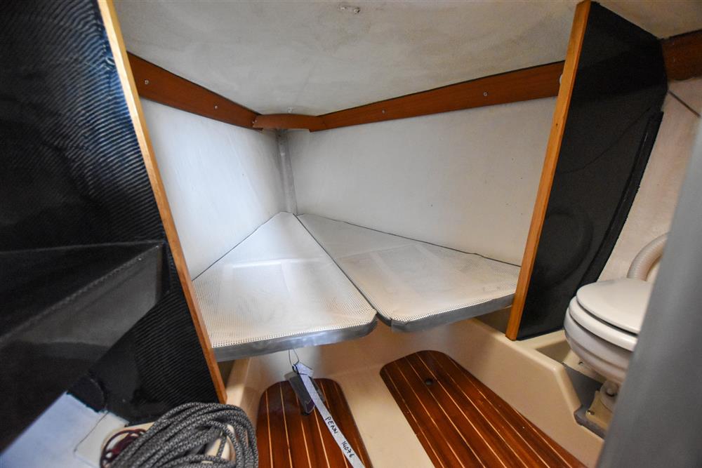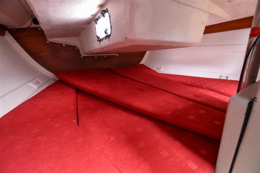 Offering up to 6 berths in a neatly finished interior, with red velour upholstery and teak & holly soleboards. Up forward, there is a double V-berth with stowage under. Jabsco marine toilet to starboard and a handy stowage shelf and locker opposite to port. Stepping aft into the saloon, there are two single settee berths to port and starboard with stowage underneath. The linear galley is to port, which was refitted in 2015 giving ample work surfaces, cupboards and drawers. Stainless steel sink unit with integrated single burner gas hob and hinged glass cover. The forward-facing chart table is opposite to starboard, giving a good size chart table with navigation equipment, electrical distribution panel, internal stowage and drawers under. Chart table seat trimmed in grey leather. Large aft berth extending across the whole area under the cockpit.