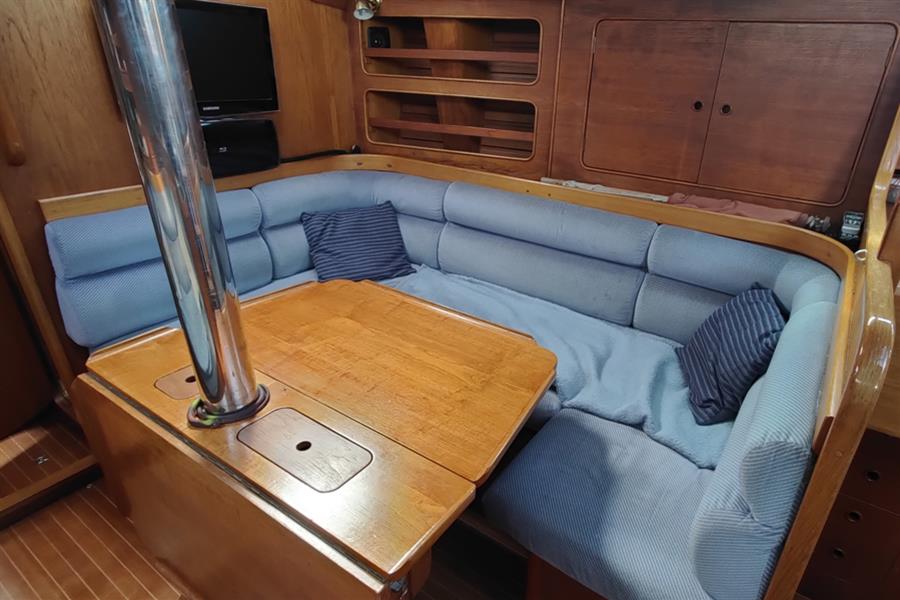 SALOON: The saloon has a large U-shaped settee to starboard, a central dining table with folding leaves and storage, and a second settee to port. Easily accessed storage is provided by a range of lockers and shelves, and two opening hatches and fixed portlights provide natural light and ventilation. Contoured cushions with deep bases and decorative teak and holly veneered flooring create a comfortable and welcoming feel.