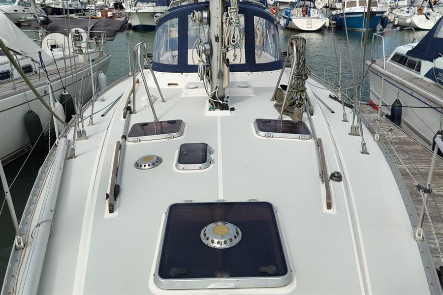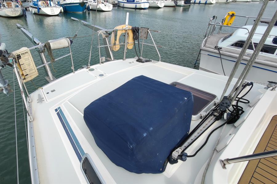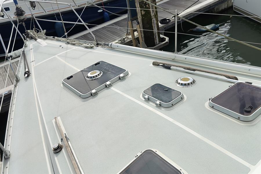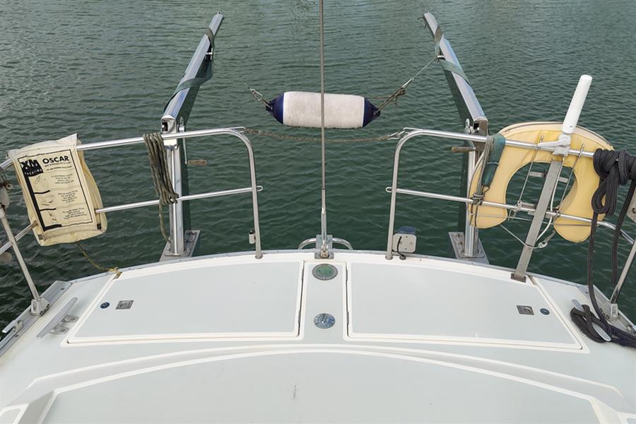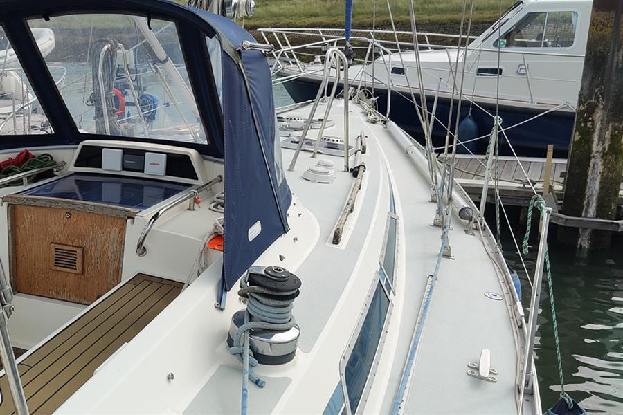 Moody 425 built by Marine Projects (Plymouth) Ltd. in October 1989 to a Bill Dixon design. White GRP hull, superstructure, and pale blue/grey decks with moulded non-slip surfaces. Cast iron shoal draft fin keel. Whitlock wheel steering to skeg-hung rudder. Teak-effect laid self-draining centre cockpit. Self-draining anchor locker. Self-draining gas locker with space for two bottles. Last antifouled in June 2024 including anodes changed.