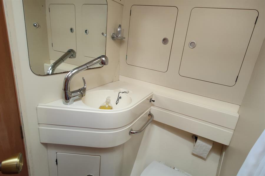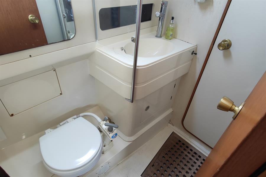 AFT HEADS: Located to port and fitted with a Jabsco marine toilet (new toilet and pipework 2024), washbasin, and separate shower area with folding screen doors, the compartment is finished with perspex and wipe-clean laminate for practicality, and has an opening portlight for ventilation. Access is either via aft of the galley or en suite access from the aft cabin.