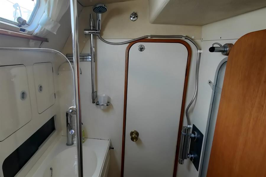 FORWARD HEADS: Separate heads compartment to starboard fitted with a marine toilet (new toilet and pipework 2024), washbasin, and shower. The compartment is finished in wipe-clean laminate surfaces with lockers for storage, an opening hatch for light and ventilation, and can be accessed both from the saloon passageway and forecabin.