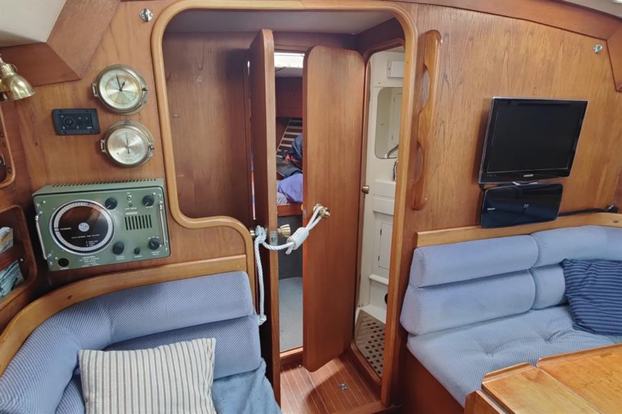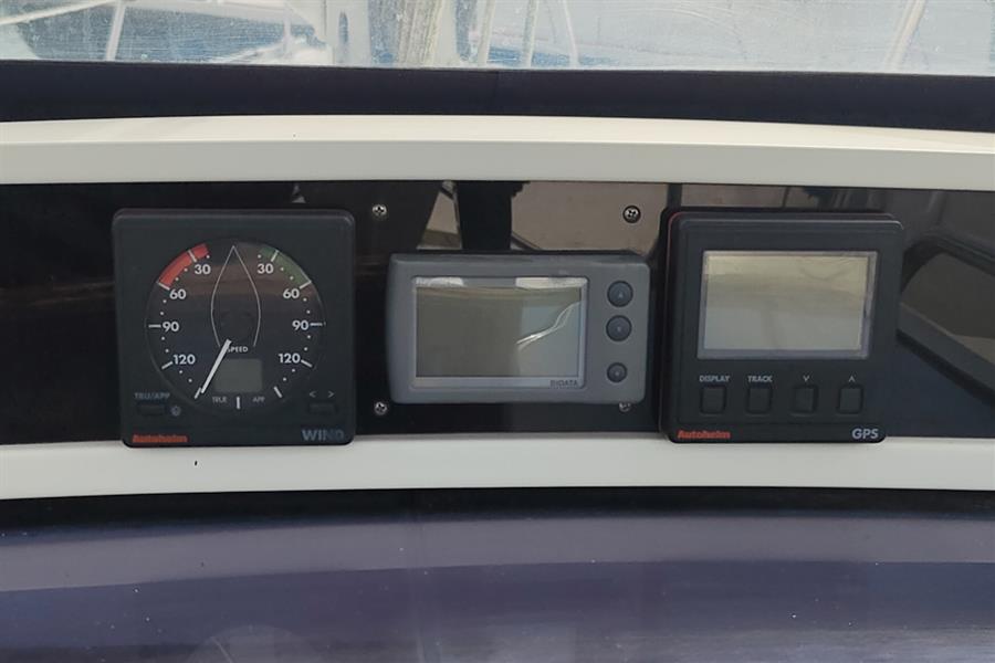 3 x 12v 135ah batteries (2 x domestic and dedicated engine all new 2024) all charged via the engine alternator. Shorepower system with ring main, automatic battery charger and immersion coil for water heating. Electrical distribution panel at chart table with breaker switches, indicator lights, battery condition, fuel, and water gauges. Battery isolator switches. Full cabin lighting throughout with reading lights in fore and aft sleeping cabins.