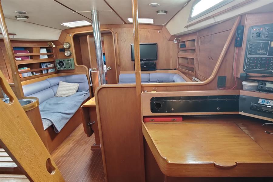 NAVIGATION AREA: To starboard is a large forward-facing chart table equipped with navigation equipment, an electrical distribution panel, chart stowage, drawers, and locker space, forward of the passageway leading to the aft cabin.